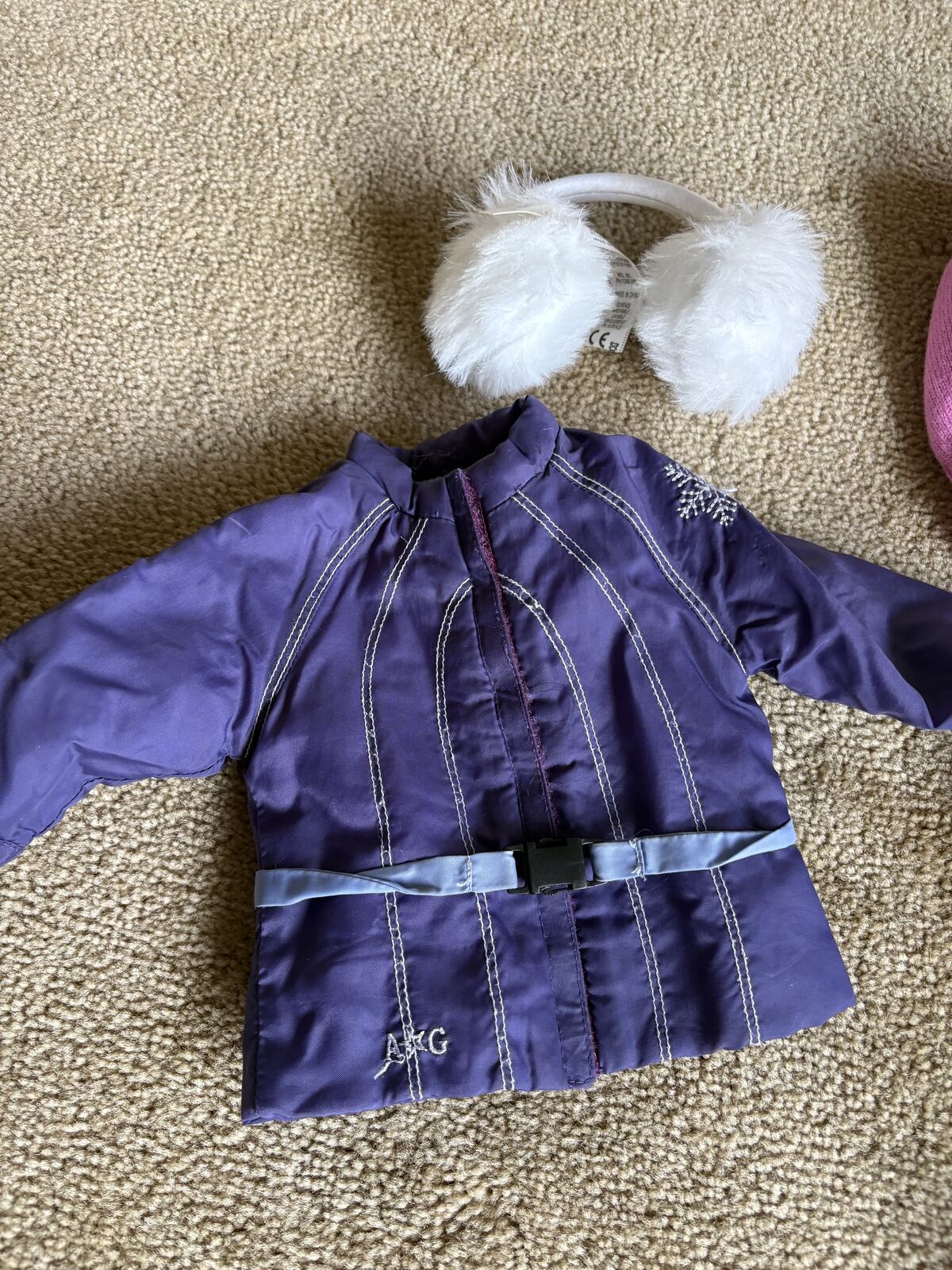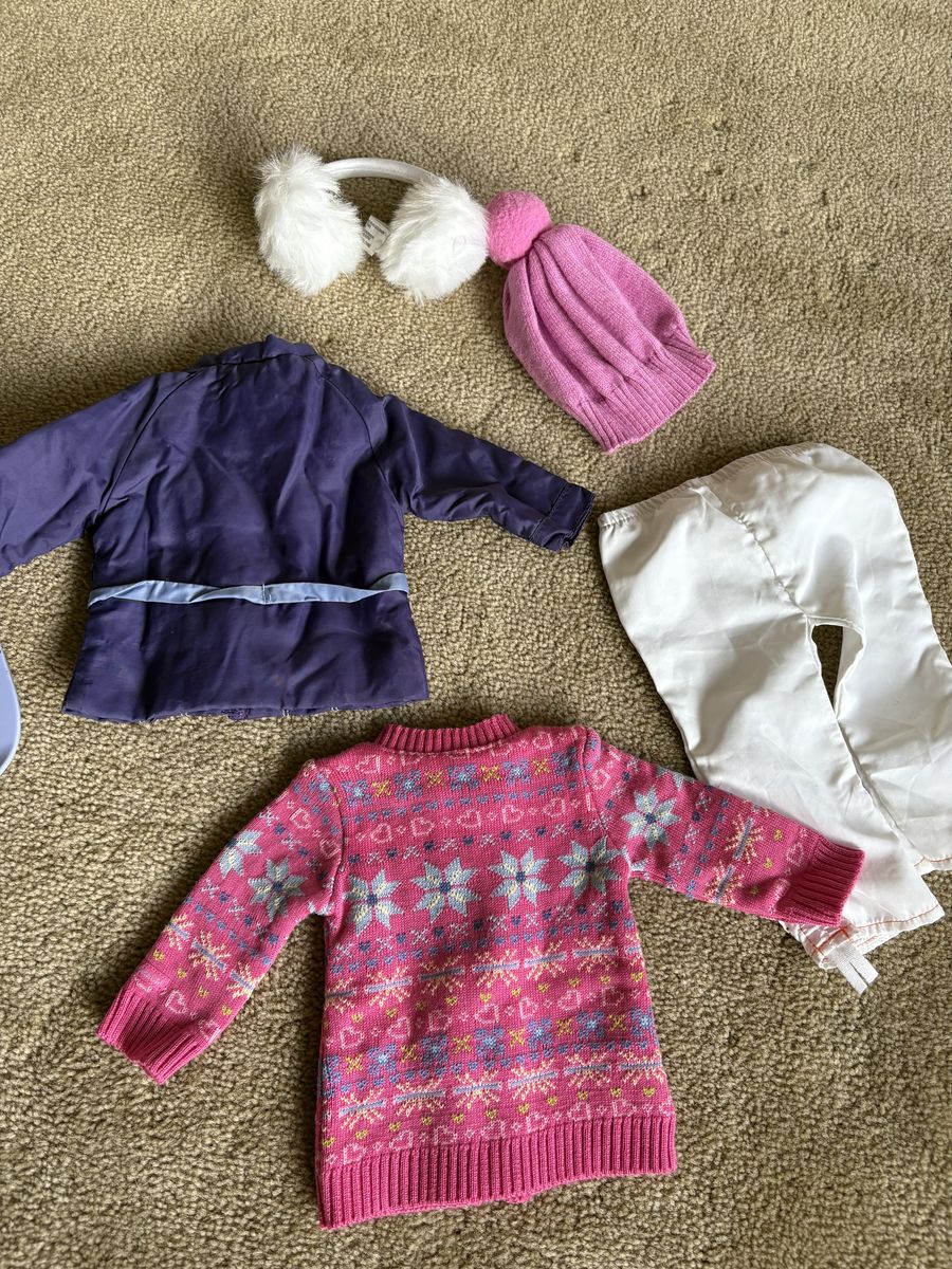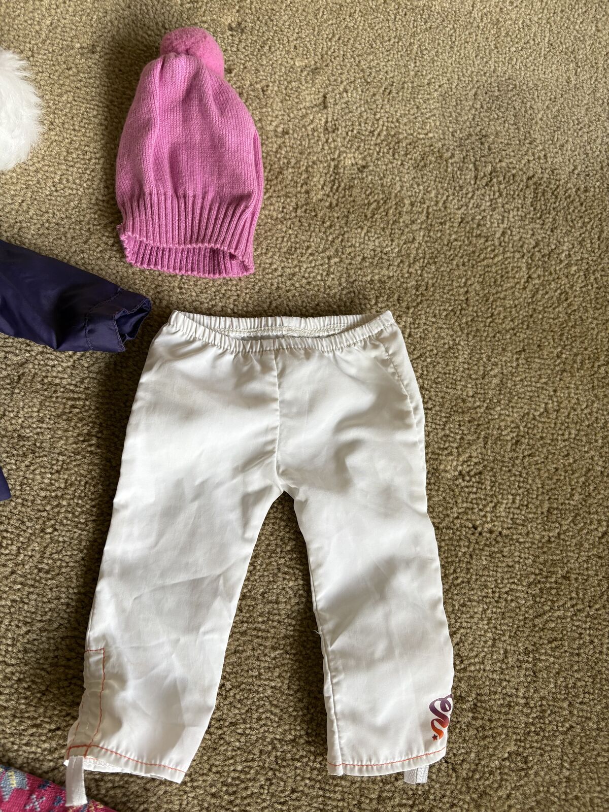 Genuine American Girl Doll Snow Set, for 18" dolls. Includes everything shown in photos: snowshoes, snowboard, poles, boots, outdoor clothing, and accessories. High quality, very good condition. Text only. Cash or Venmo.