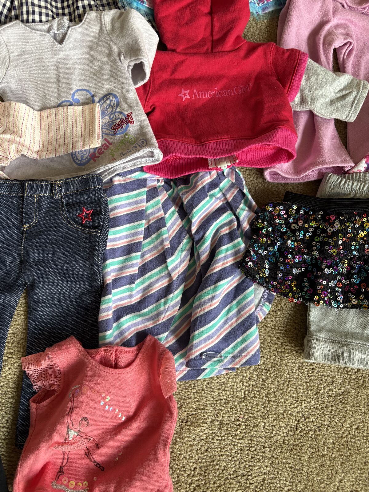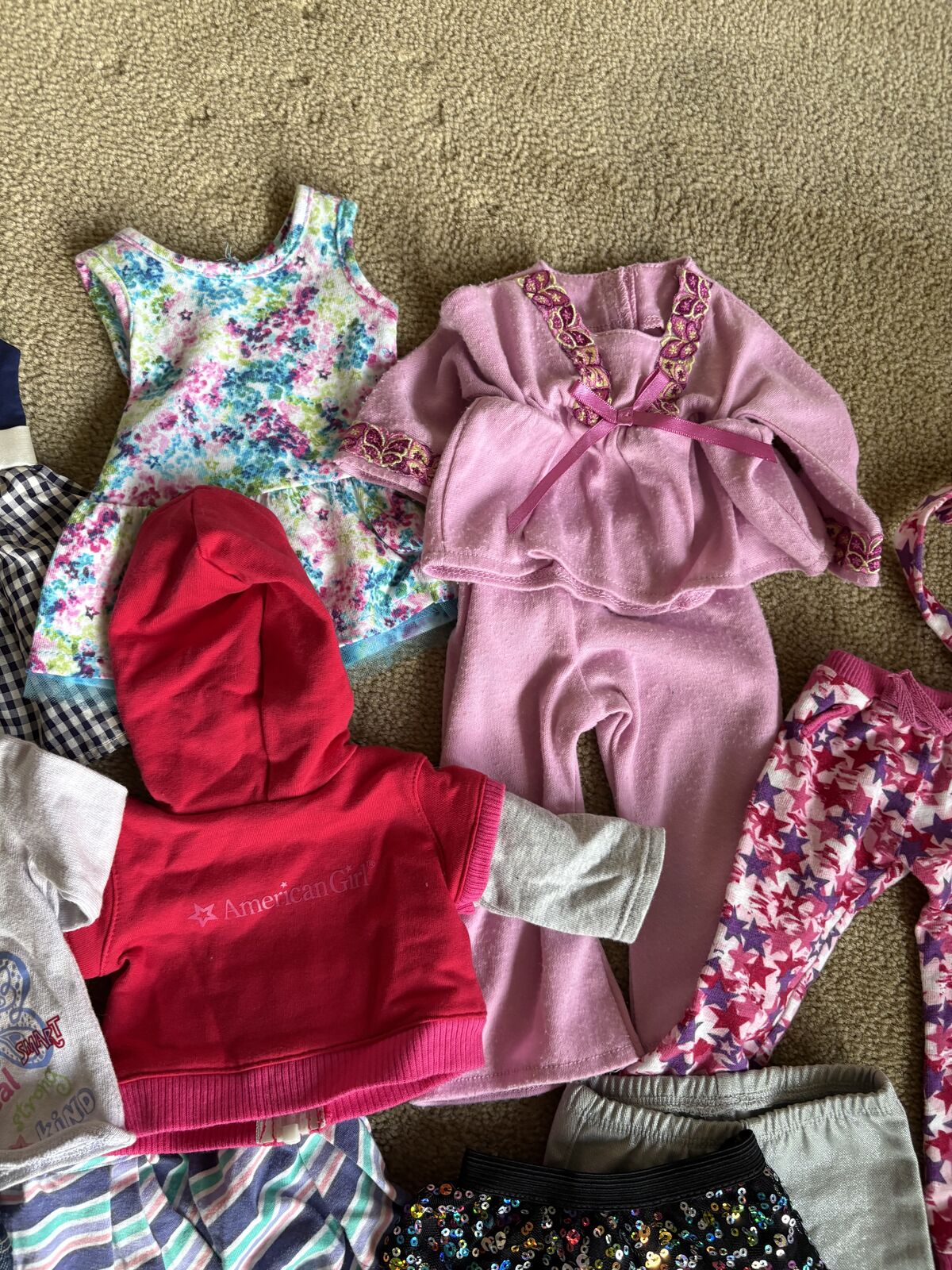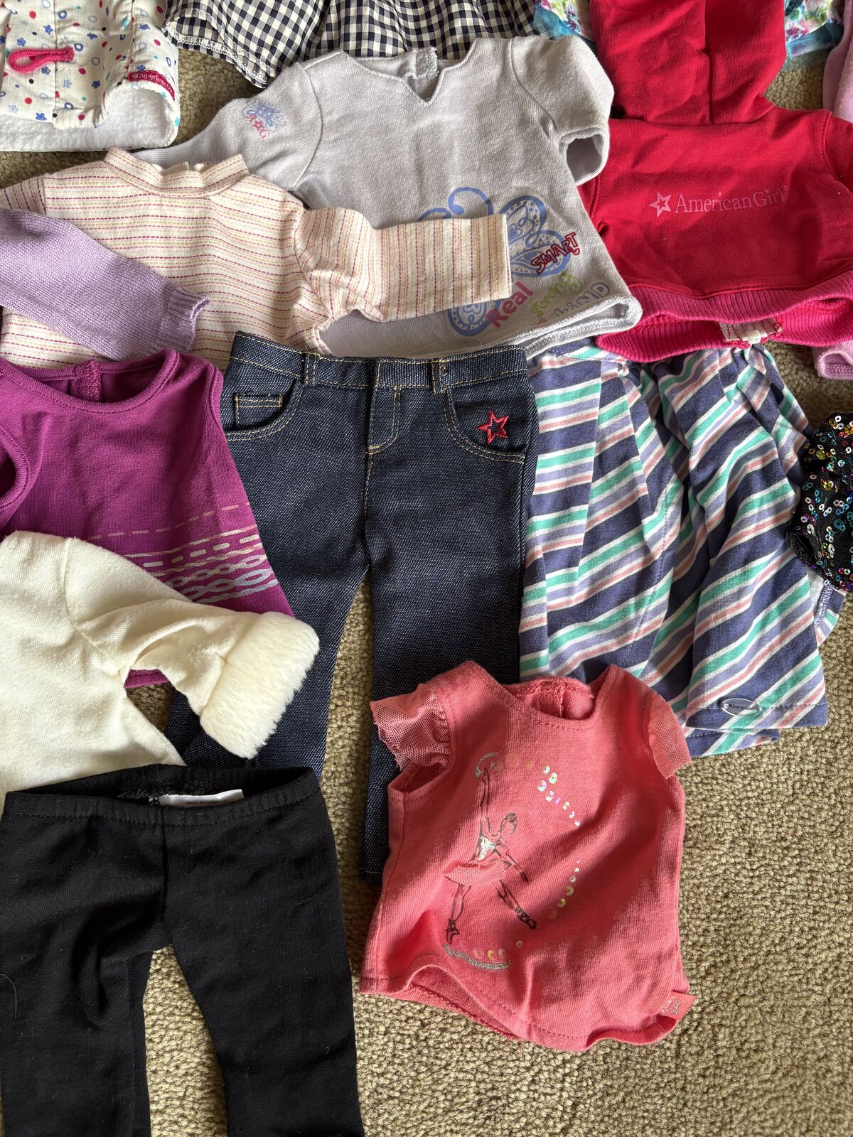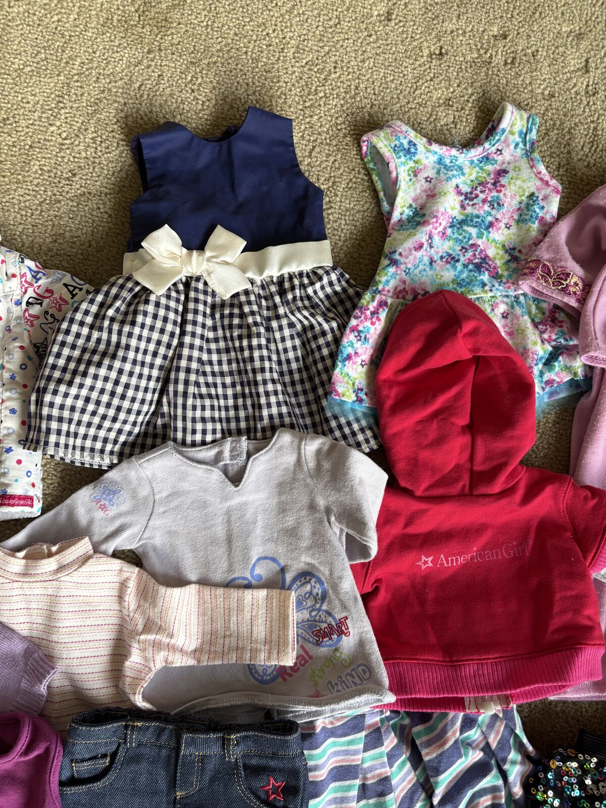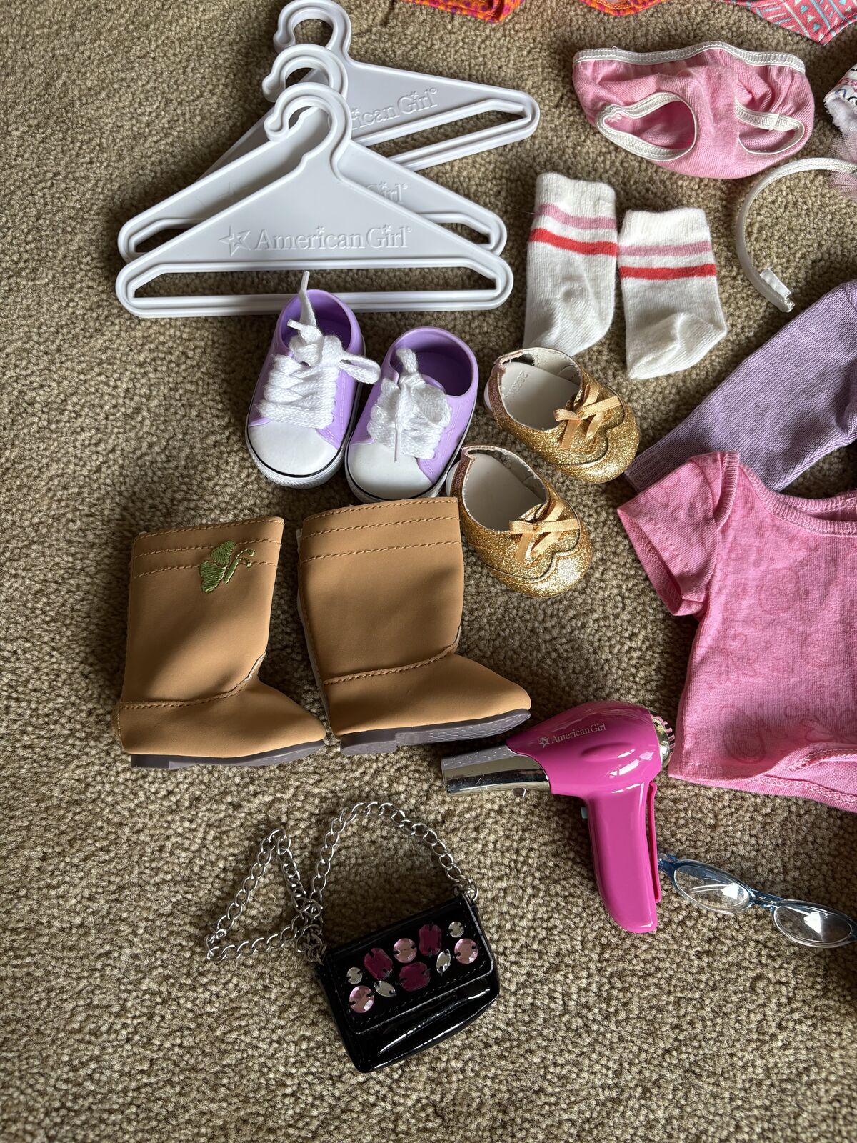 Genuine American Girl Doll Clothes and Accessories, for 18" dolls. Includes everything shown in photos: clothes, shoes, and accessories from various sets. High quality, very good condition. Text only. Cash or Venmo.