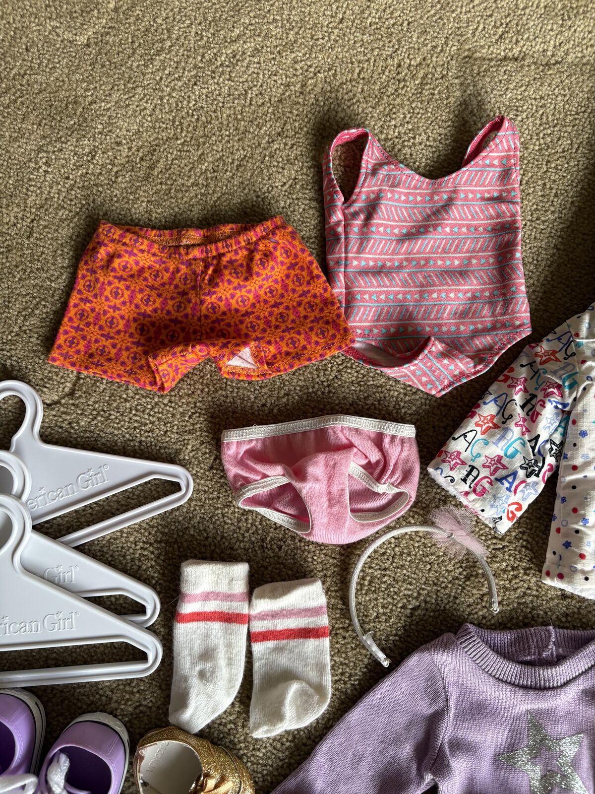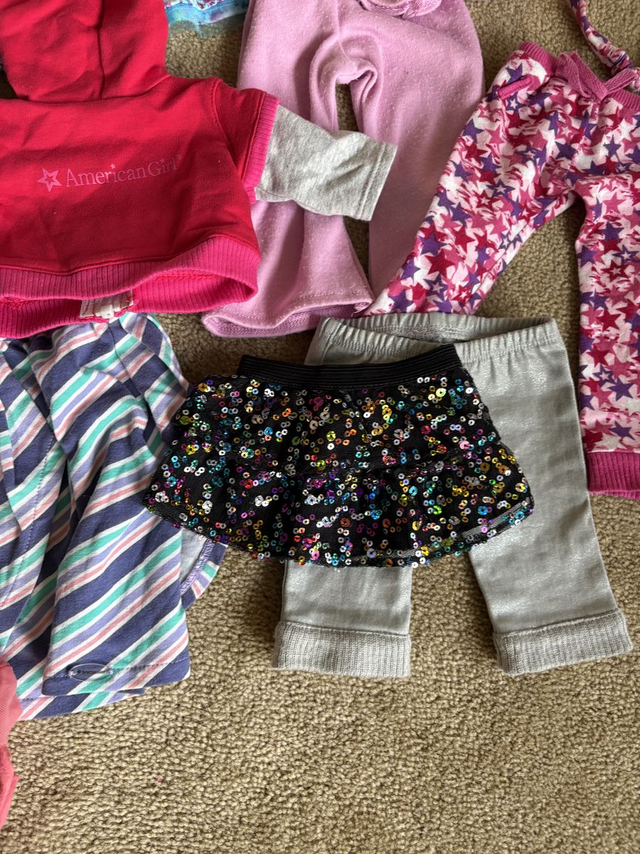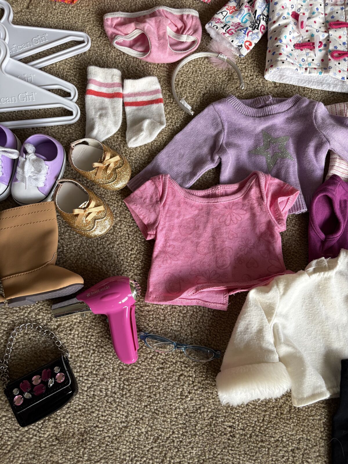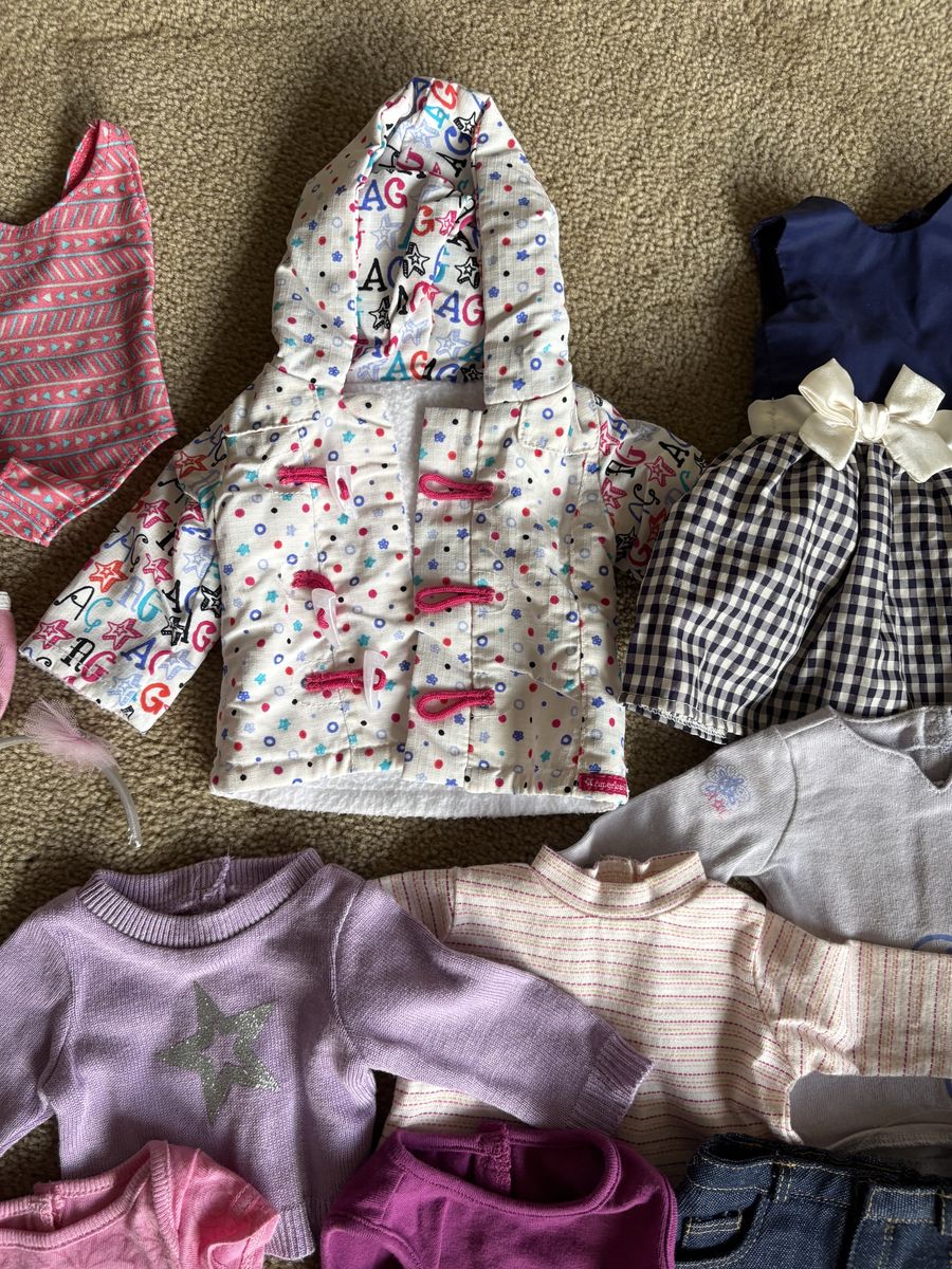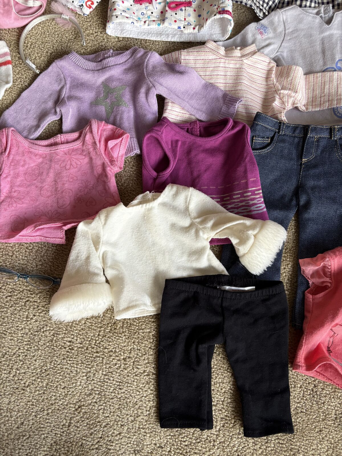 Genuine American Girl Doll Clothes and Accessories, for 18" dolls. Includes everything shown in photos: clothes, shoes, and accessories from various sets. High quality, very good condition. Text only. Cash or Venmo.