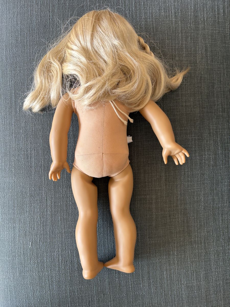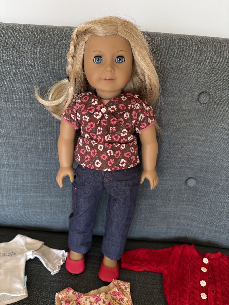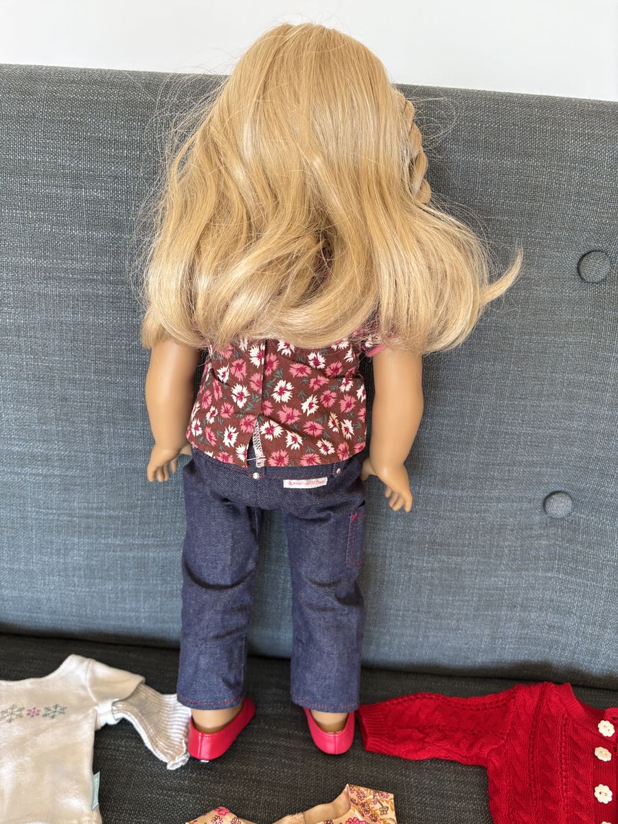 Genuine 2008 American Girl Truly Me Blonde Doll Set. Includes 18" doll with blonde hair and blue eyes, two outfits, two pairs of shoes, and pajamas. Very good condition. Text only. Cash or Venmo.