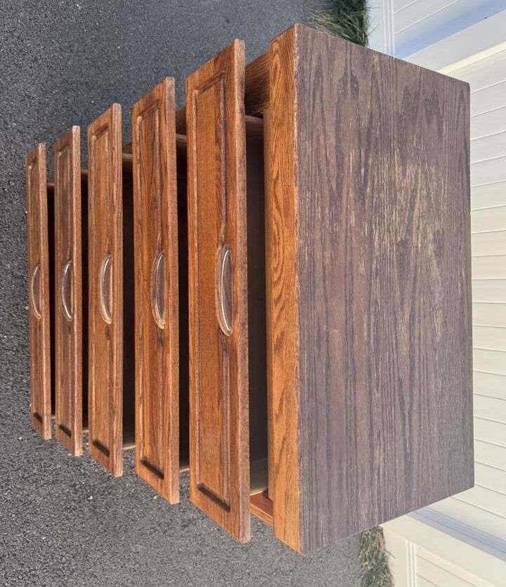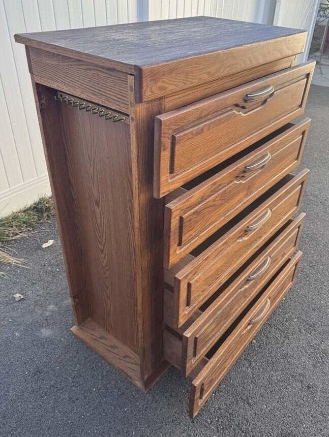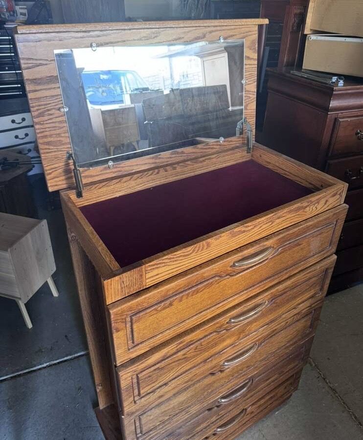 VenmoDarling dresser! Has wear but it’s so cool how the top opens and the side has a place you can hang jewelry or whatever you want. Drawers all work well. Willing to deliver for $50.