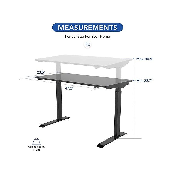 Desk Features: Electric Height adjustable table, lifting speed 25.4mm/s, rounded corners, 2-button controller, noise level below 50 dB.