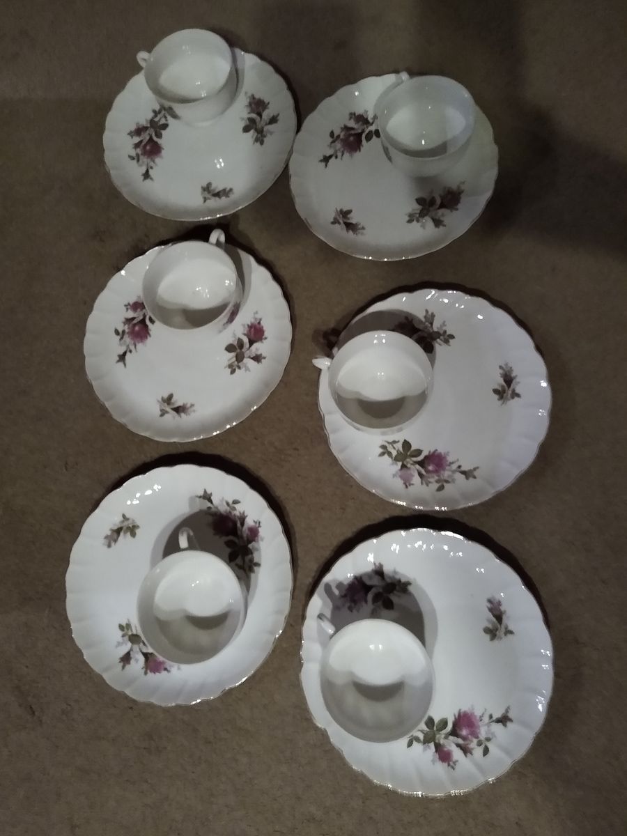 Beautiful floral pattern snack sets (also called a hostess set). Set of 6 Grantcrest brand “Royal Rose” pattern – vintage from the 1950’s. No chips or cracks. Each plate has an indentation to hold a cup. Perfect for hosting bunco or book club. 6 sets for $70 OBO. Cash only please.