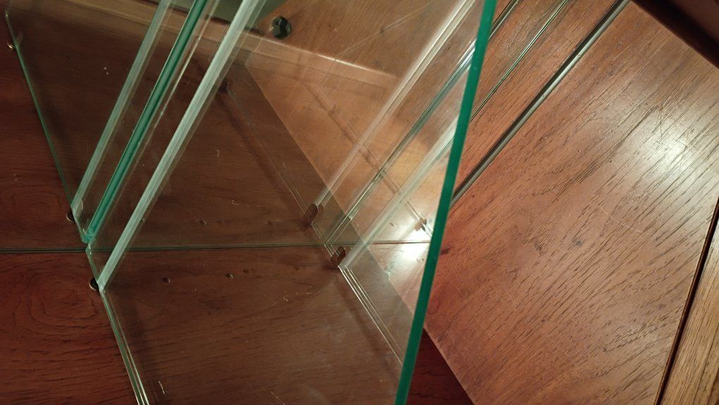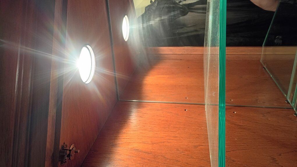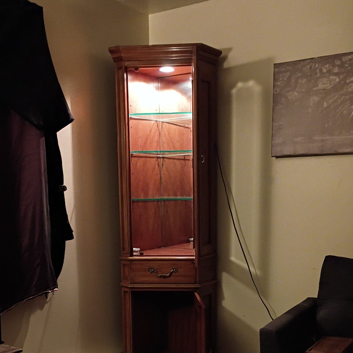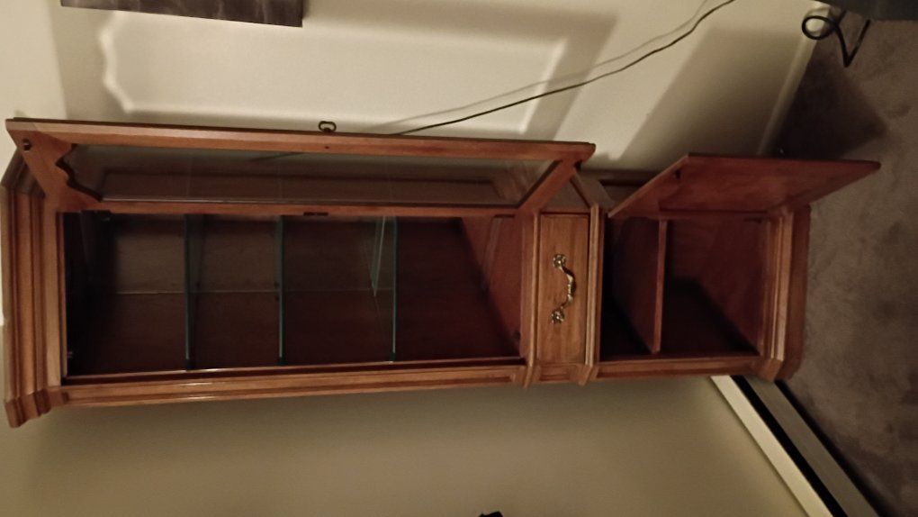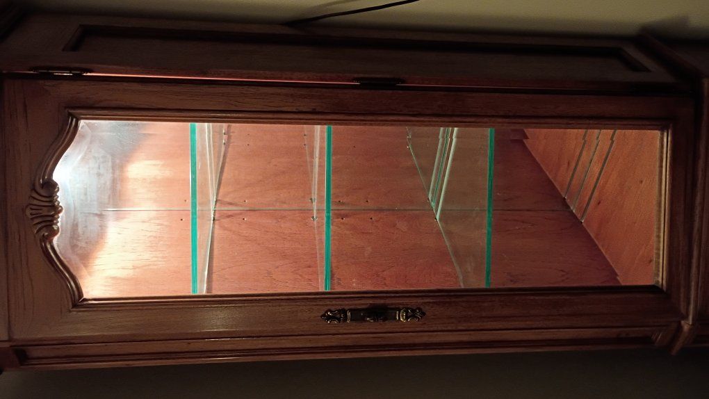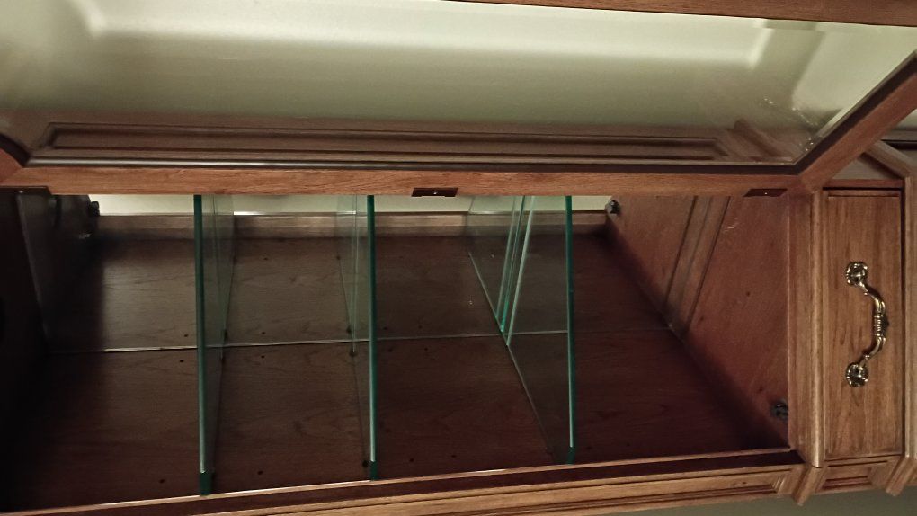 PayPalBeautiful wood curio cabinet has 3 glass shelves, with plate grooves, in top lighted cabinet & bottom cabinet has one shelf. All shelves are adjustable. Light is electric & plugs into the wall.