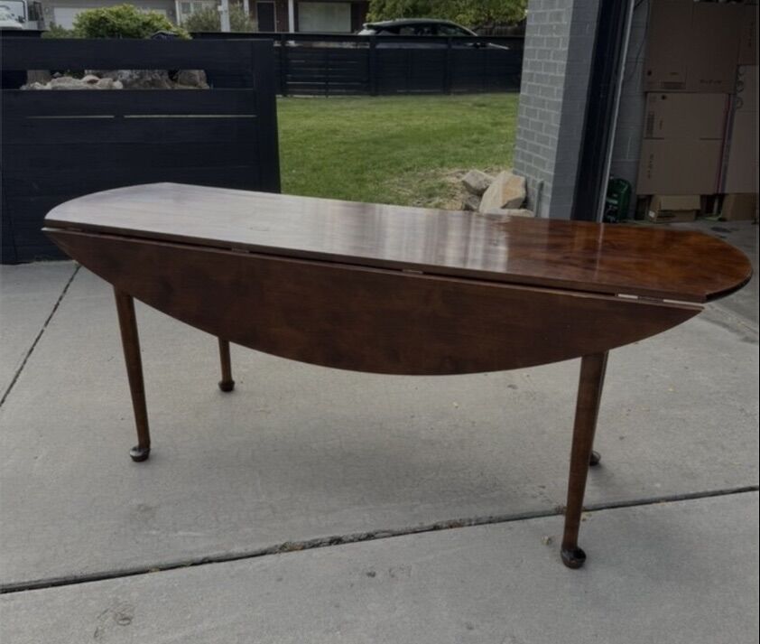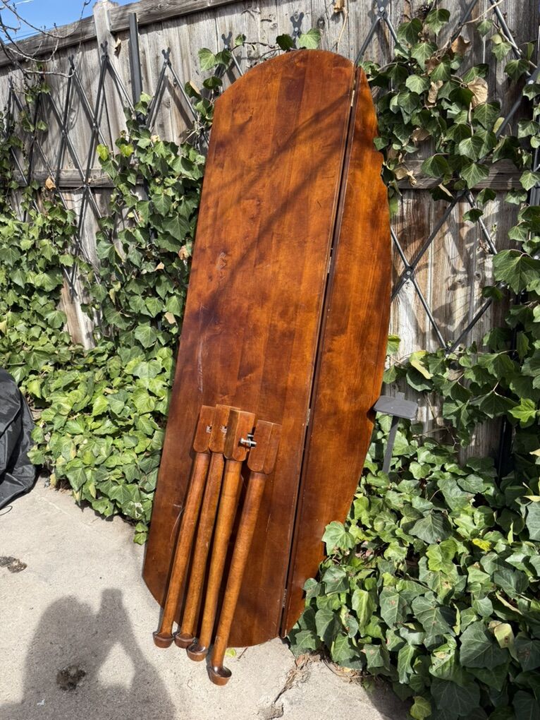 VenmoVintage Solid Wood Drop-Leaf Table – 70” Long Beautiful vintage drop-leaf table made of solid wood. Measures 70 inches x 45” when fully extended and 70” x 23” when folded - perfect for dining rooms, kitchens. Condition: Normal wear consistent with age (minor surface marks and character that add to its vintage charm). Structurally solid and sturdy. The legs have been carefully removed for easy transport and storage. All hardware is included, and reassembly is straightforward. Great for entertaining—expand it when guests arrive, then fold it down to save space. Text if interested