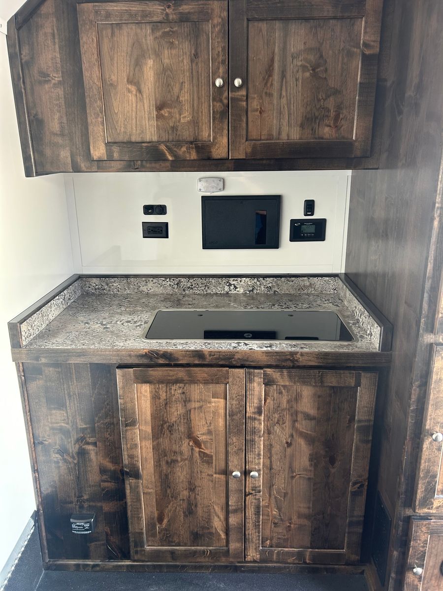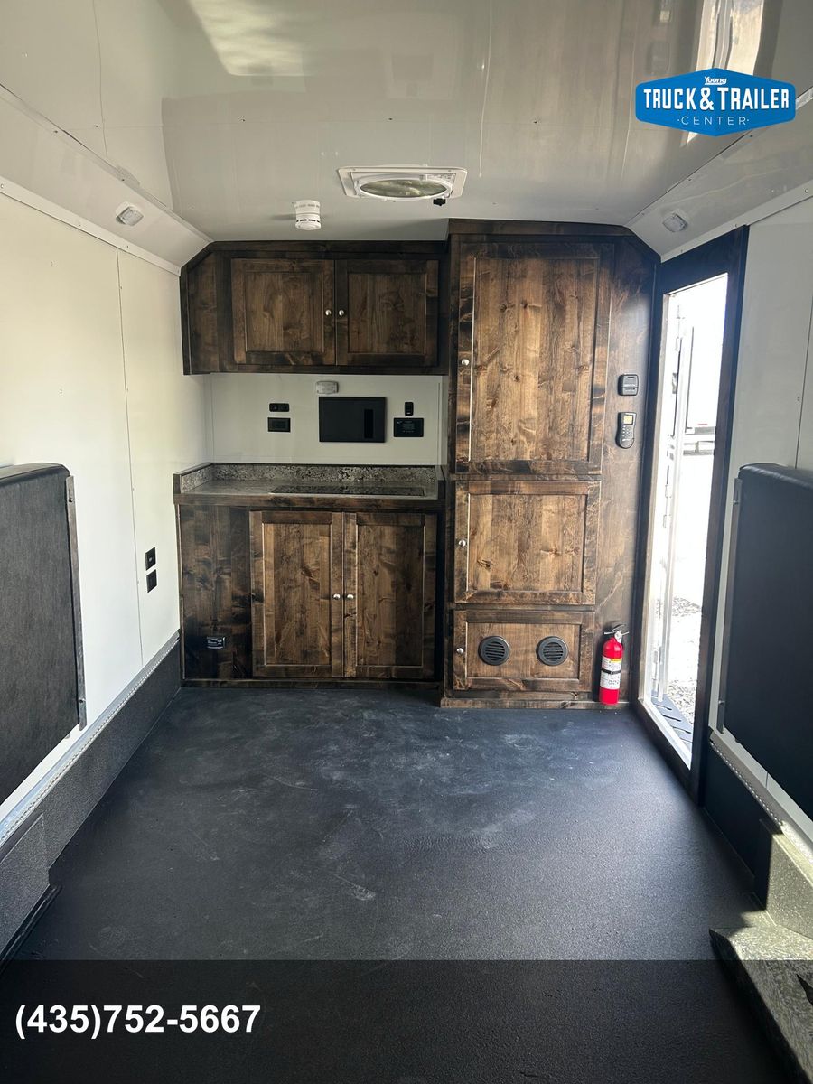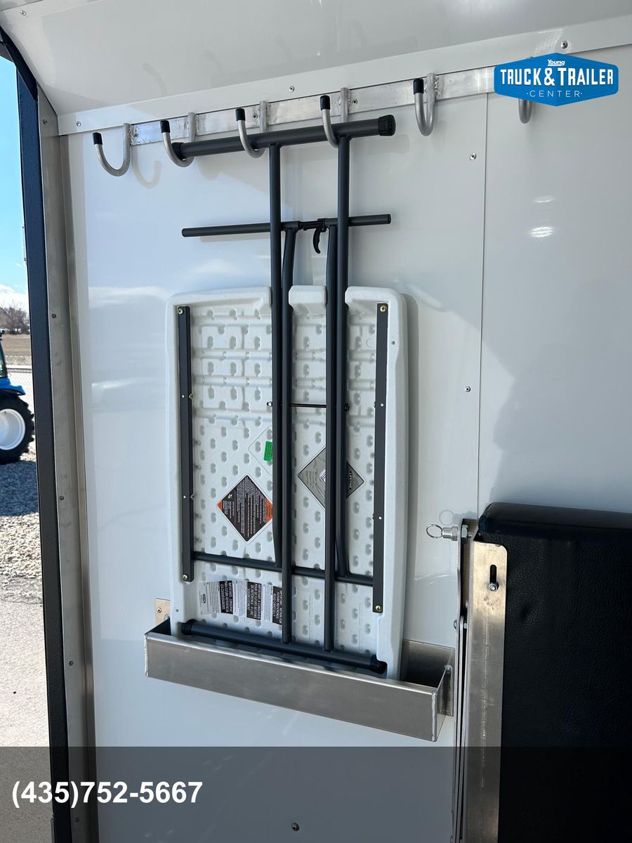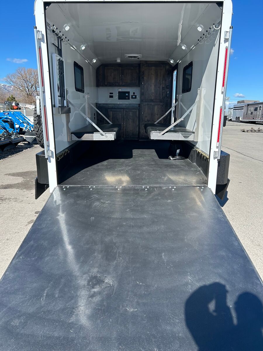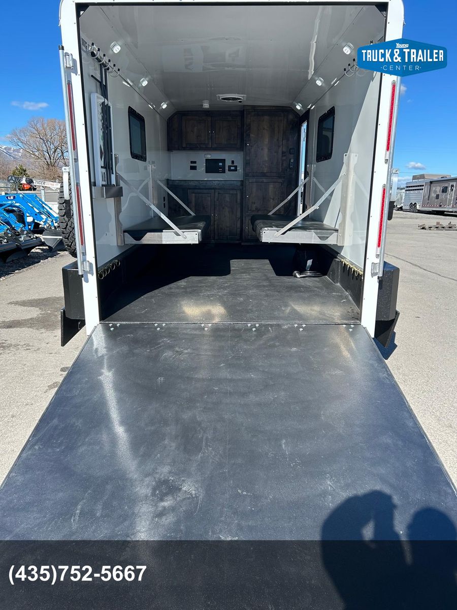Galvanized structural tubing in walls and floor .040 aluminum one piece roof skin / aluminum roof bows on 24” centers Wall Posts on 24” centers / floor cross-members on 16” centers 2’ Dove tail Rear ramp with spring assist 2 5/16” Adjustable coupler 8 year structural warranty and 2 year hitch to bumper warranty .050 Aluminum exterior skins Lower panel-Rubber vortex spray lined side walls & front Vortex spray lined HD fenders, running boards and tongue Rear drop leg jacks LP Quick connect by mandoor Enclosed Storage tongue box with dual doors Spare tire / gas can rack Man door on driver side 1 - 12v deep cycle battery Battery charger/ tender with exterior plug Exterior L.E.D. porch lights interior L.E.D. dome lights L.E.D. marker / tail lights 2000 watt Samlex Inverter Lined and insulated walls and ceiling with white aluminum sheeting or wall paneling. Vortex sprayed flooring 30” HD mandoor with frame-less window• 2 - Frame-less picture windows Crank up Camper vent 6 Recessed tie downs 2 Drop down cots 10 Coat hooks 2 rows of aluminum versa track on floor Cabinet w/ recessed 2-burner stove & sink, overhead cabinet, wardrobe closet(Wood or Aluminum cabinet option) 20 Gallon water tank 1 - 20# propane tank LP Quick connect under cabinet• 2000 watt inverter 4 - 12v USB plugs 2 - 12v plug