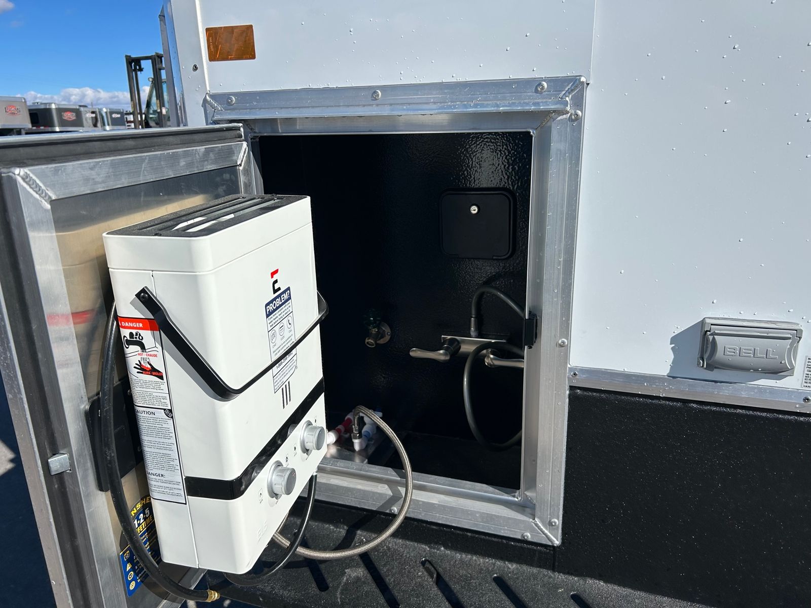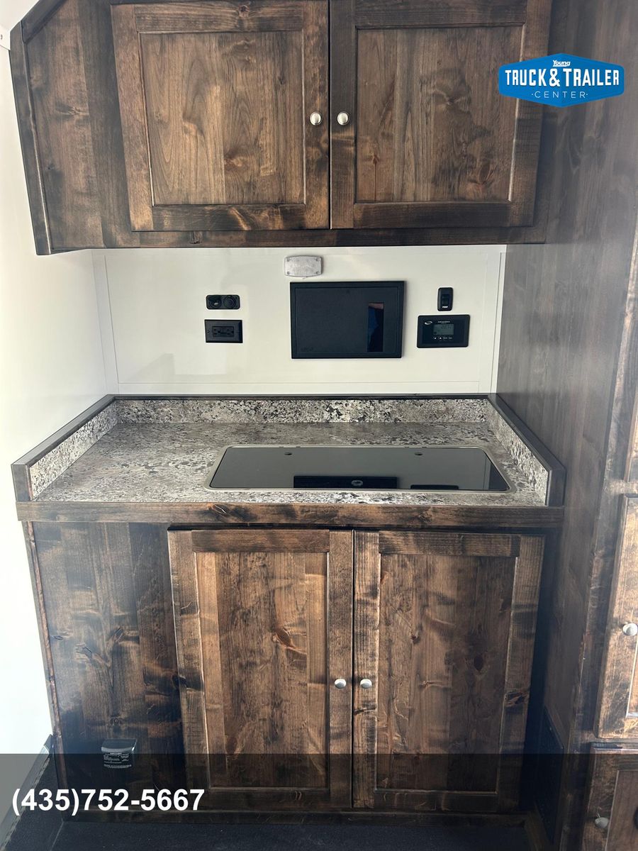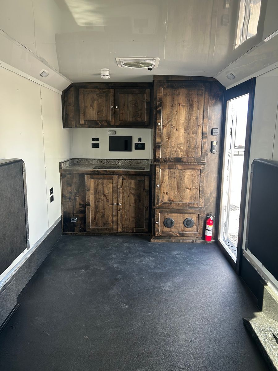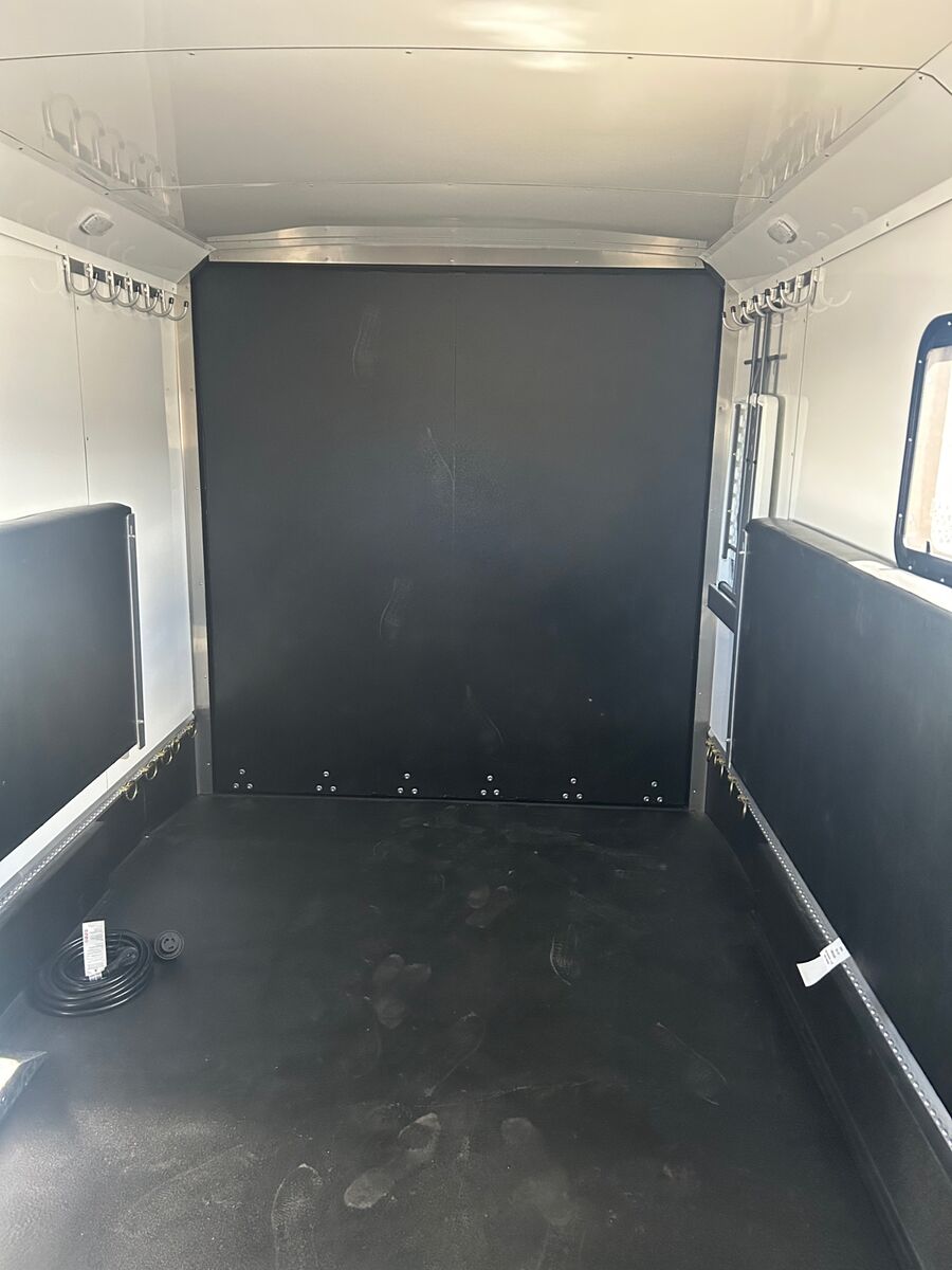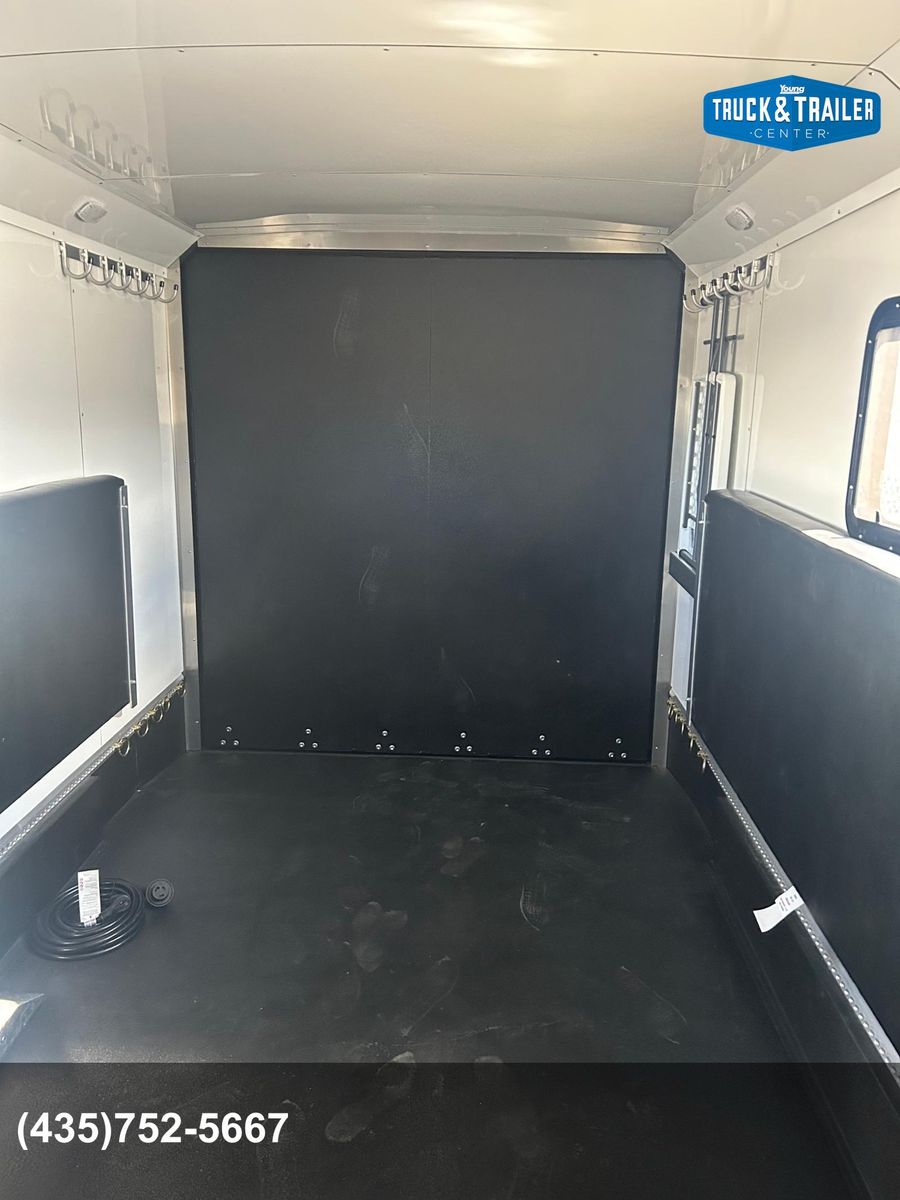 Galvanized structural tubing in walls and floor .040 aluminum one piece roof skin / aluminum roof bows on 24” centers Wall Posts on 24” centers / floor cross-members on 16” centers 2’ Dove tail Rear ramp with spring assist 2 5/16” Adjustable coupler 8 year structural warranty and 2 year hitch to bumper warranty .050 Aluminum exterior skins Lower panel-Rubber vortex spray lined side walls & front Vortex spray lined HD fenders, running boards and tongue Rear drop leg jacks LP Quick connect by mandoor Enclosed Storage tongue box with dual doors Spare tire / gas can rack Man door on driver side 1 - 12v deep cycle battery Battery charger/ tender with exterior plug Exterior L.E.D. porch lights interior L.E.D. dome lights L.E.D. marker / tail lights 2000 watt Samlex Inverter Lined and insulated walls and ceiling with white aluminum sheeting or wall paneling. Vortex sprayed flooring 30” HD mandoor with frame-less window• 2 - Frame-less picture windows Crank up Camper vent 6 Recessed tie downs 2 Drop down cots 10 Coat hooks 2 rows of aluminum versa track on floor Cabinet w/ recessed 2-burner stove & sink, overhead cabinet, wardrobe closet(Wood or Aluminum cabinet option) 20 Gallon water tank 1 - 20# propane tank LP Quick connect under cabinet• 2000 watt inverter 4 - 12v USB plugs 2 - 12v plug