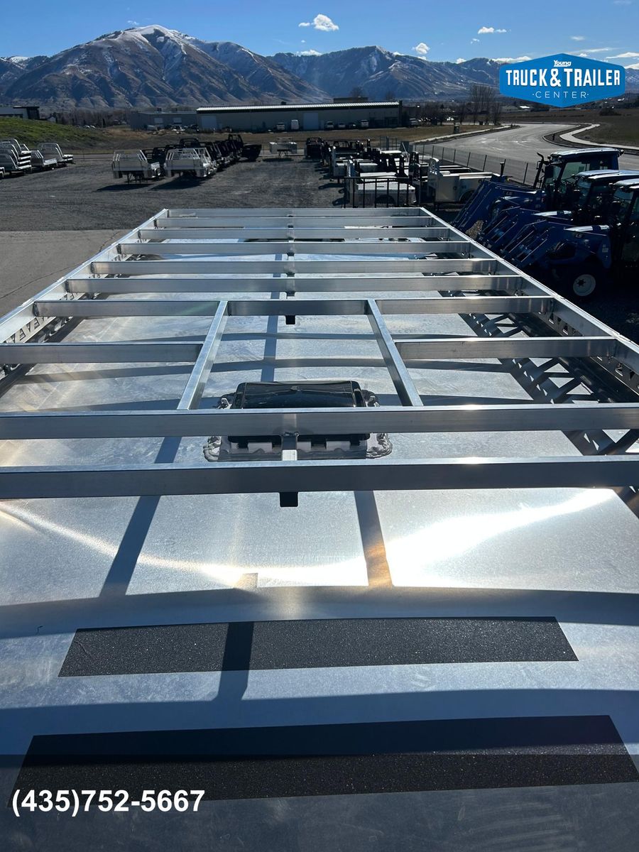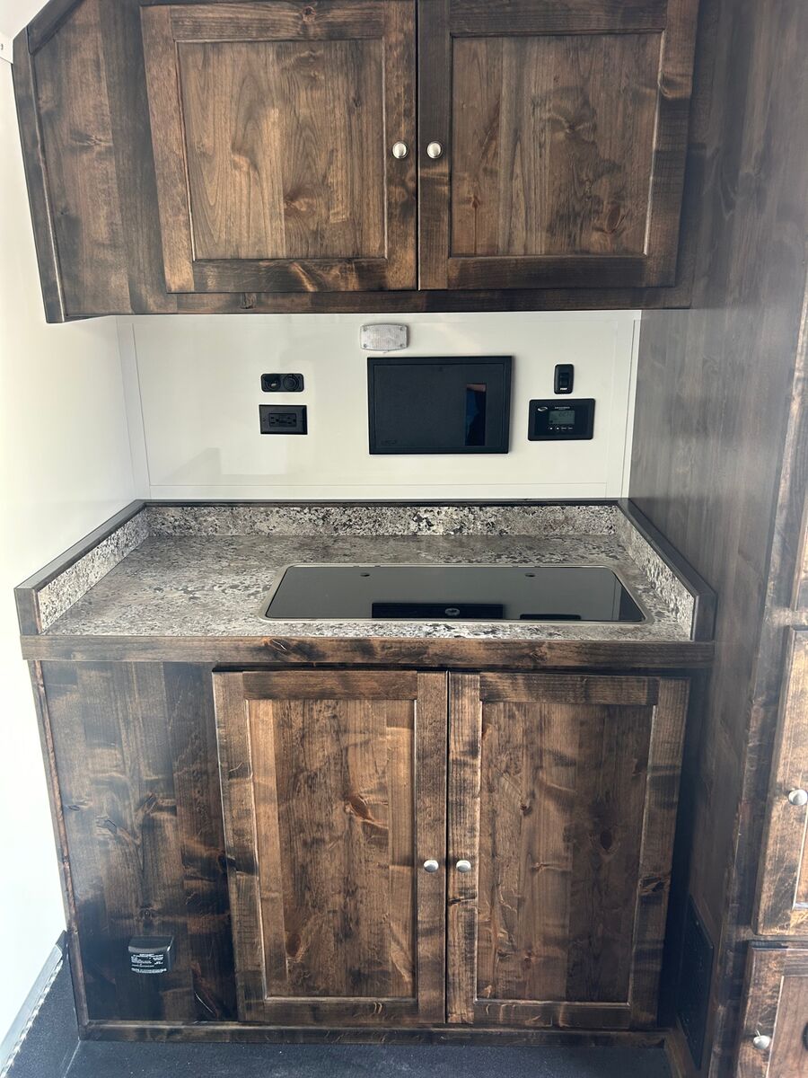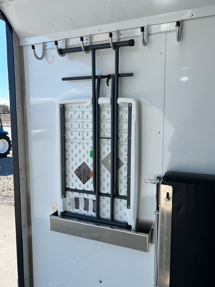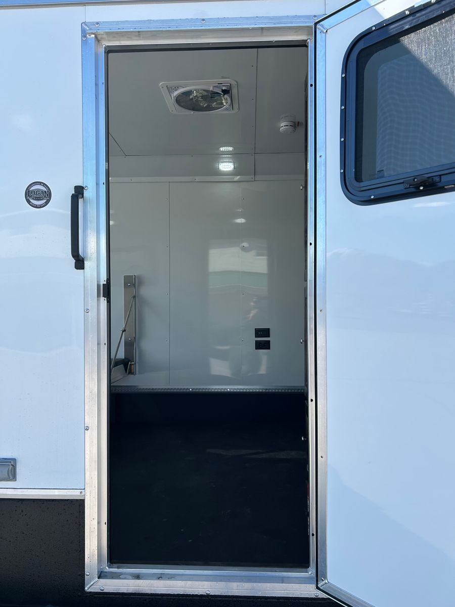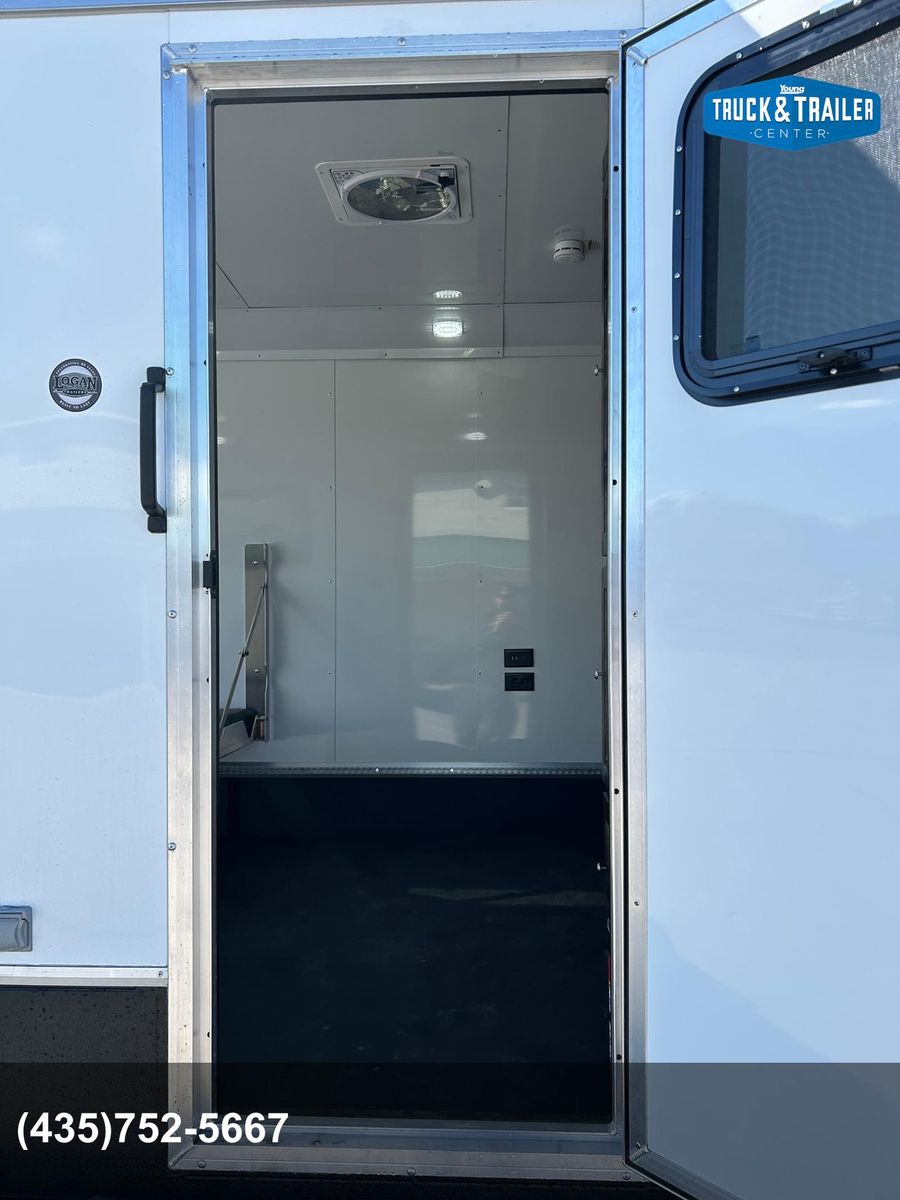 Galvanized structural tubing in walls and floor .040 aluminum one piece roof skin / aluminum roof bows on 24” centers Wall Posts on 24” centers / floor cross-members on 16” centers 2’ Dove tail Rear ramp with spring assist 2 5/16” Adjustable coupler 8 year structural warranty and 2 year hitch to bumper warranty .050 Aluminum exterior skins Lower panel-Rubber vortex spray lined side walls & front Vortex spray lined HD fenders, running boards and tongue Rear drop leg jacks LP Quick connect by mandoor Enclosed Storage tongue box with dual doors Spare tire / gas can rack Man door on driver side 1 - 12v deep cycle battery Battery charger/ tender with exterior plug Exterior L.E.D. porch lights interior L.E.D. dome lights L.E.D. marker / tail lights 2000 watt Samlex Inverter Lined and insulated walls and ceiling with white aluminum sheeting or wall paneling. Vortex sprayed flooring 30” HD mandoor with frame-less window• 2 - Frame-less picture windows Crank up Camper vent 6 Recessed tie downs 2 Drop down cots 10 Coat hooks 2 rows of aluminum versa track on floor Cabinet w/ recessed 2-burner stove & sink, overhead cabinet, wardrobe closet(Wood or Aluminum cabinet option) 20 Gallon water tank 1 - 20# propane tank LP Quick connect under cabinet• 2000 watt inverter 4 - 12v USB plugs 2 - 12v plug