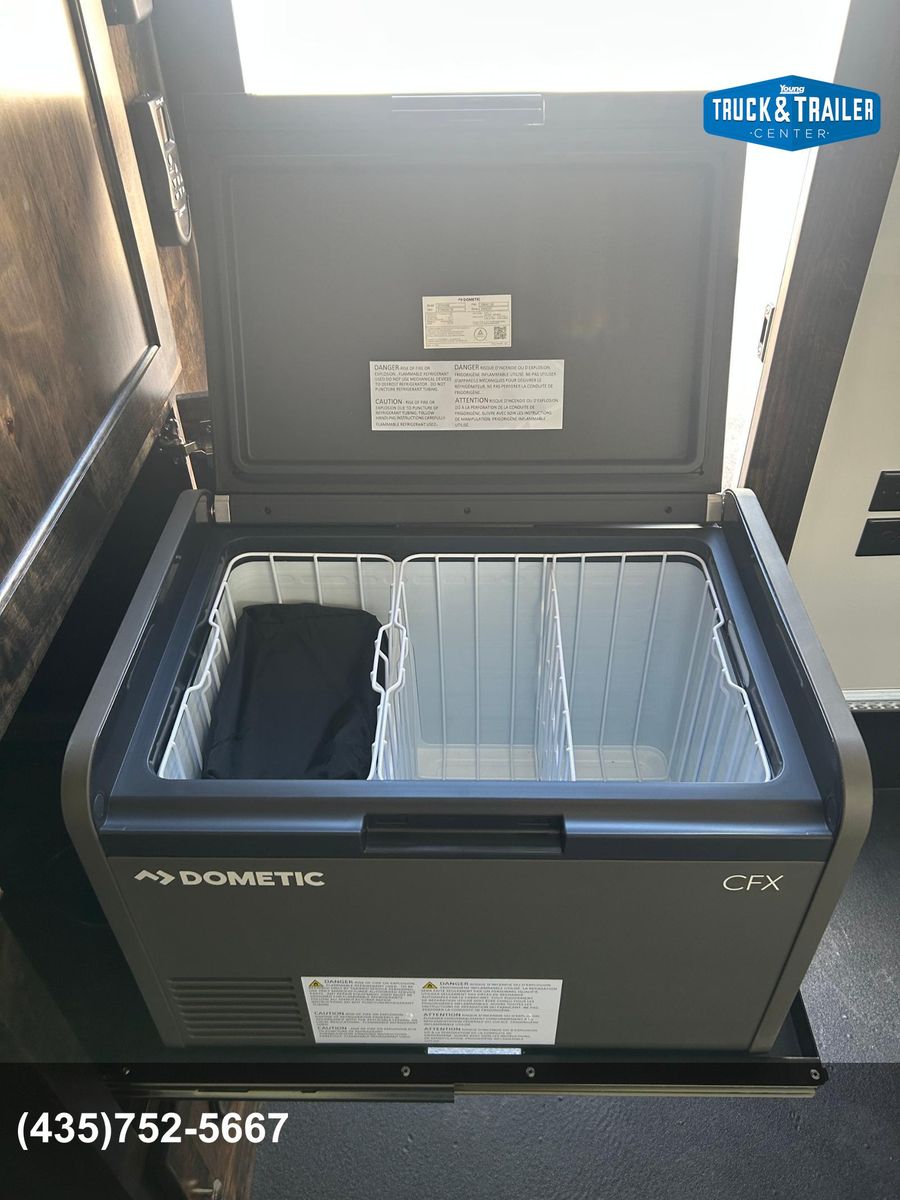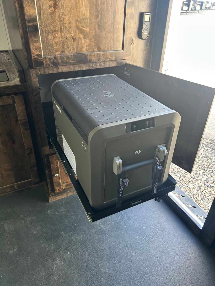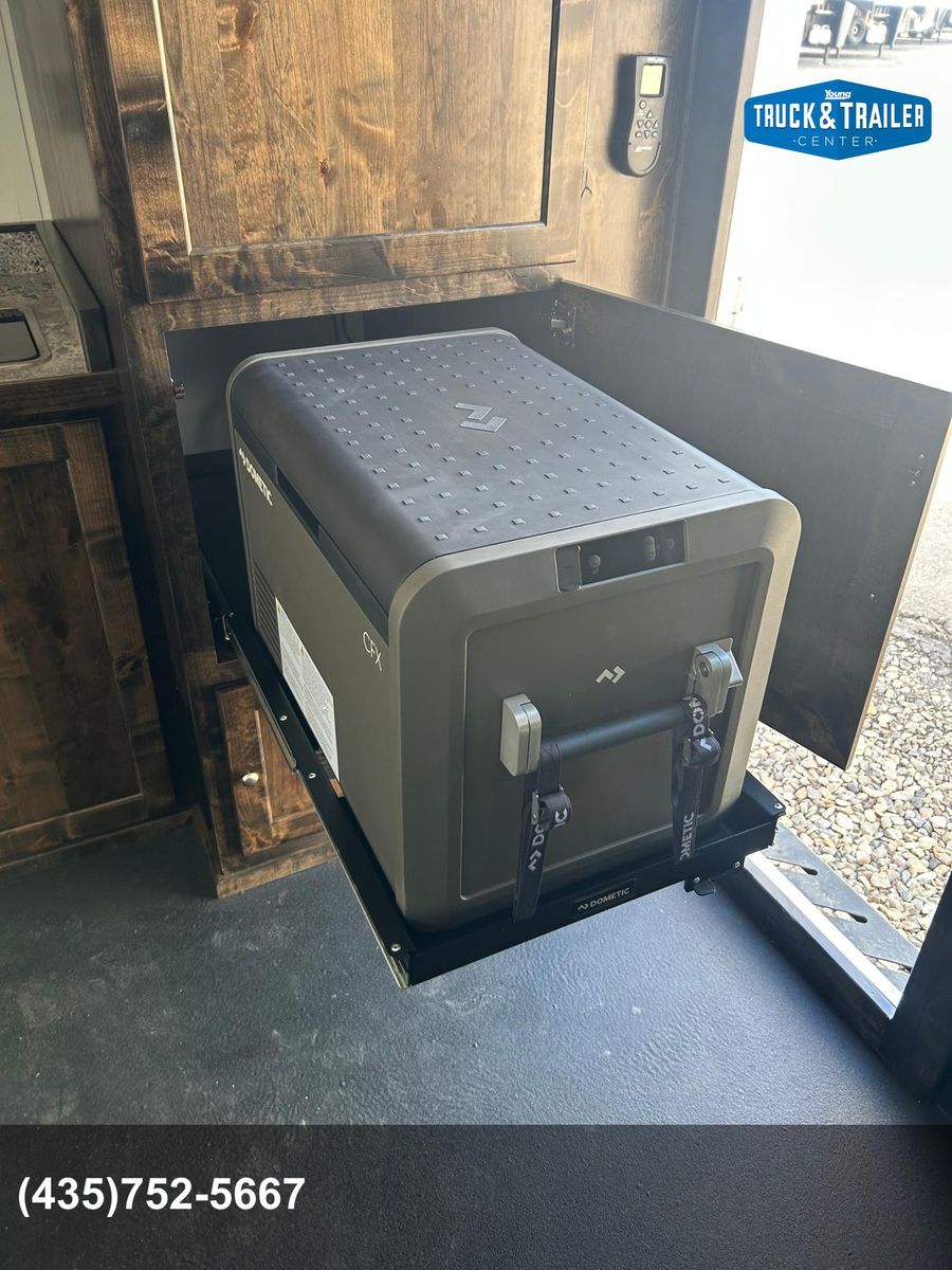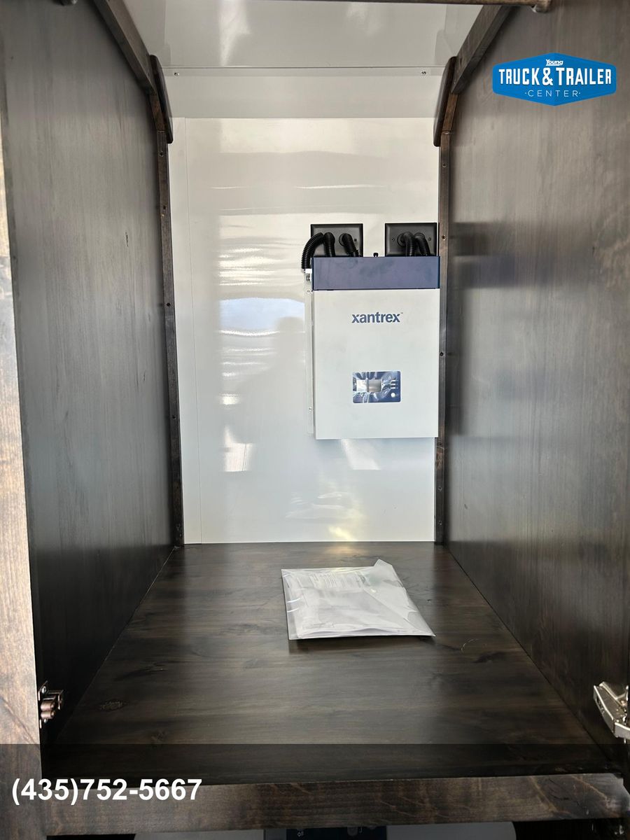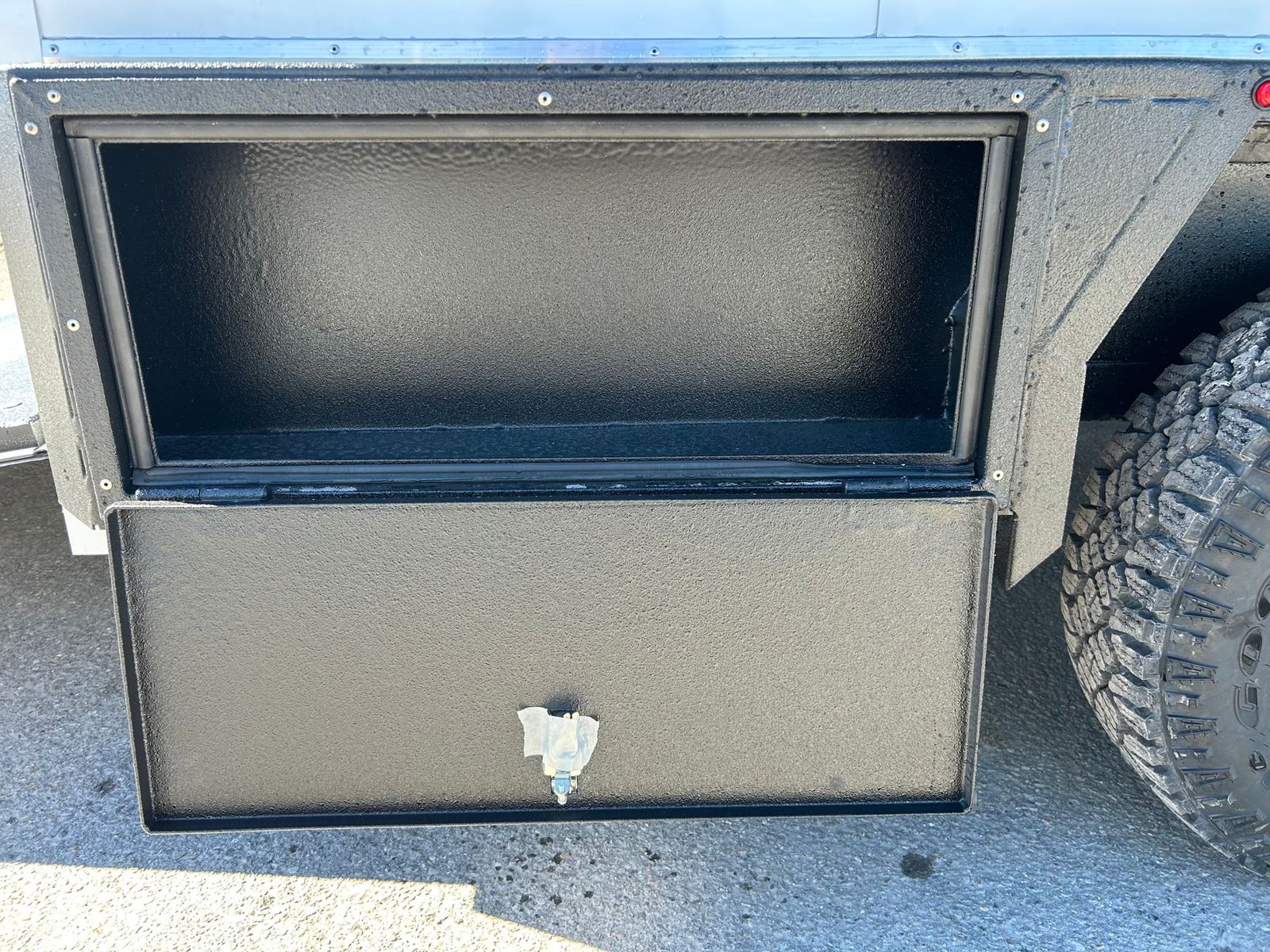 Expedition Package includes 12’ Roof rack with ladder 2nd gas can rack 99” CVT awning Aluminum tie down track each side exterior wall 2-way Maxx Air vent Off Grid Power Pkg - (includes Xantrex 2000 watt inverter/charger, dual 12v deep cycle batteries, 2- additional USB plugs, 2 - additonal 12v plugs, 2 exterior 110v plugs, 3interior 110v plugs, pre-wire for solar panel) On demand water heater 40 Quart 12v fridge/freezer on pull out rack 20,000 BTU furnace 2 - 20# propane tanks Modular / removable fold down table