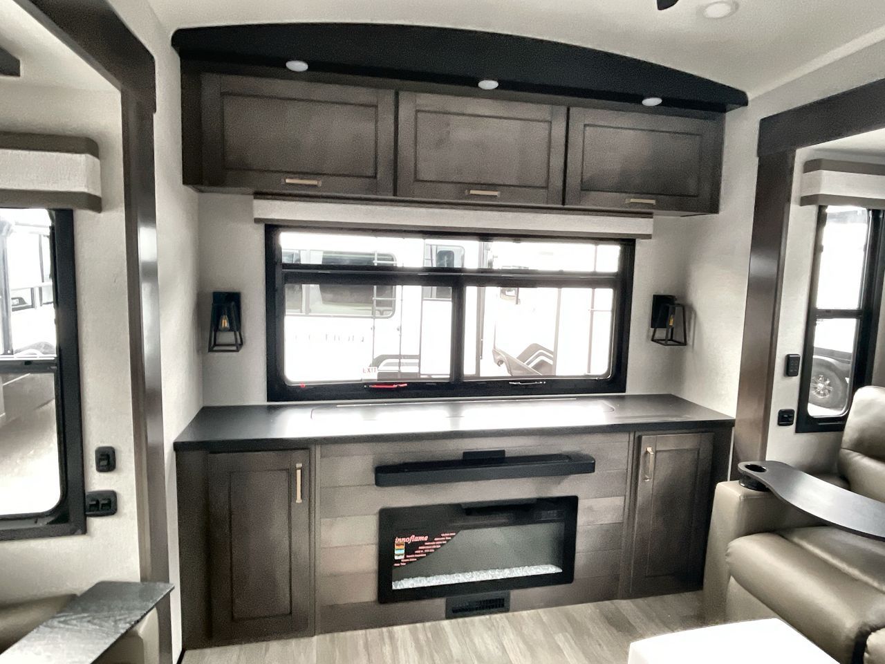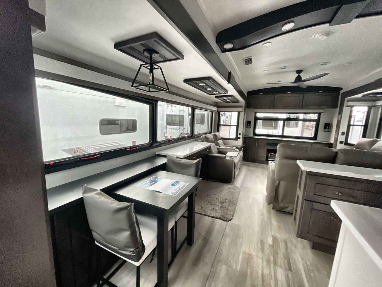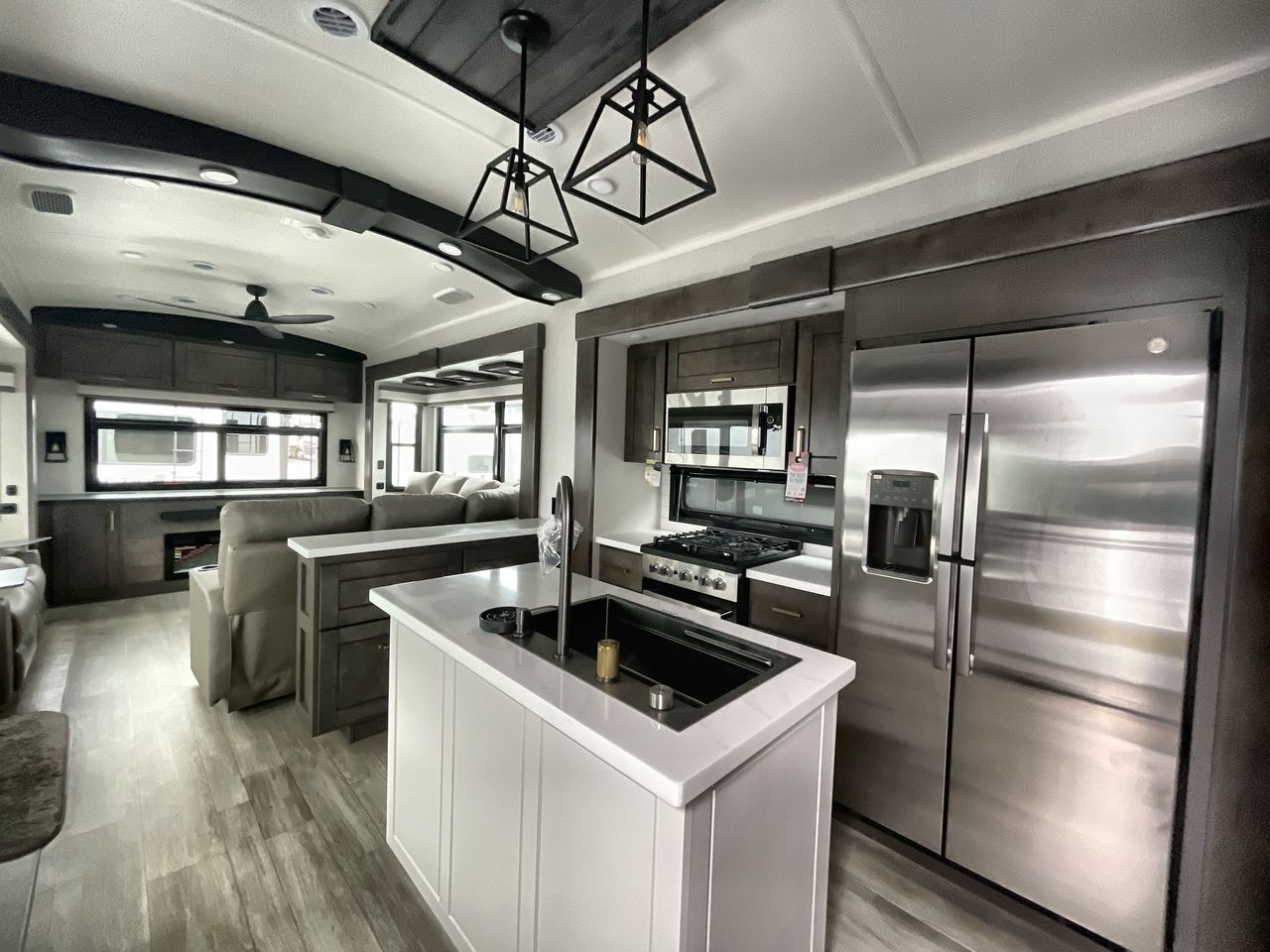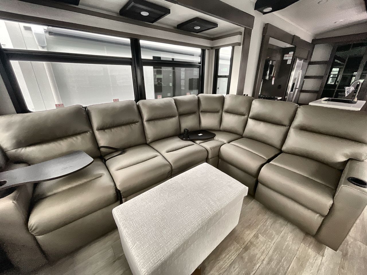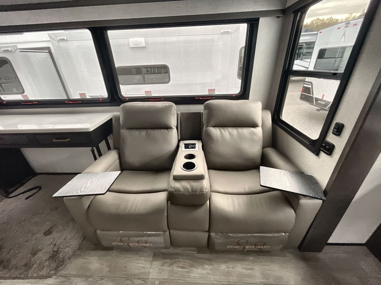 At the front of this 38RE layout, you’ll find a private bedroom featuring a spacious 72" x 80" king bed slide-out, creating a comfortable retreat to rest and recharge. The room also includes a wardrobe and dresser with a TV above, providing ample storage for clothing and essentials. Moving down the hall, the full bathroom offers both comfort and convenience with its 36" x 48" shower complete with a built-in seat for accessibility, plus linen shelves for added storage. At the heart of the unit, the kitchen is thoughtfully designed with everything needed to cook in comfort, including a pantry, a pull-out cutting board in the island, and a 21-cu. ft. refrigerator. Meal preparation is a breeze with the 24" range or the convection microwave featuring a built-in air fryer. Across from the kitchen, the large slide-out hosts a roll-out table perfect for dining or game nights, as well as a desk/coffee bar and cozy theater seating. At the rear, the entertainment center stands out with a TV lift and fireplace, while the L-shaped lounge and additional theater seat create the ultimate space to relax and enjoy movie nights in style.