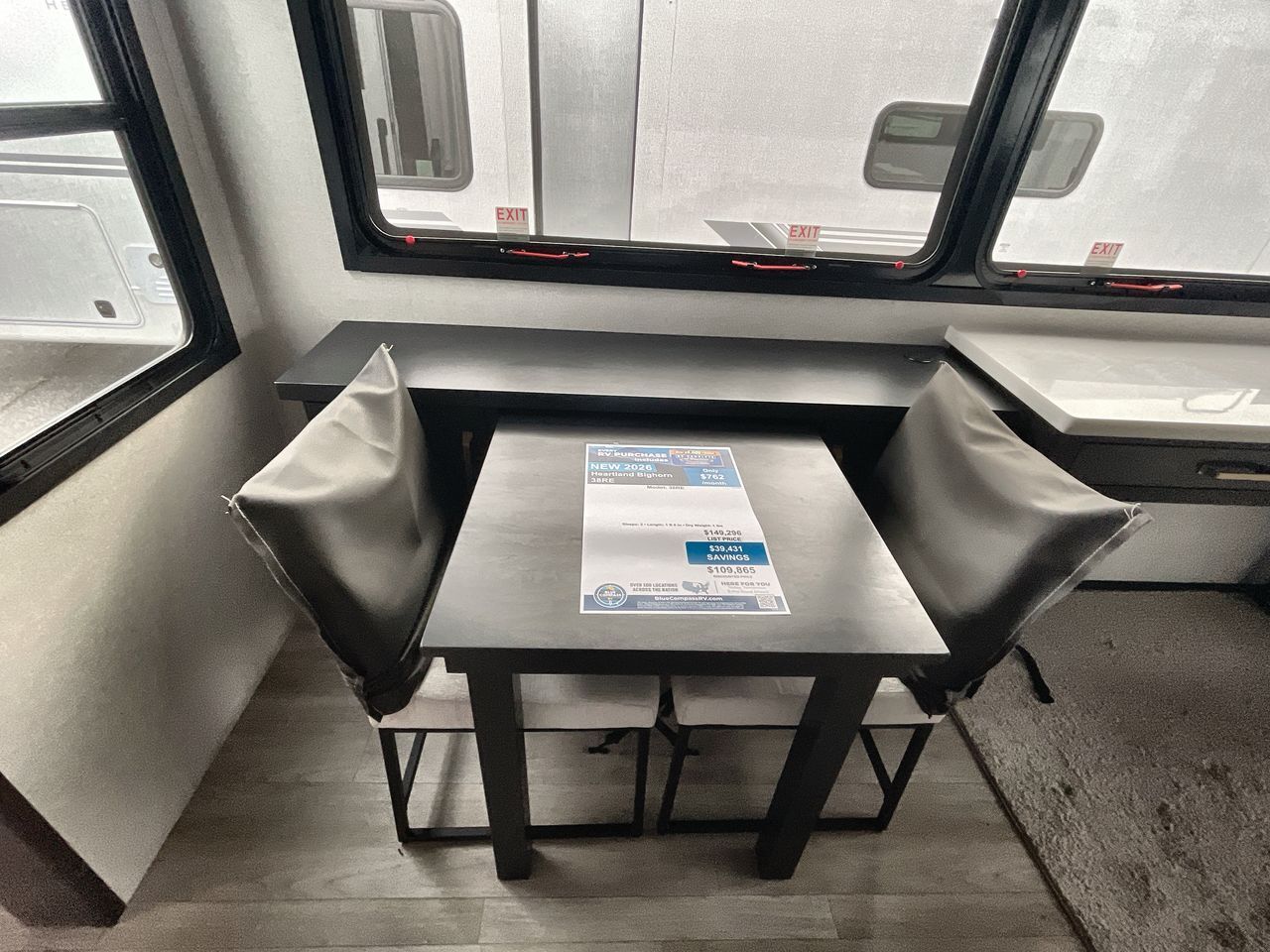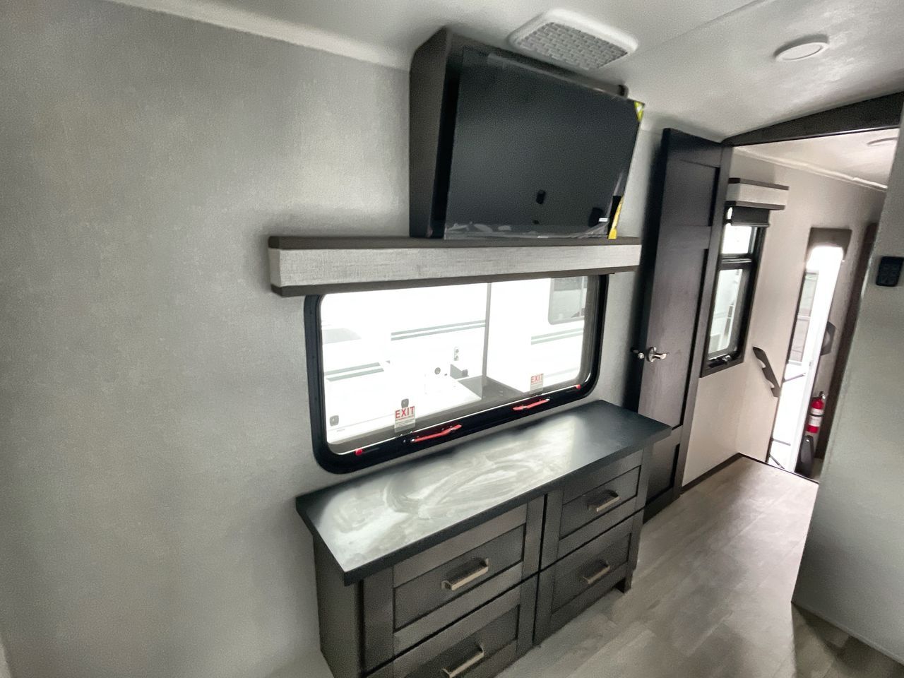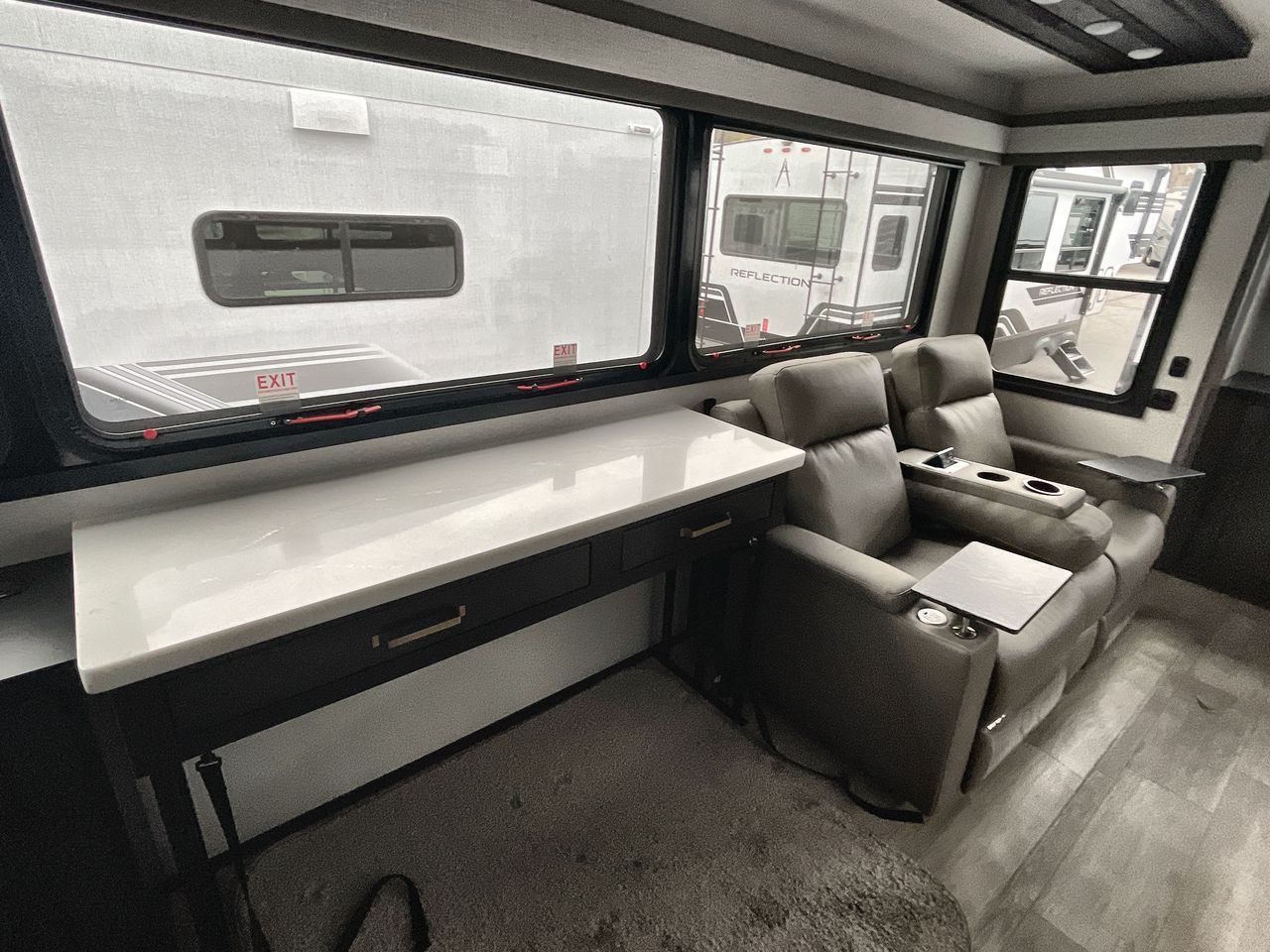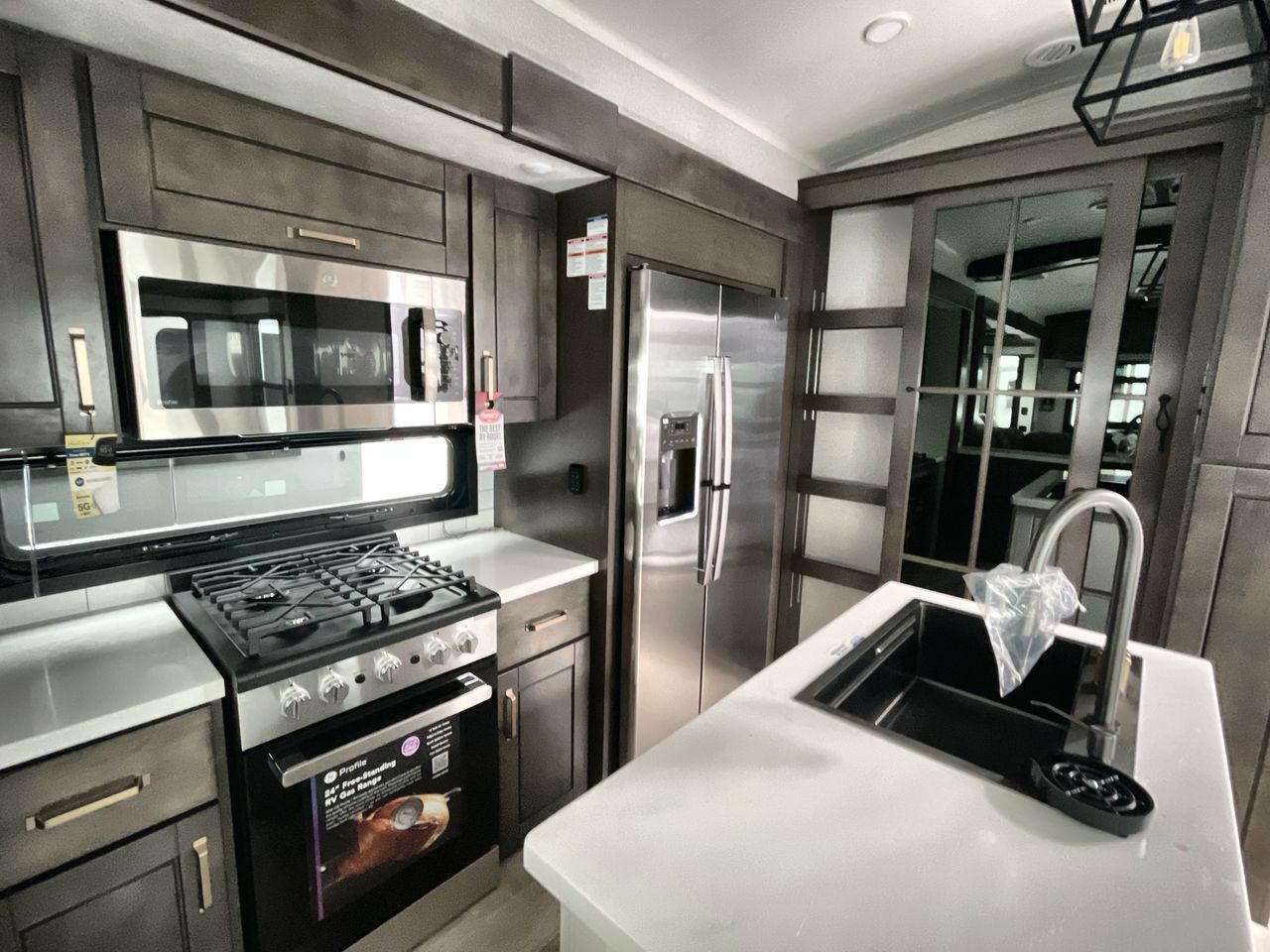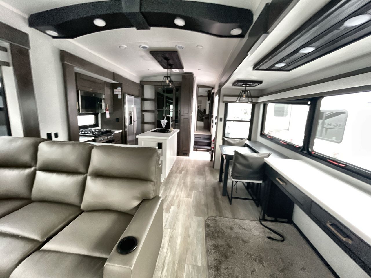 At the front of this 38RE layout, you’ll find a private bedroom featuring a spacious 72" x 80" king bed slide-out, creating a comfortable retreat to rest and recharge. The room also includes a wardrobe and dresser with a TV above, providing ample storage for clothing and essentials. Moving down the hall, the full bathroom offers both comfort and convenience with its 36" x 48" shower complete with a built-in seat for accessibility, plus linen shelves for added storage. At the heart of the unit, the kitchen is thoughtfully designed with everything needed to cook in comfort, including a pantry, a pull-out cutting board in the island, and a 21-cu. ft. refrigerator. Meal preparation is a breeze with the 24" range or the convection microwave featuring a built-in air fryer. Across from the kitchen, the large slide-out hosts a roll-out table perfect for dining or game nights, as well as a desk/coffee bar and cozy theater seating. At the rear, the entertainment center stands out with a TV lift and fireplace, while the L-shaped lounge and additional theater seat create the ultimate space to relax and enjoy movie nights in style.