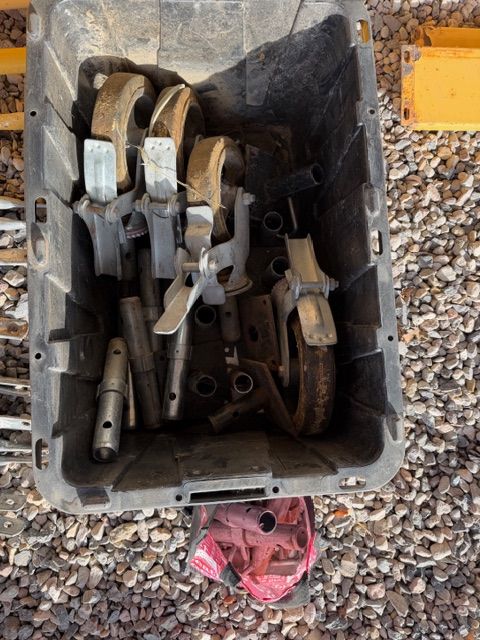 6 - 5’x5’ premium ladder frame, 3 - planks, 6 - cross brace, 1 - diagonal brace, 12 - stack pins, 8 - casters, 1 safety rails w/ toe boards, 4 - outriggers, footplates and pins.