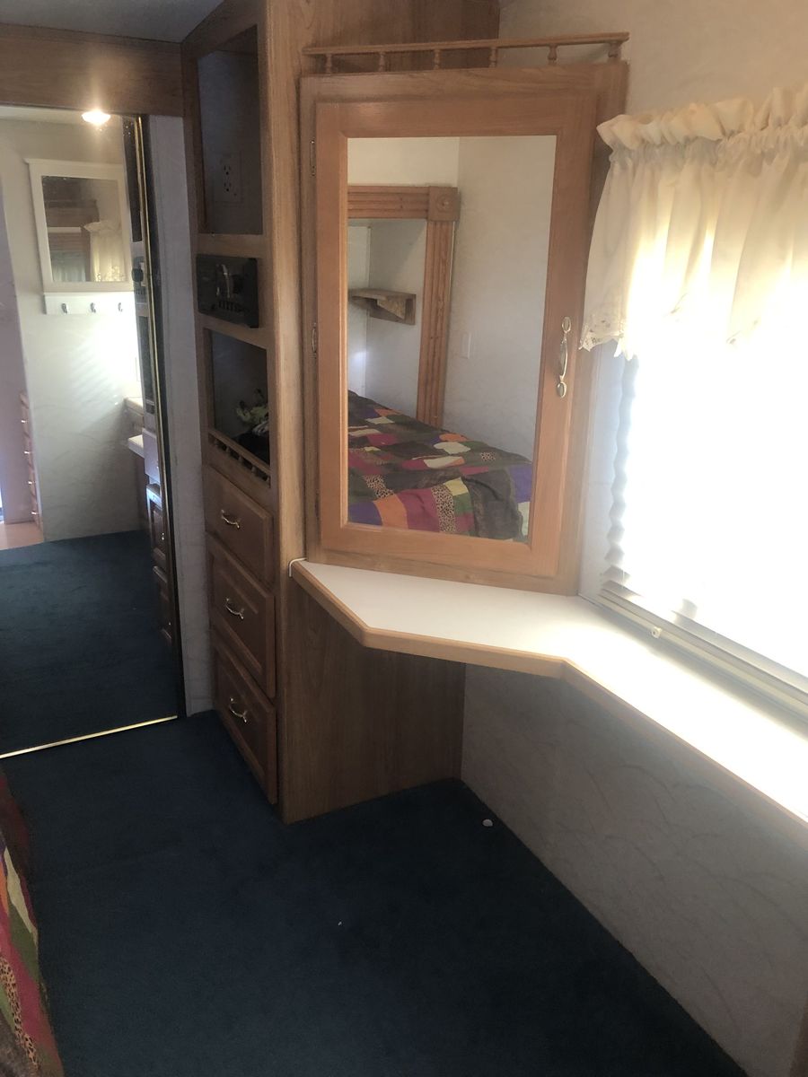 Bedroom pullout with twin bed, large, mirrored closet, cabinets. Propane heater, air conditioner, with electric usage available. Clean and in good shape, tires ok.