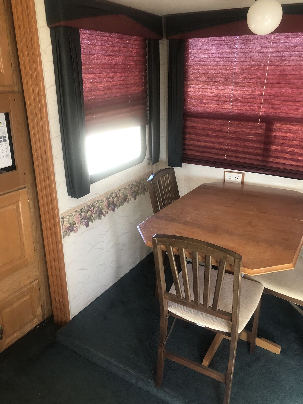 2 pullouts -one for the kitchen, one for the bedroom. Everything works well in the kitchen- sink, stove, refrigerator, microwave. Heater and air. Table with 3 chairs