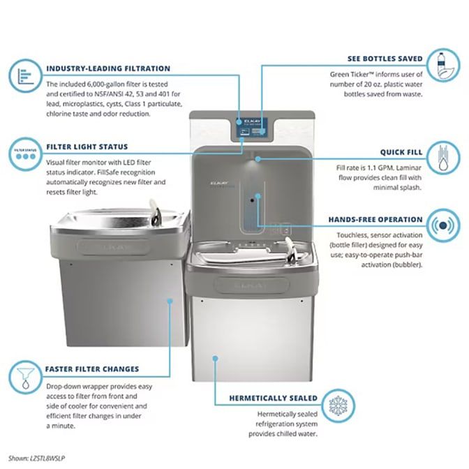 What's Included: • LZSTL8WSLP Bottle Filling Station and Bi-Level Cooler unit • WaterSentry® Filter Cartridge (51600C, 6,000-gallon capacity) • Flexi-Guard® safety bubbler • Installation instructions