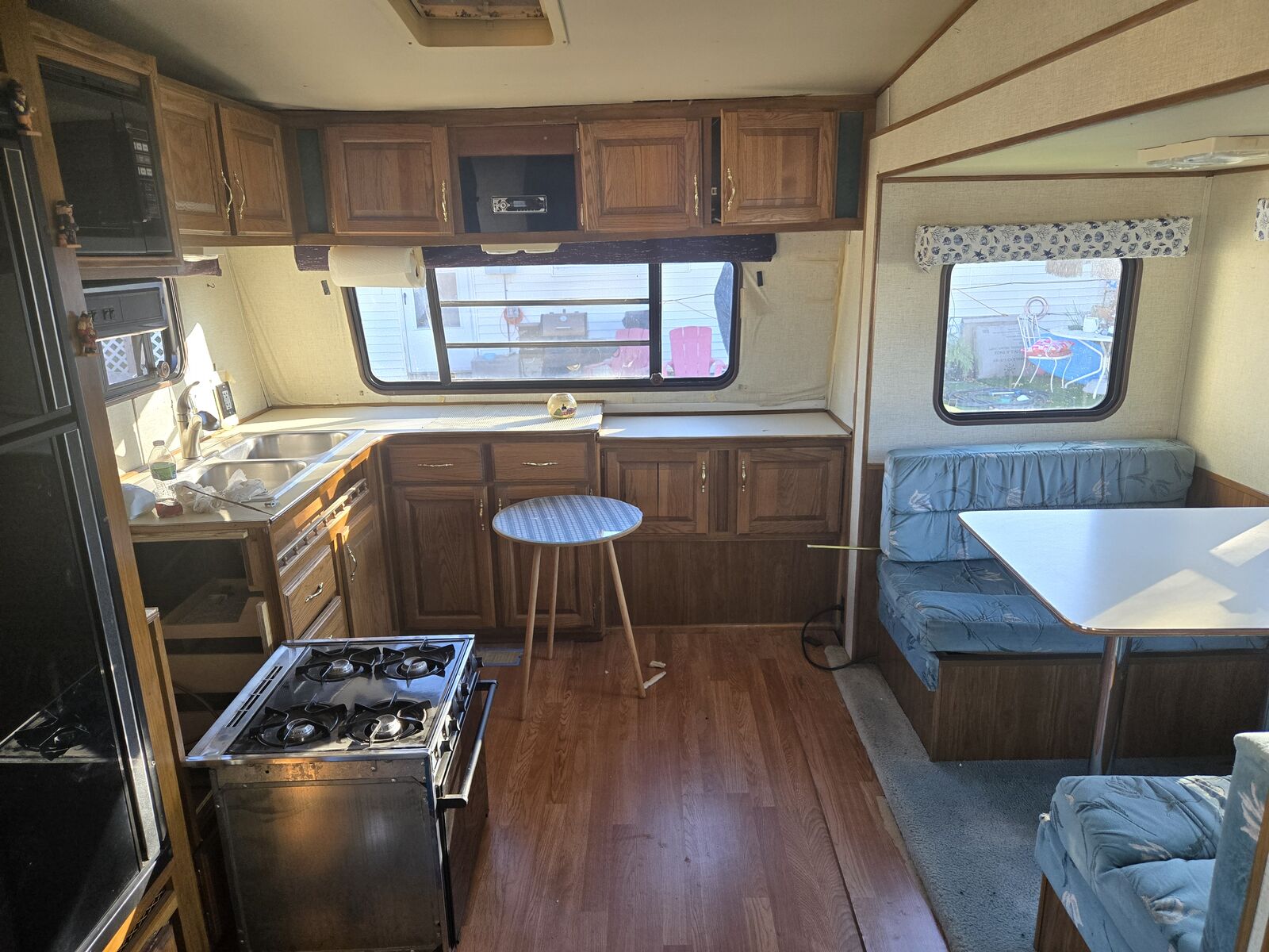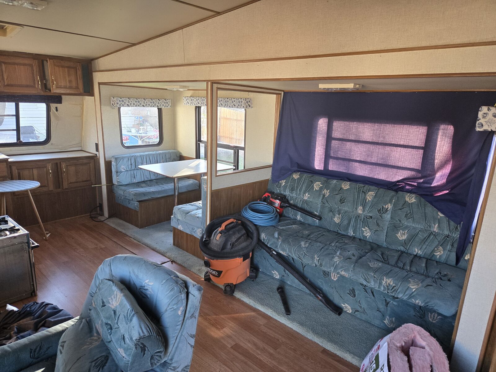 Venmo1992 Dutchman Royal Classic It was being used as an STR, direct water and sewer connections. We purchased it with the plans of doing a gut and remodel, however we’re moving and don’t yet know if our new area will accommodate this. The good: Tows well, all towing lights and brakes (2 axles) work. The inverter works well. The slide and front jacks are hydraulic, both work well. Has a metal roof (see bad). Just put on 4 new tires ($600), added 2 rims as spares and used 2 best of removed. New 5-layer King Bird 5th wheel trailer cover with tire covers. Laminate flooring installed in main living area. Microwave, Fridge, and A/C seem to all work on electricity. Has a new mattressin the bedroom (not pictured). The bad: The roof leaks (needs seams redone). Water damage on back wall and bedroom wall. Slide needs a new seal. Needs a fresh water tank, pump, and the black water tank installed. Needs a water heater and the stove re-installed. As for the rest, I’m not sure. That’s why it is priced so low. All in all, it is very roomy and seems very sturdy. I towed it 200 miles from its location in central Utah to Tooele with no issues and it was very smooth. We have spent time with it hooked up to power while we were cleaning it up and all attached seemed to work well. Shoot me an offer and I'll concider it.