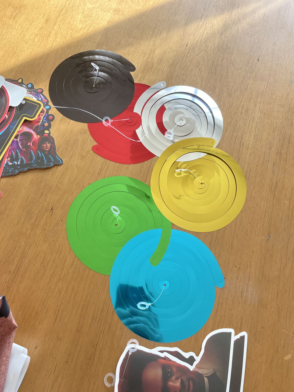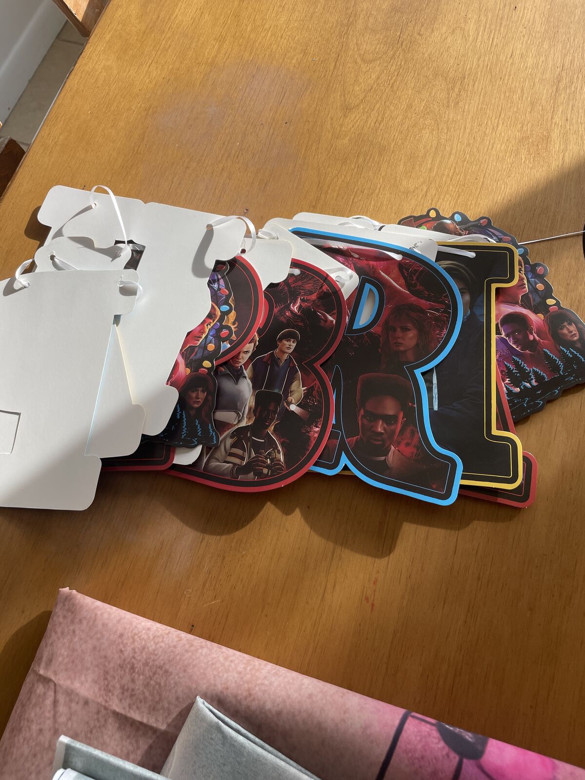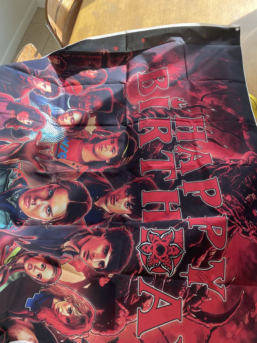 A set of stranger things birthday decorations includes character hangers, 2 big backdrops and some extra twisty hanger things. Also has the happy birthday banner as well. Just used yesterday and ready for another kid.