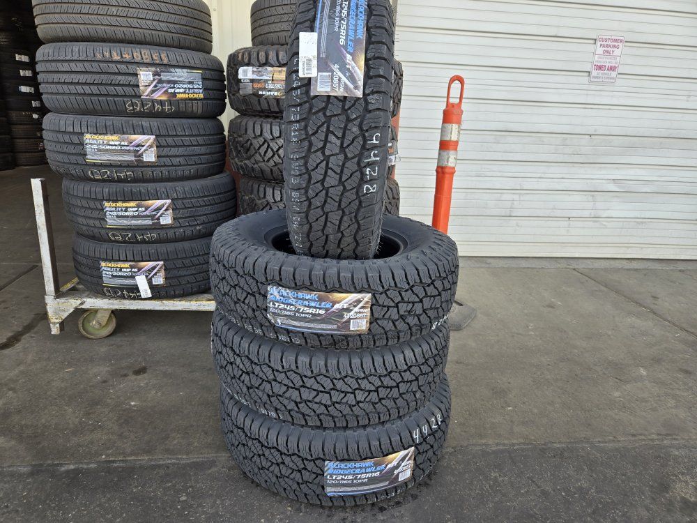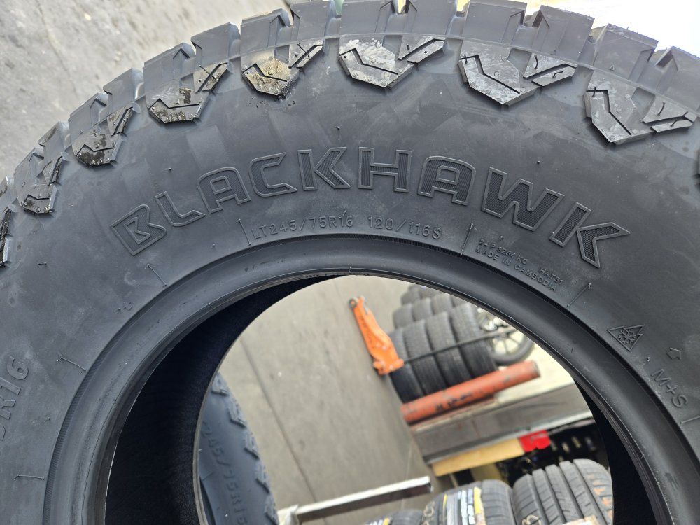 Brand new set of tires the brand is BLACKHAWK RIDGECRAWLER A/T Size LT245/75R16 LOAD RANGE E 10PLY Free mount, balance, and brand new valve stems. $850+tax. For all 4 90 day financing available through Acima, (snap) message for details. Also make sure to check out our google reviews just search “Oliver tires” We carry a lot of other tire sizes new and used. As well as used and new wheels. If you have any questions call or text. Espańol; 8016885139 Office: 8016620227. Or visit us at 3010 west 500 south. Salt Lake City Utah. Shop #11