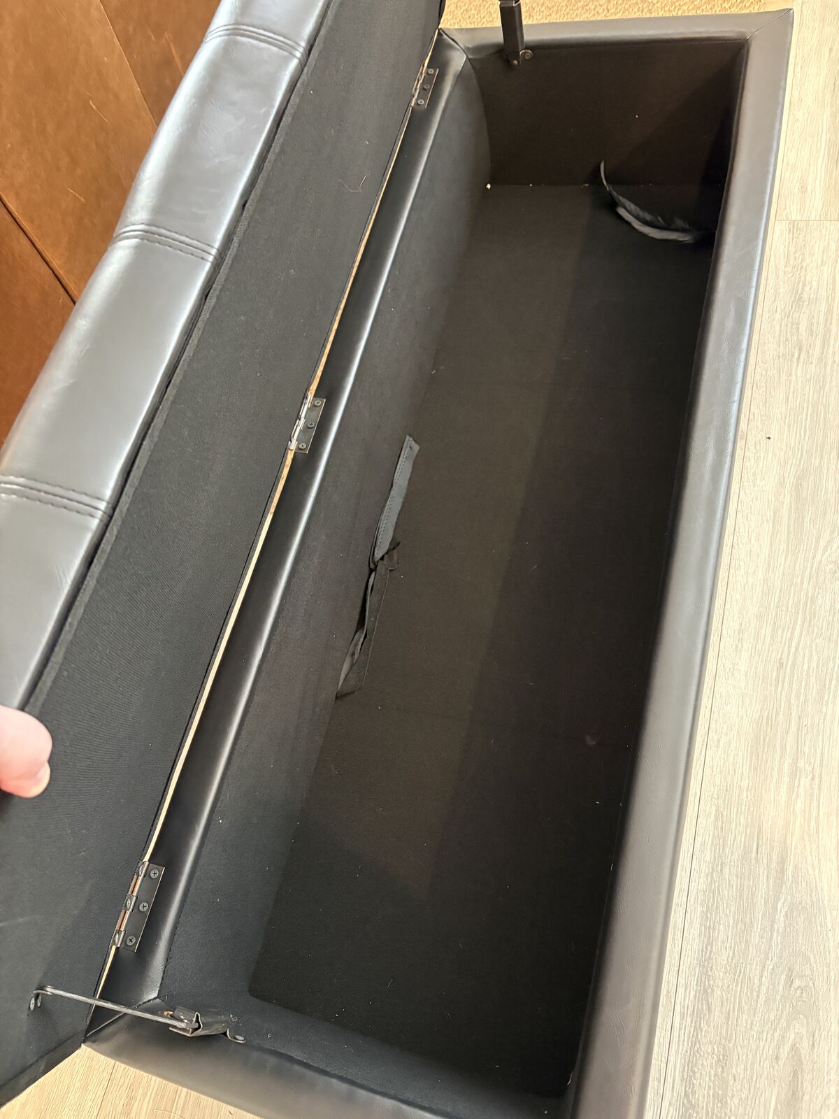 Black leather ottoman with storage 12inch height 51 inch’s long 18.5 width no wear.