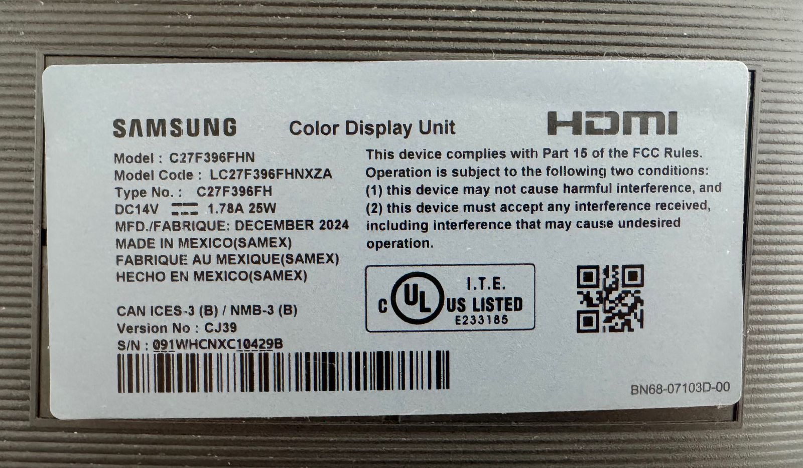 Samsung 27” Curved Gaming Monitor (Model C27F396FHN)