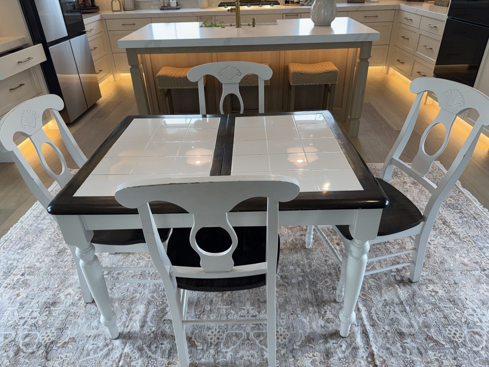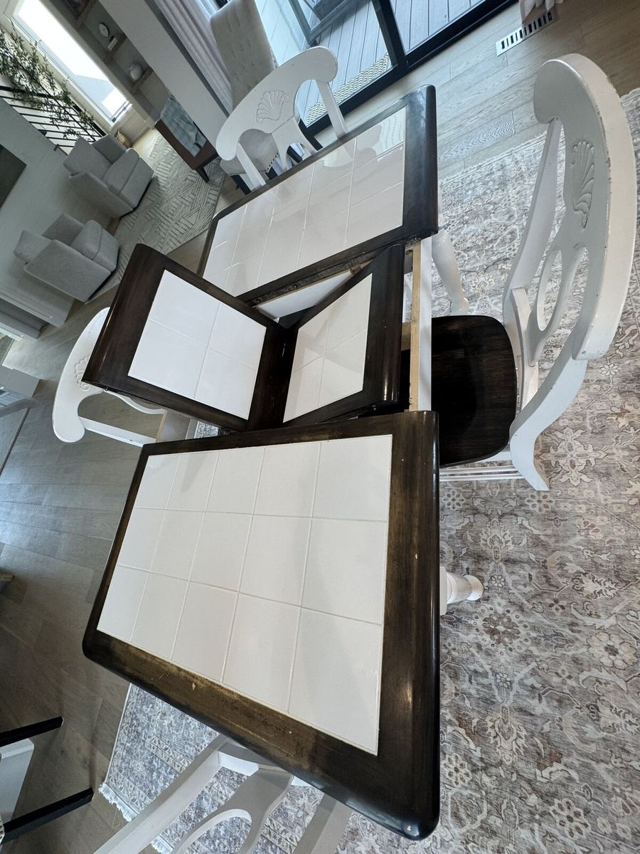 VenmoWhite tile inlay. Dimensions 36" x 45" (60" extended). 29" tall. Comes with 4 chairs and has self storing leaf.