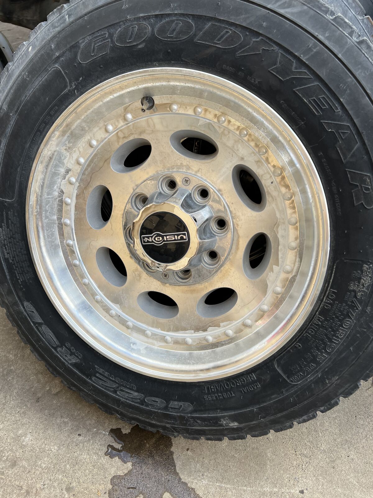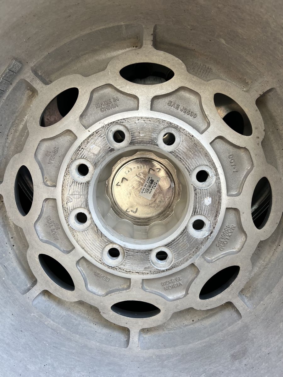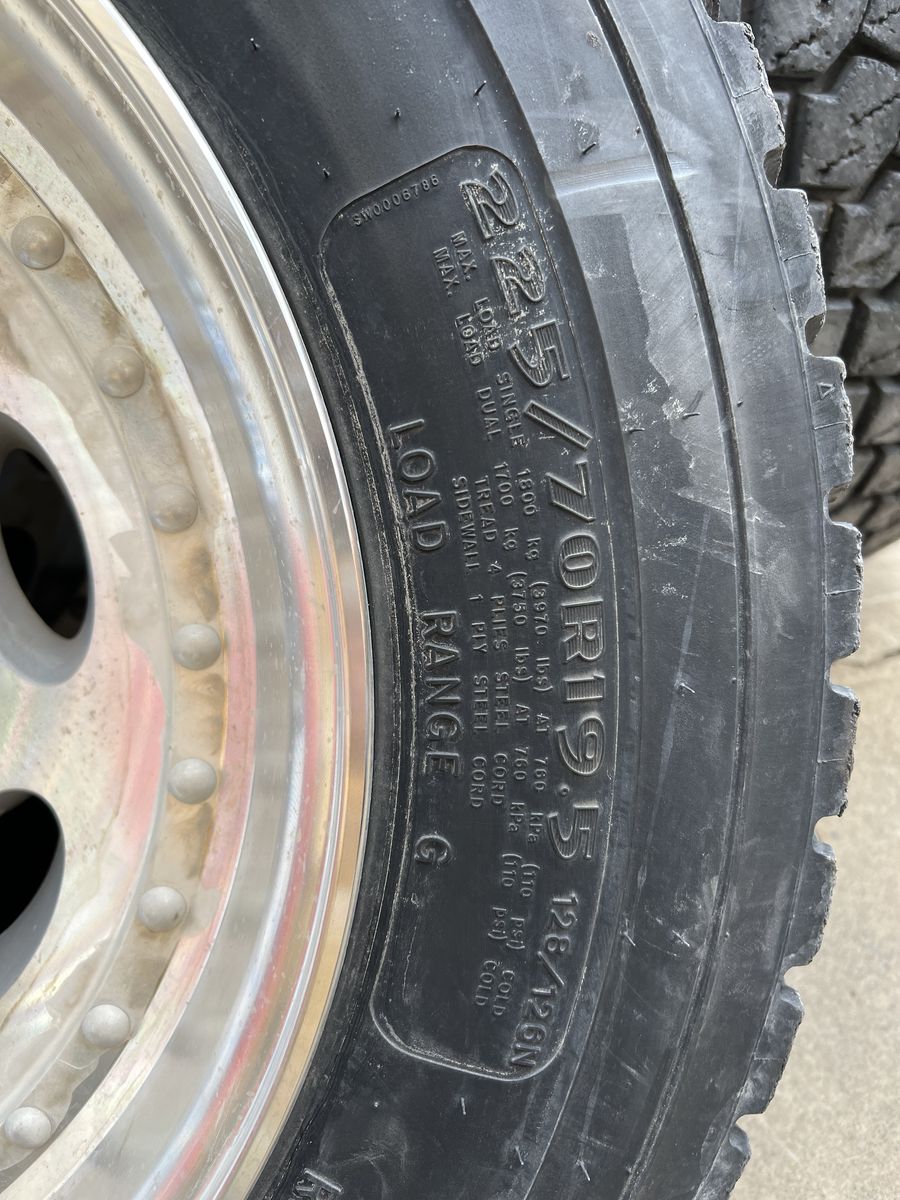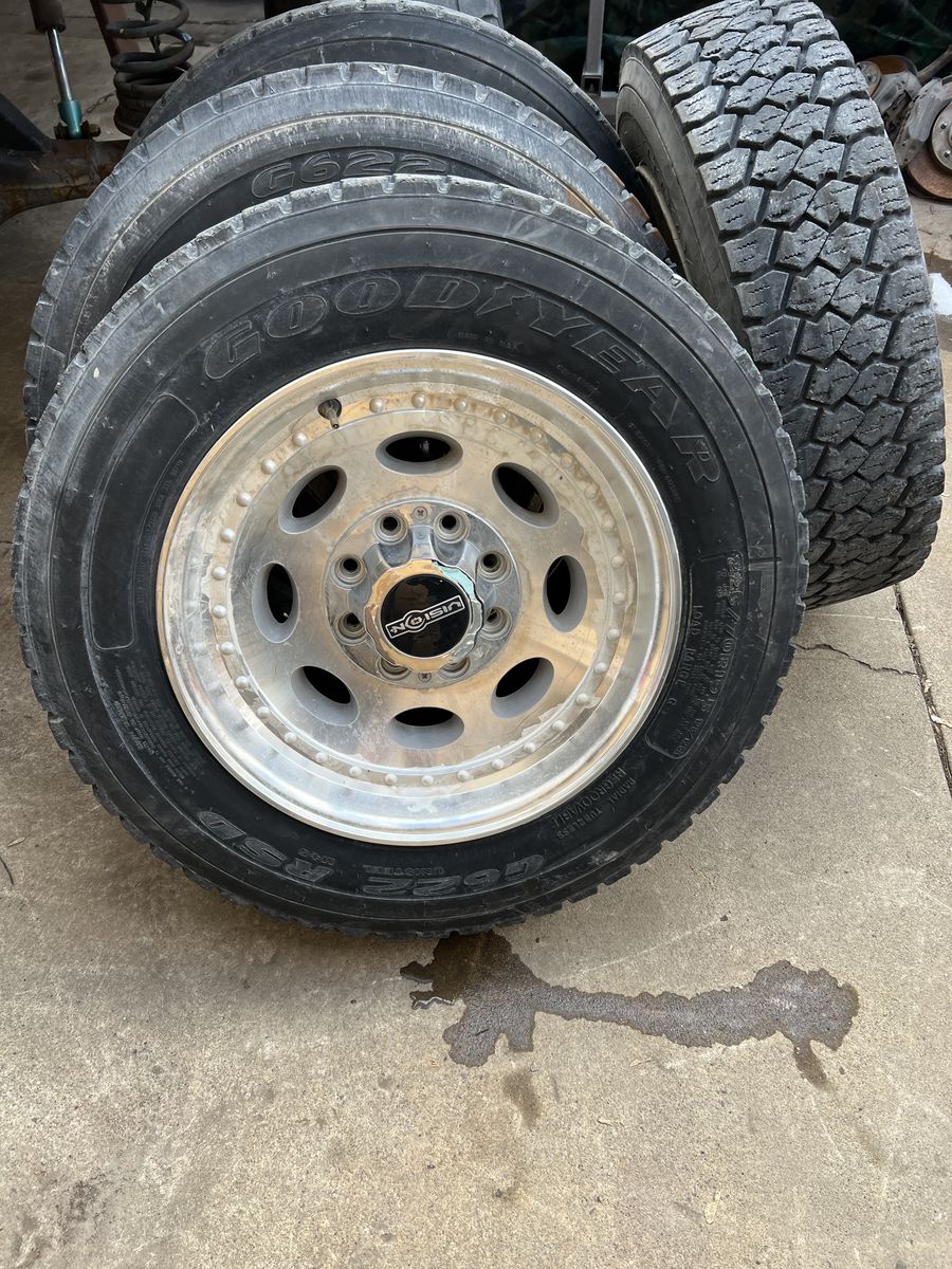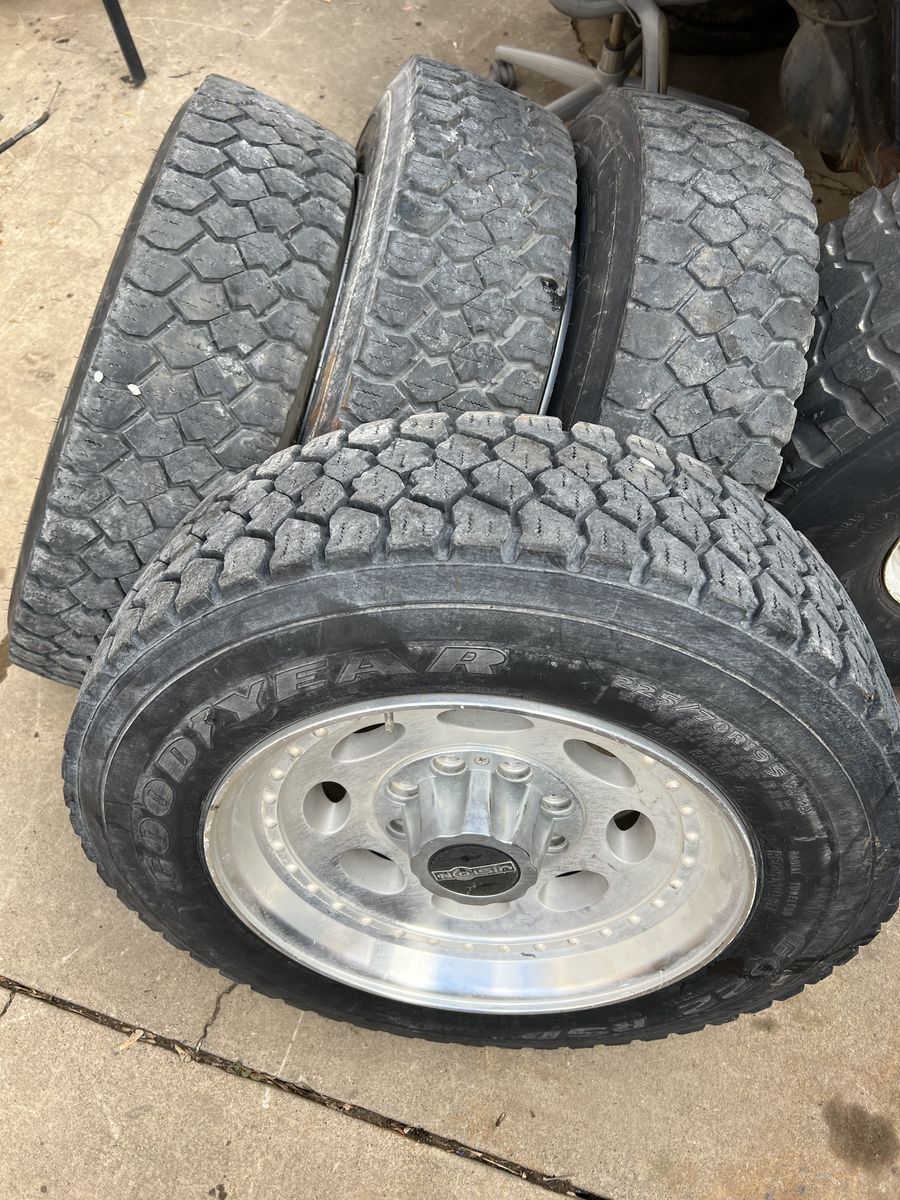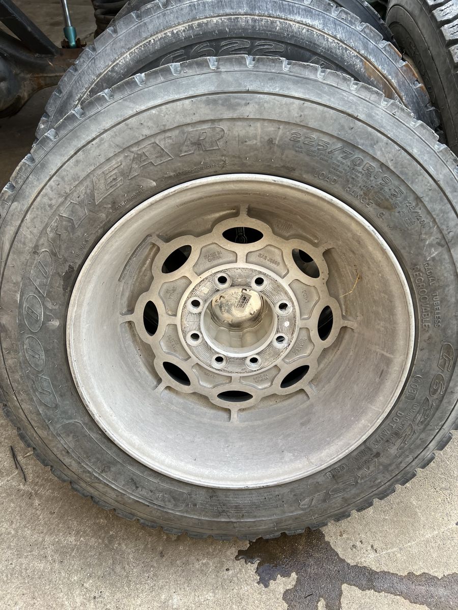 19.5x7.5 vision wheels with center caps 8 lug - 8x6.5 / 8x165 Goodyear 225/70/19.5 G622 RSD Regrovable tires with great tread. One has more outside wear from a bad alignment. Removed from a Chevy 2500HD, could use a polish but in good shape. Will also fit dodge and old ford