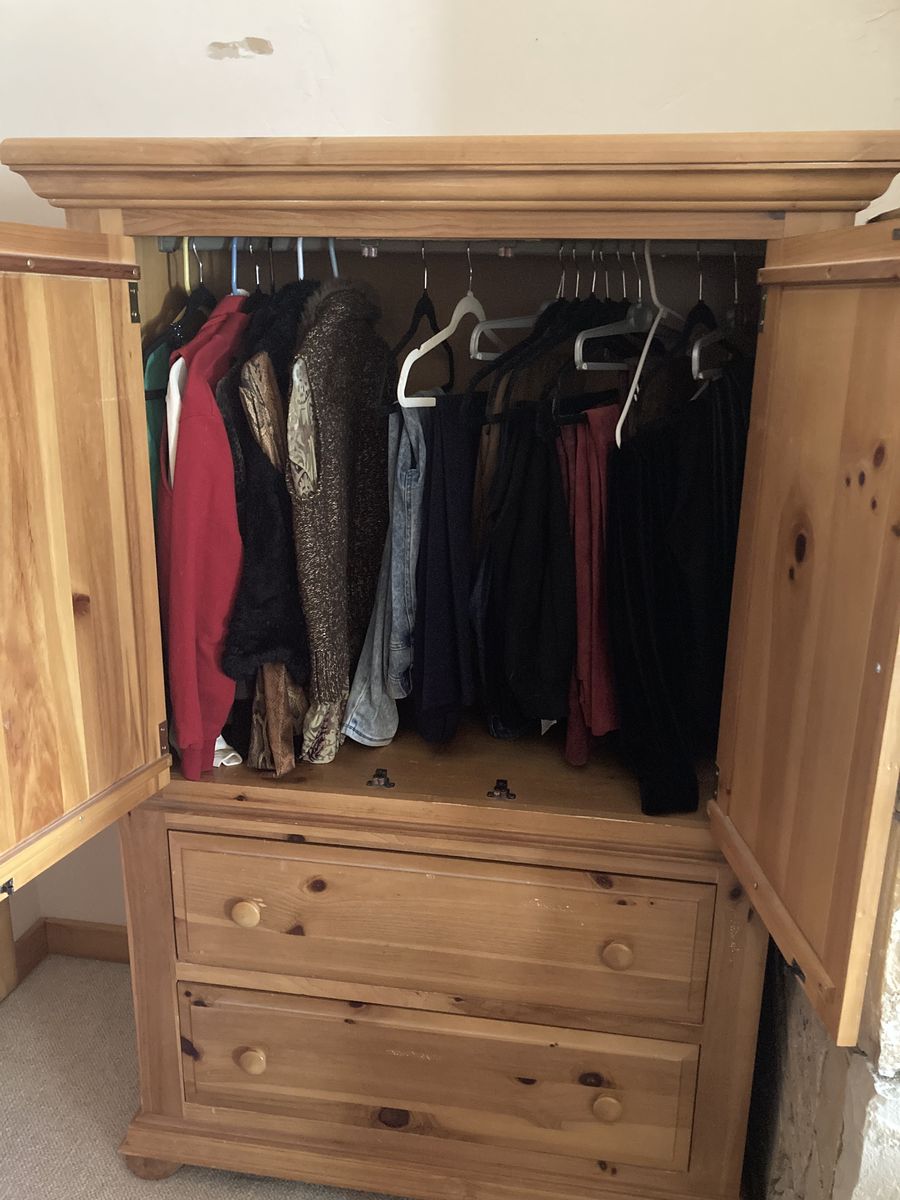 ZelleArmoire has sturdy hanging rod so it can be used as an extra closet. 42” x 20” x 62 1/2”.