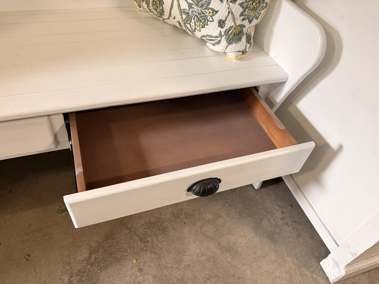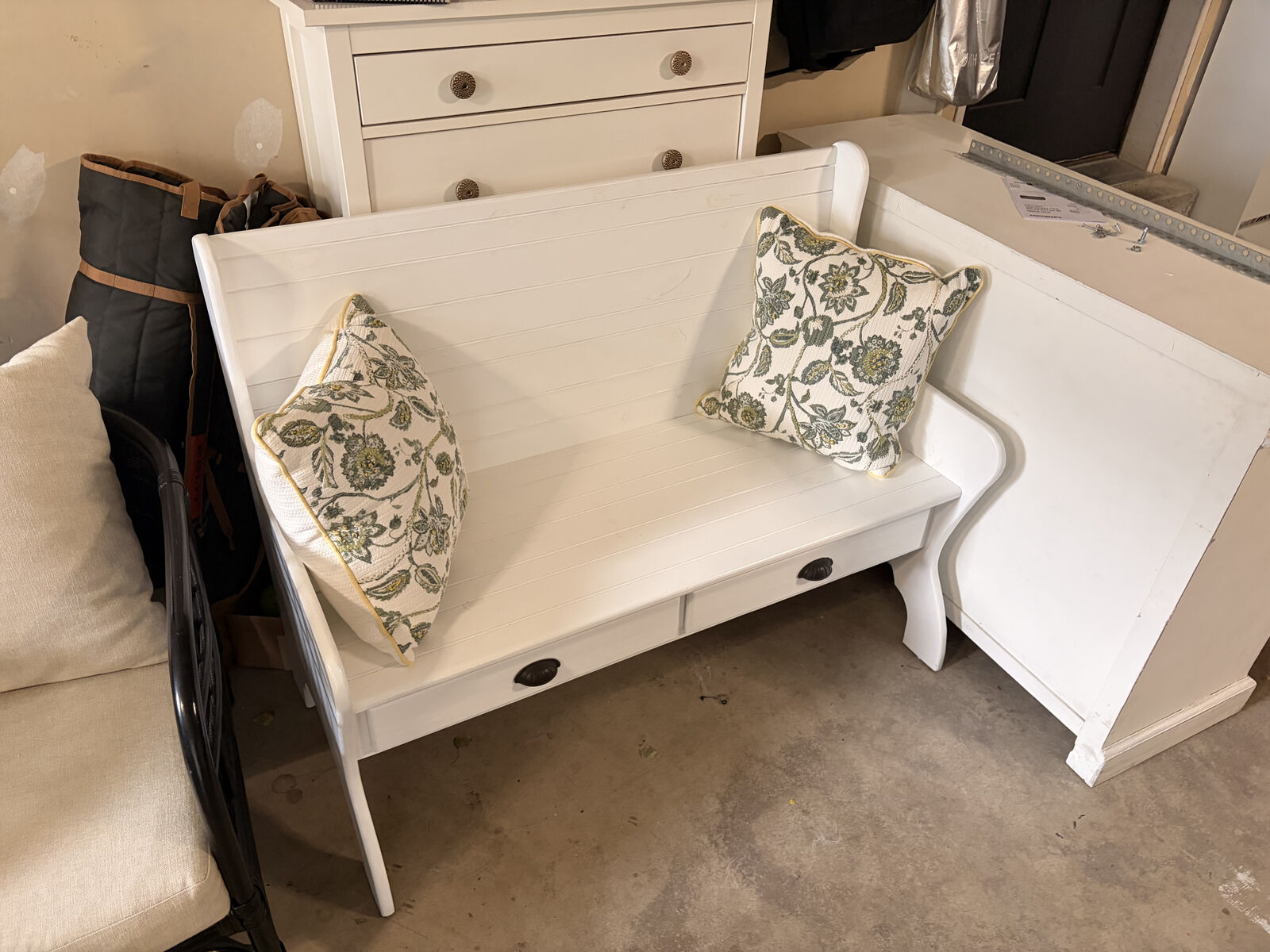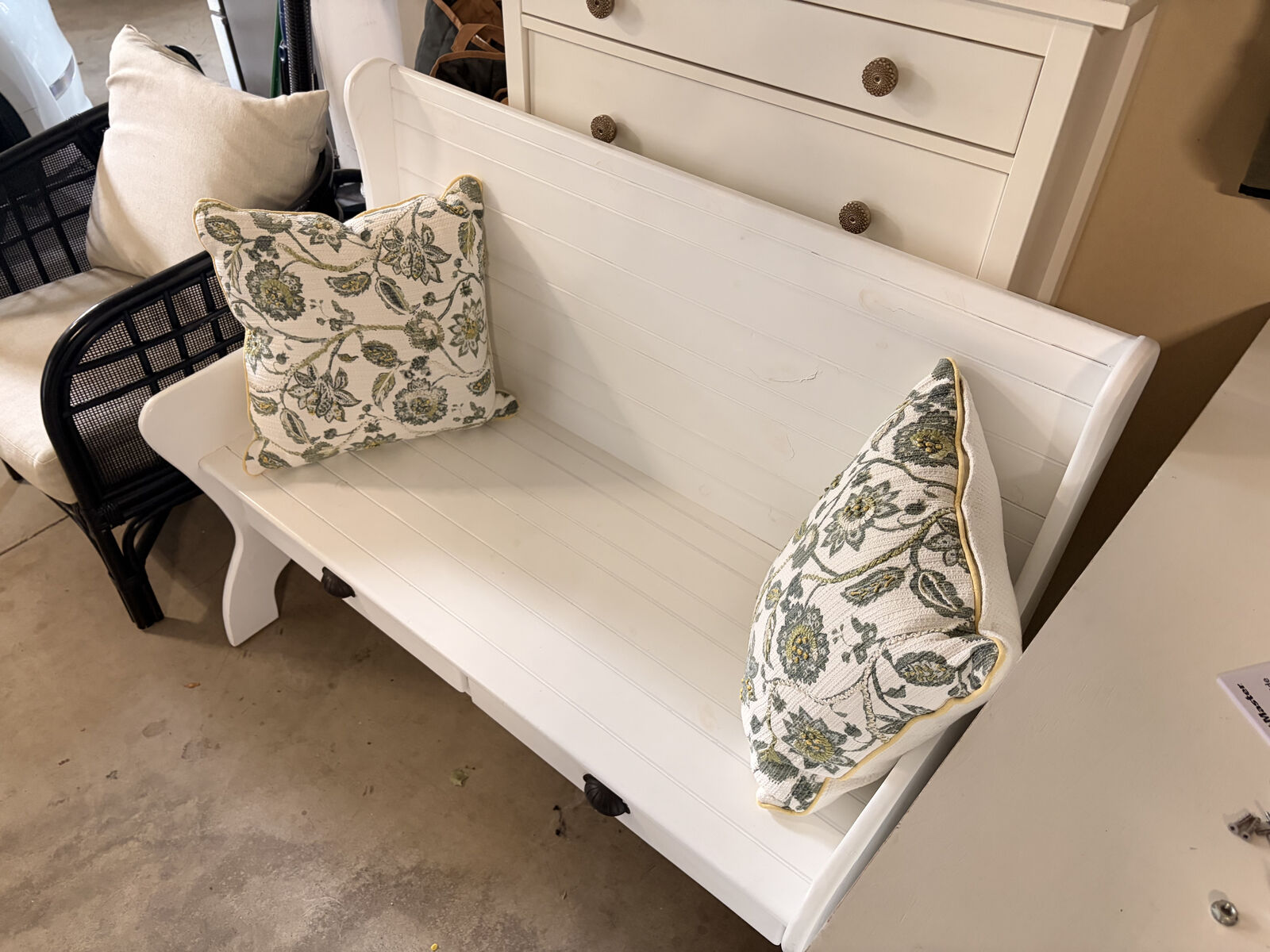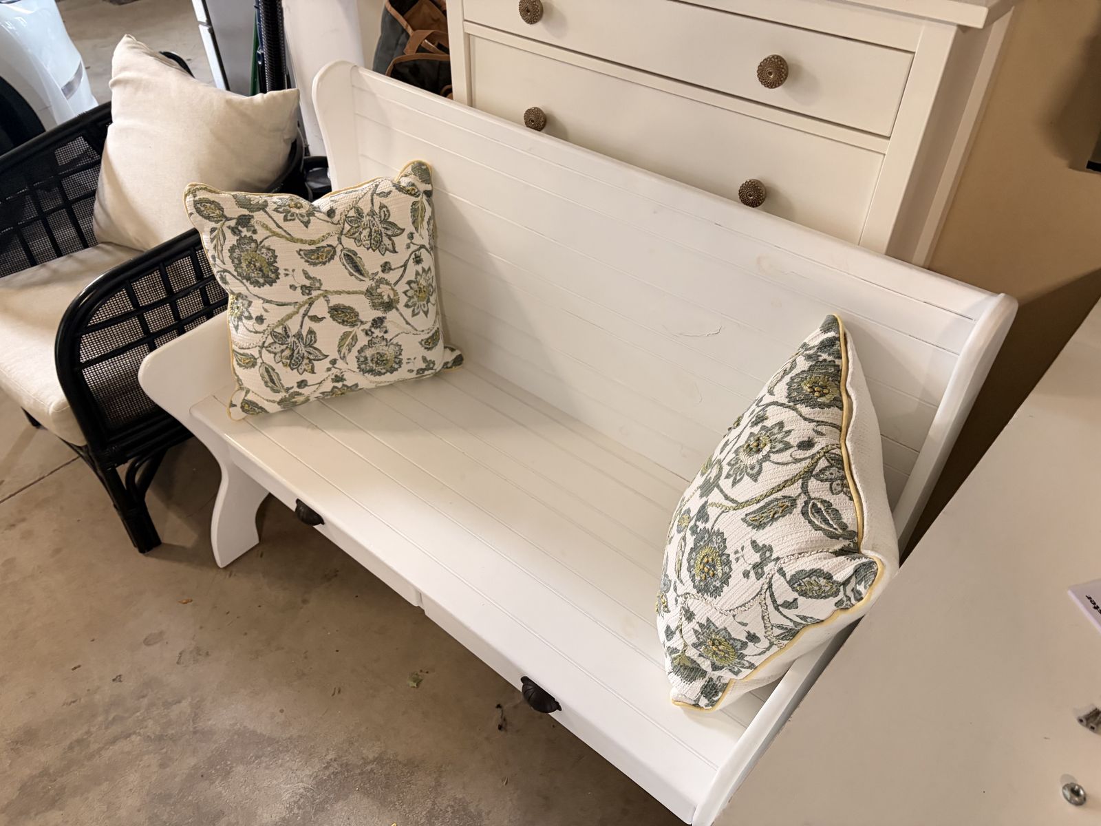 ApplePayLarge, white, 3-4 person bench with included pillows and openable drawers. Dimensions are as follows: Depth - 23", Width - 50", Height - 39".