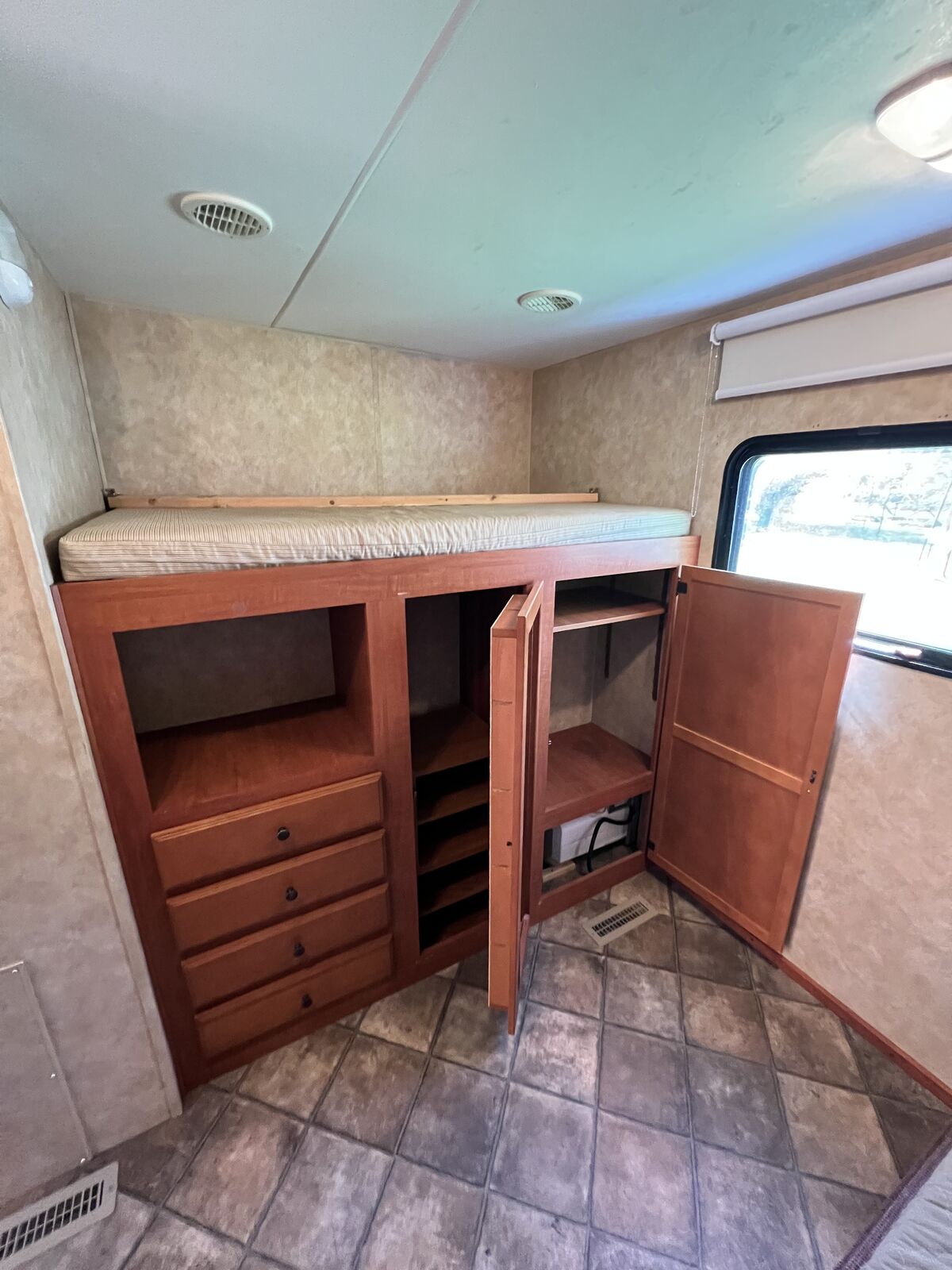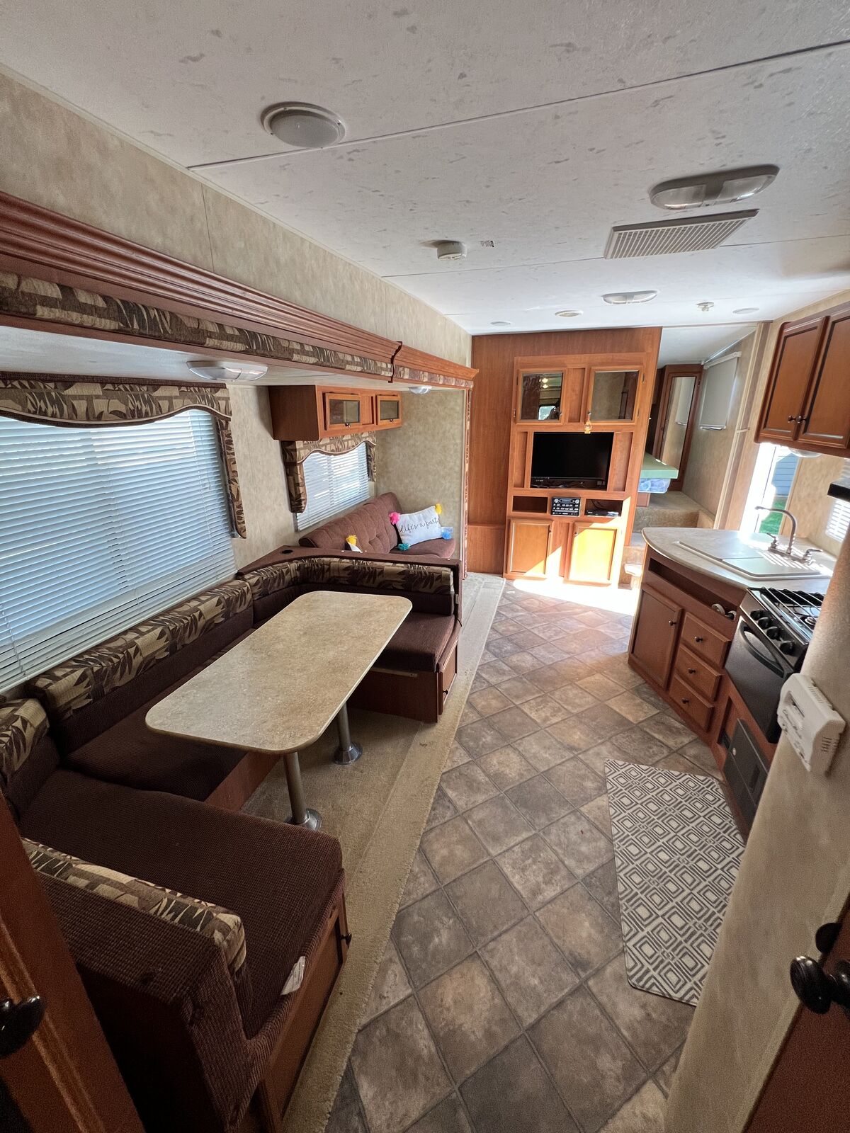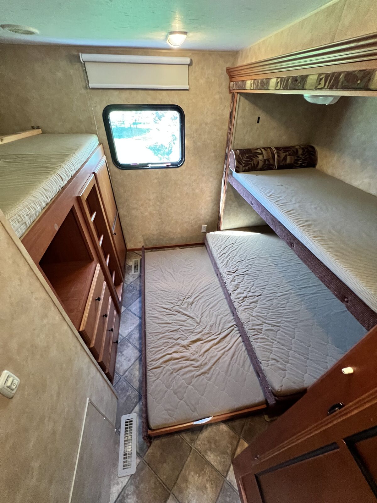 We have LOVED having this trailer. We so bought it from the original owner 4 years ago. Everything works as it should. • tons of storage • 2 new batteries • 5 Beds plus the table and couch beds • Rear hitch for towing • Outdoor Shower • 2 power slides • Big Power awning