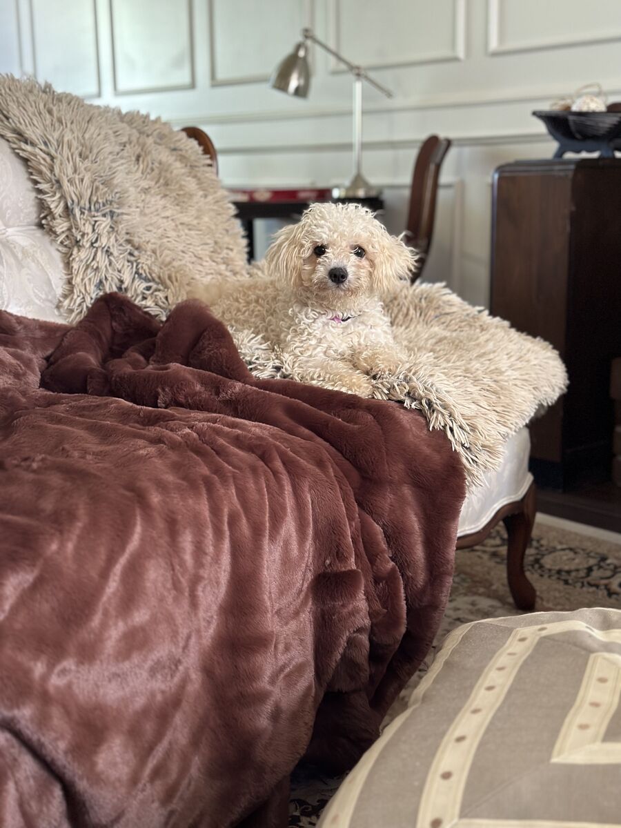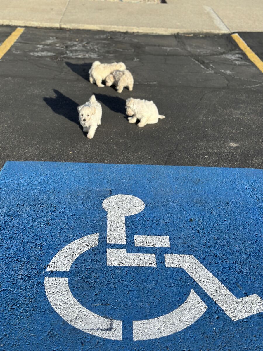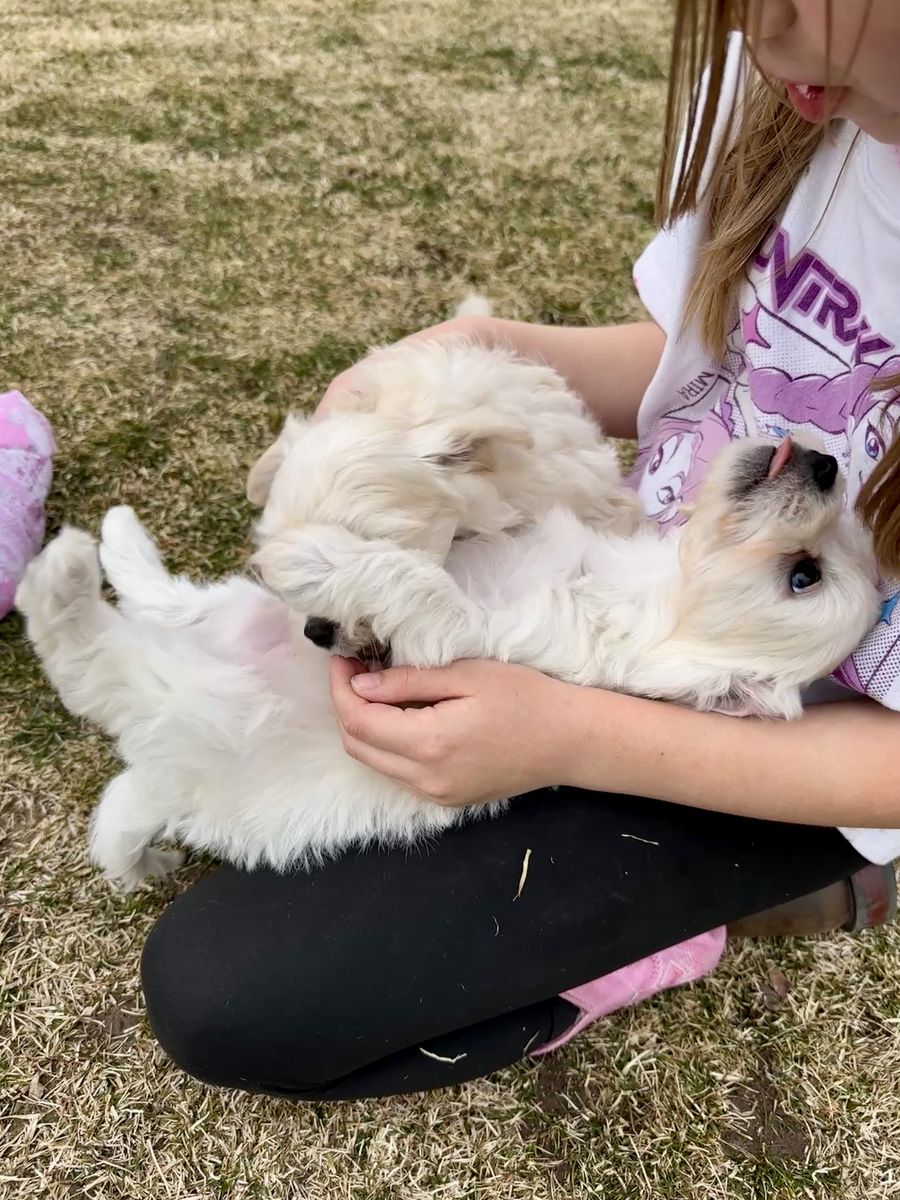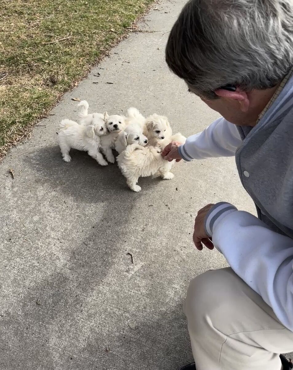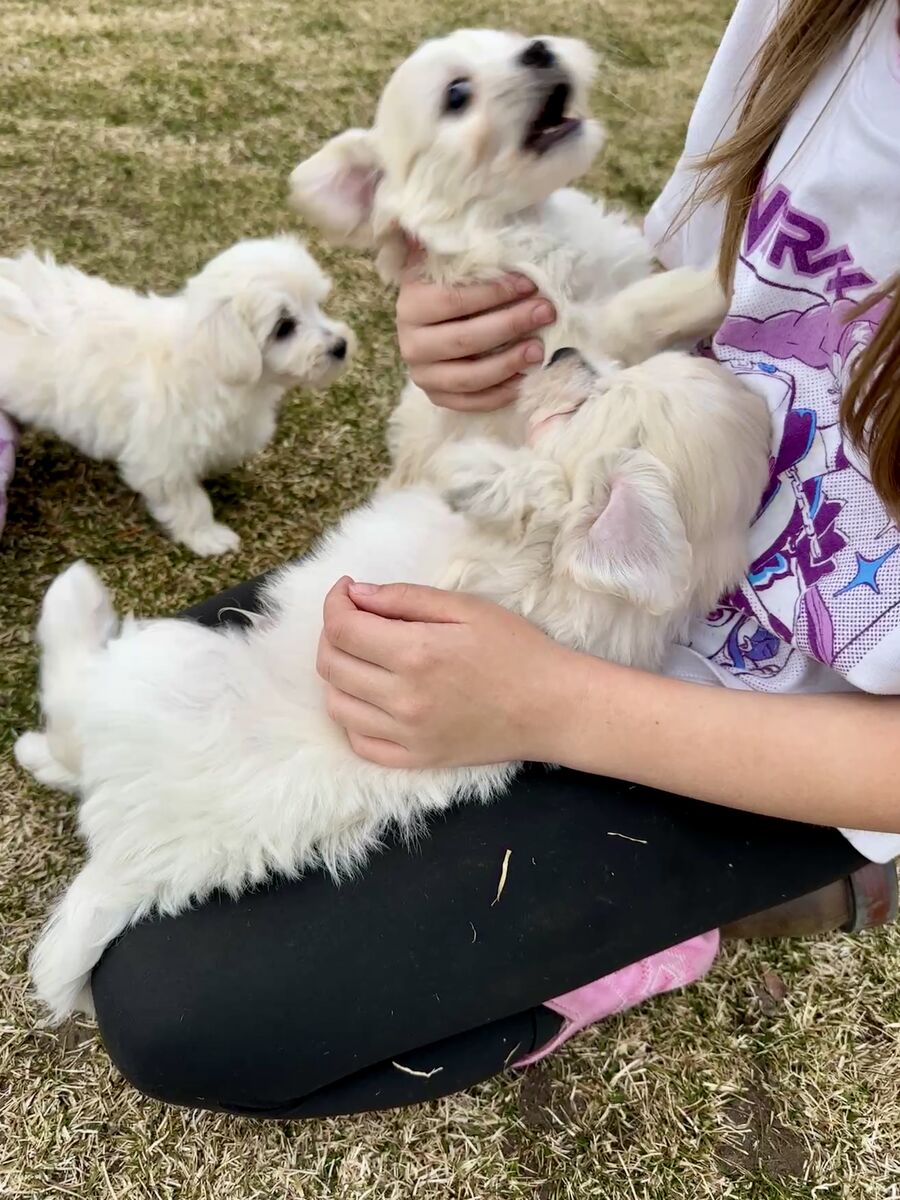 Breeding: White AKC Maltese Dad (7 lbs) x Maltipoo Mom (9 lbs). Parents pictured at end of roll. *Cuddly *Loving *Smart