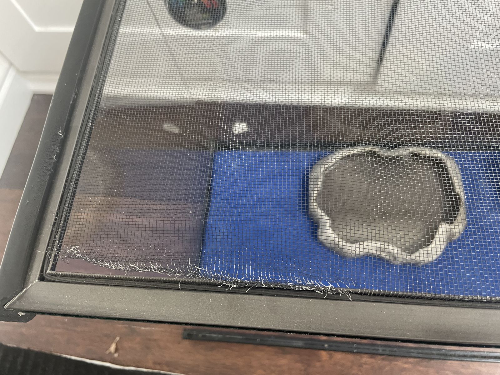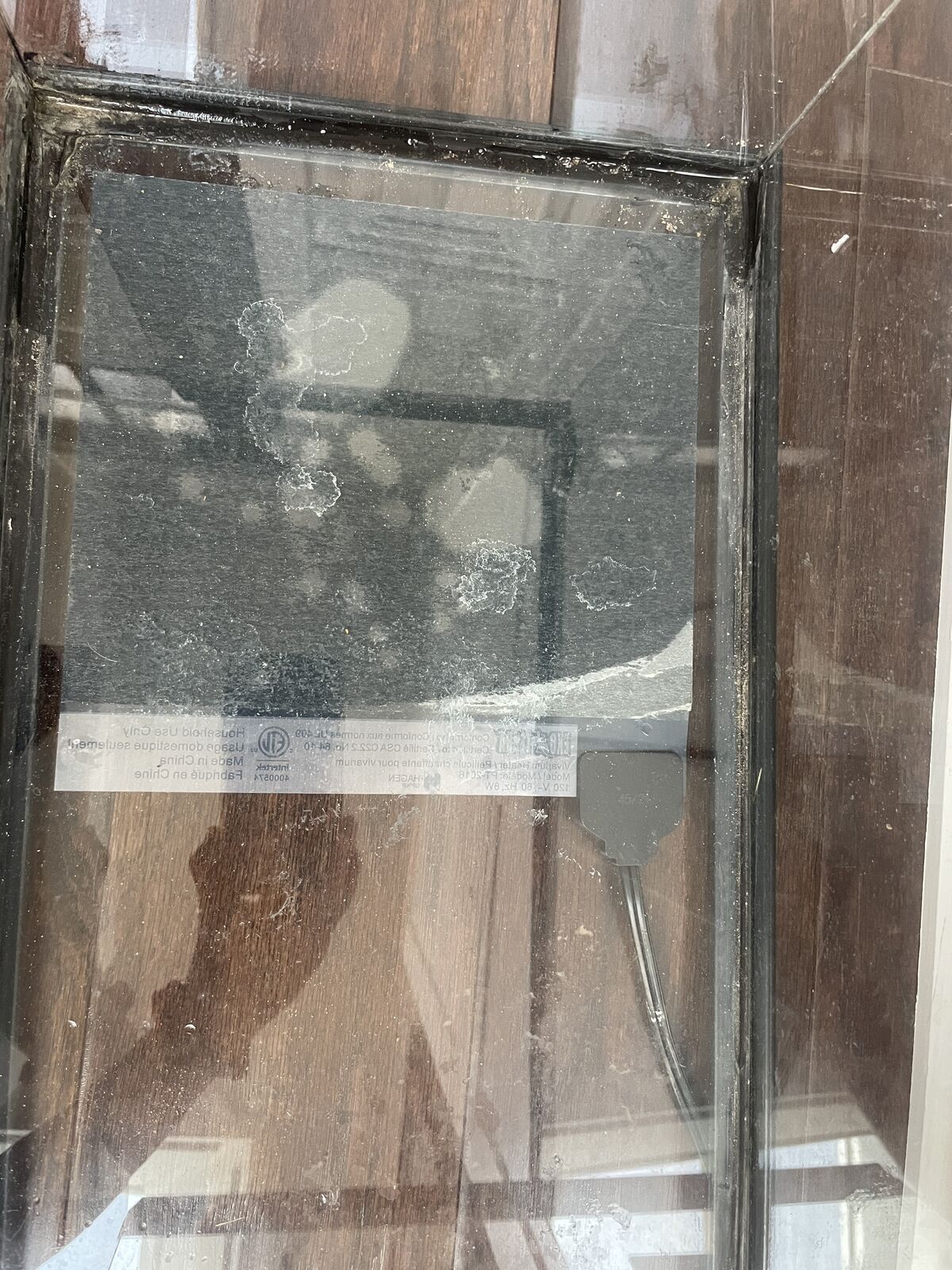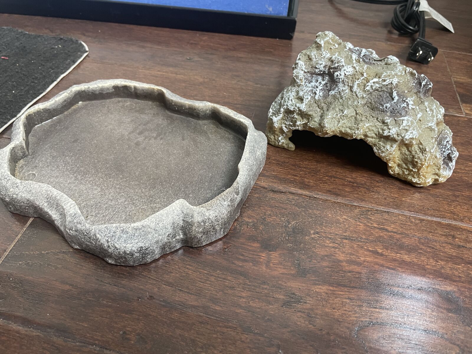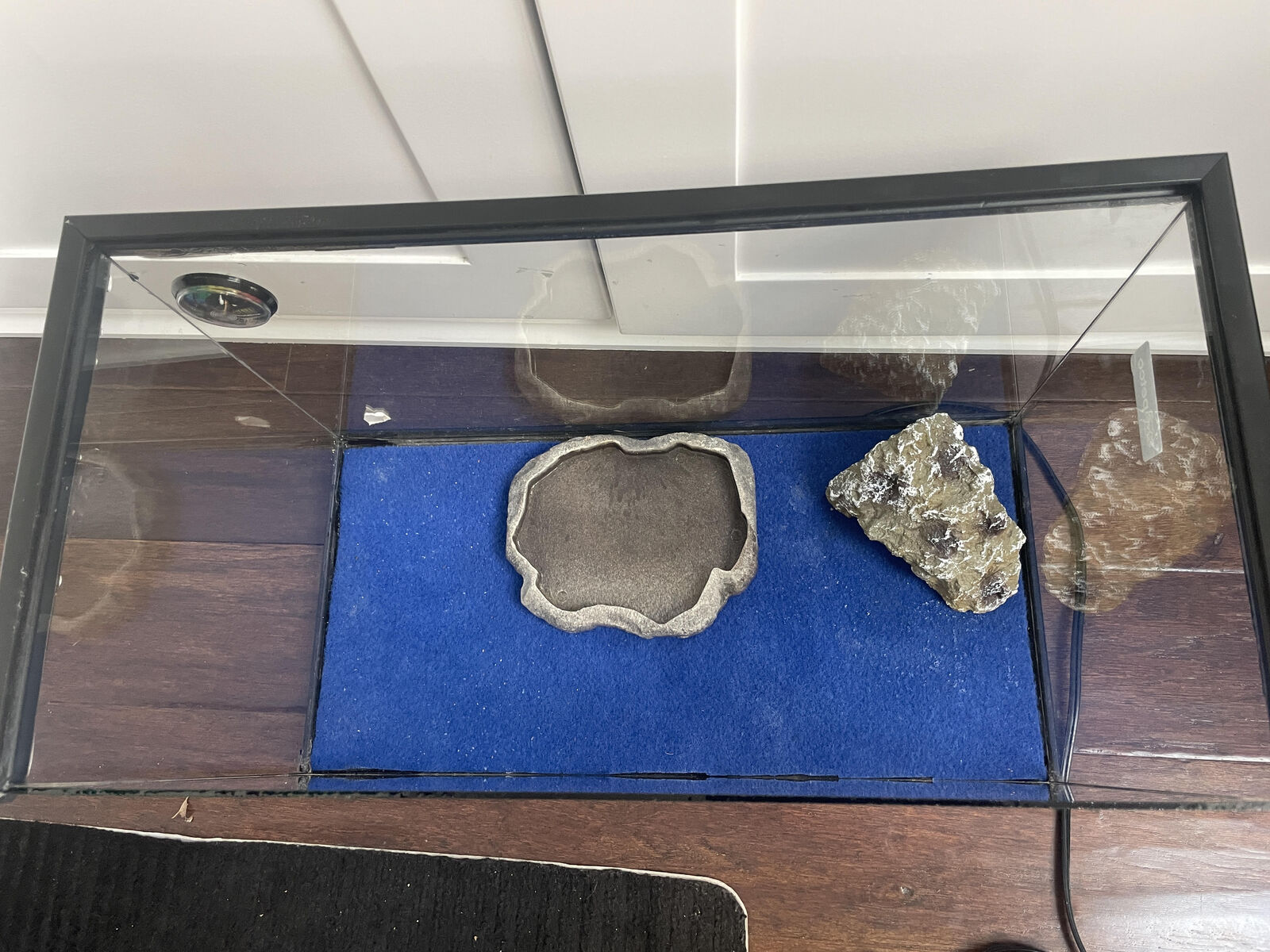 Venmo10 gallon tank that includes a temp. gauge, a hide, water or food dish and a heater for the bottom. The screen has pulled away a little on one corner. Measures about 20X12X10.
