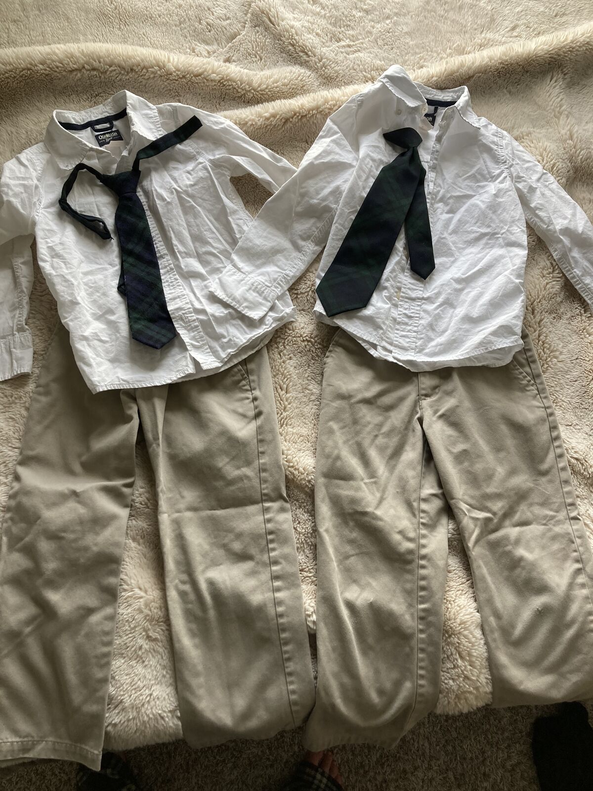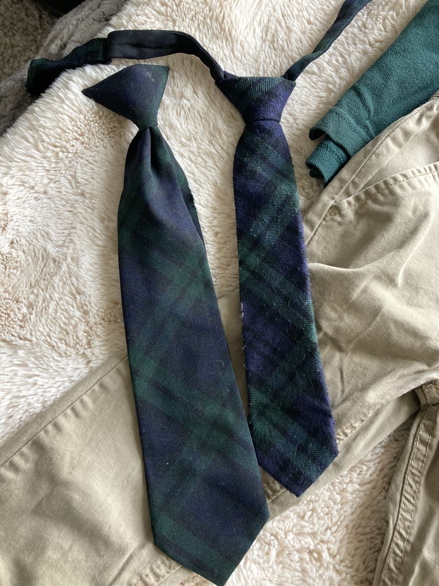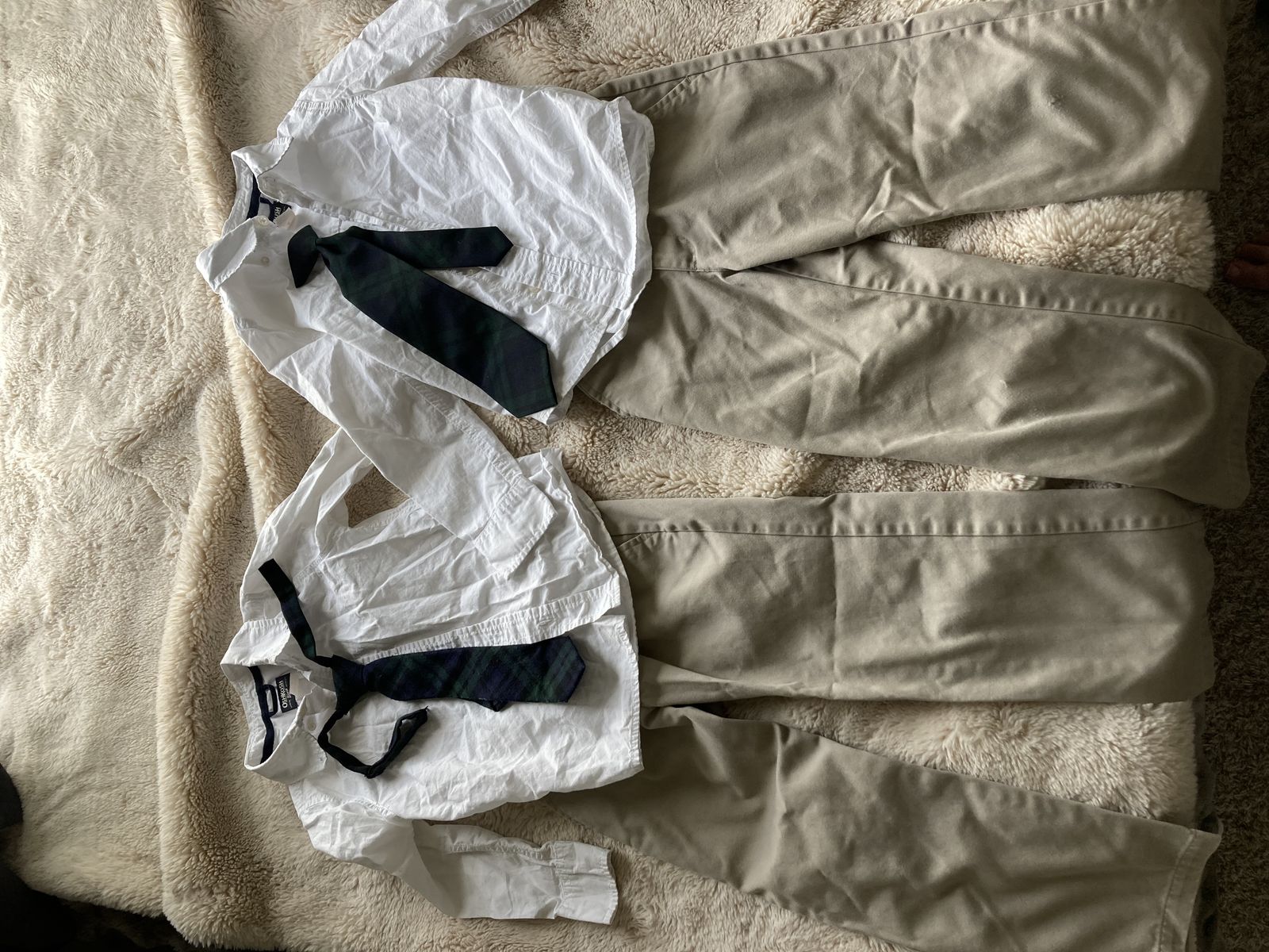 Sold as a set: Two ties (from Lands End & the school) One navy blue turtleneck shirt 3 khaki pants 1 navy blue shorts 1 green sweatshirt plus embroidered logo 2 school polos plus embroidered logo 2 white long sleeved dress shirts