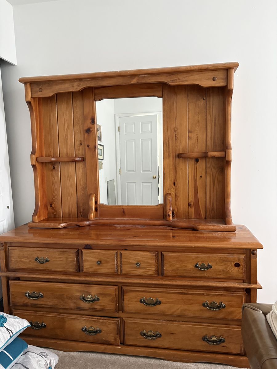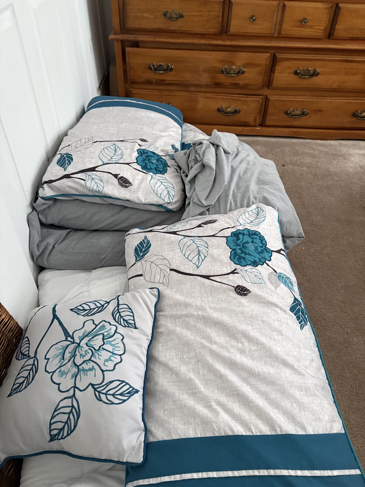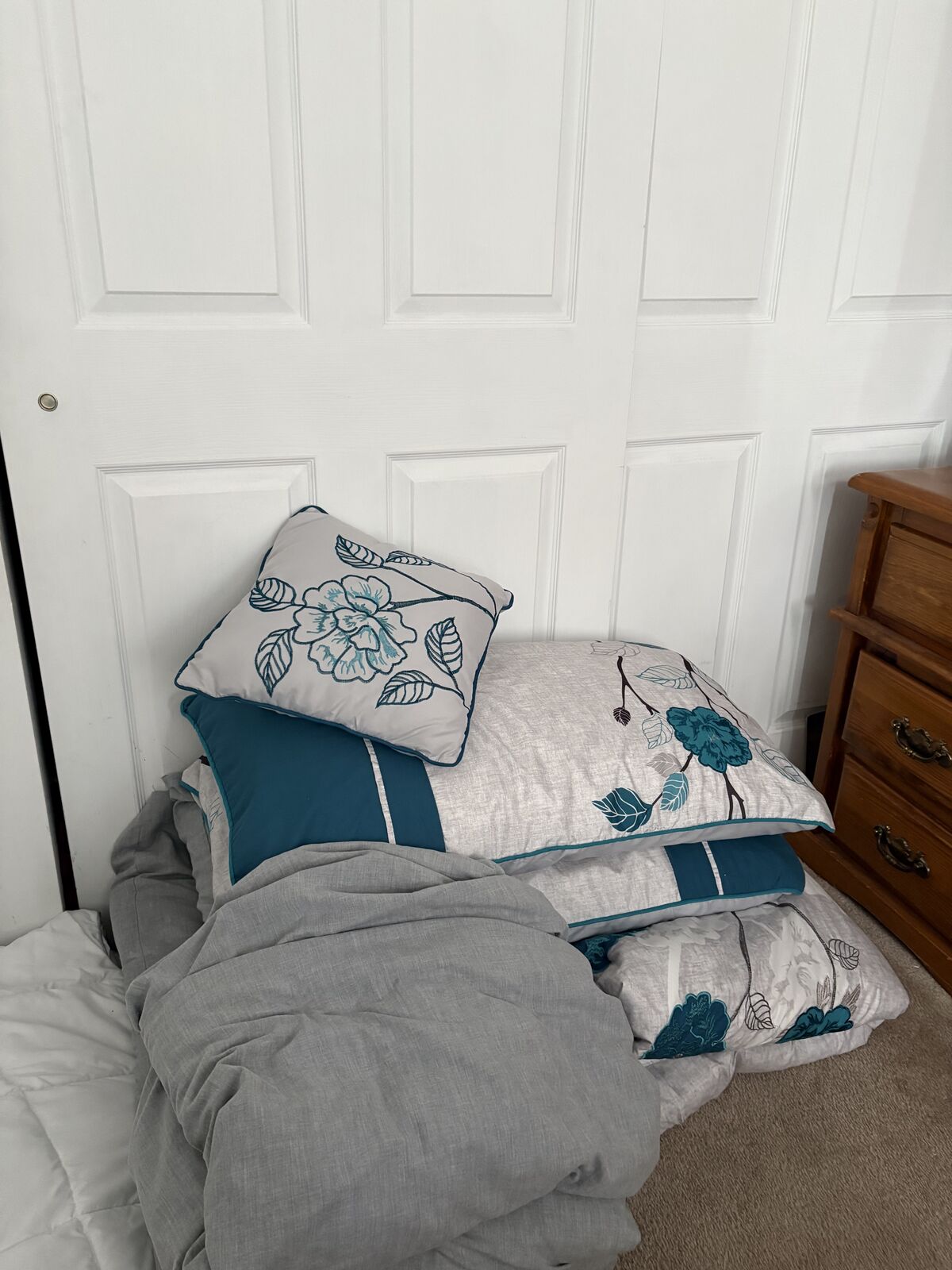 My mother-in-law is giving away this whole bedroom. California king bed, frame, mattress, nightstand, vanity and pillows. All for free! All in very good shape.