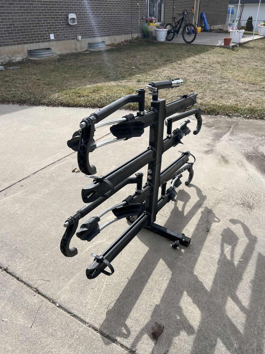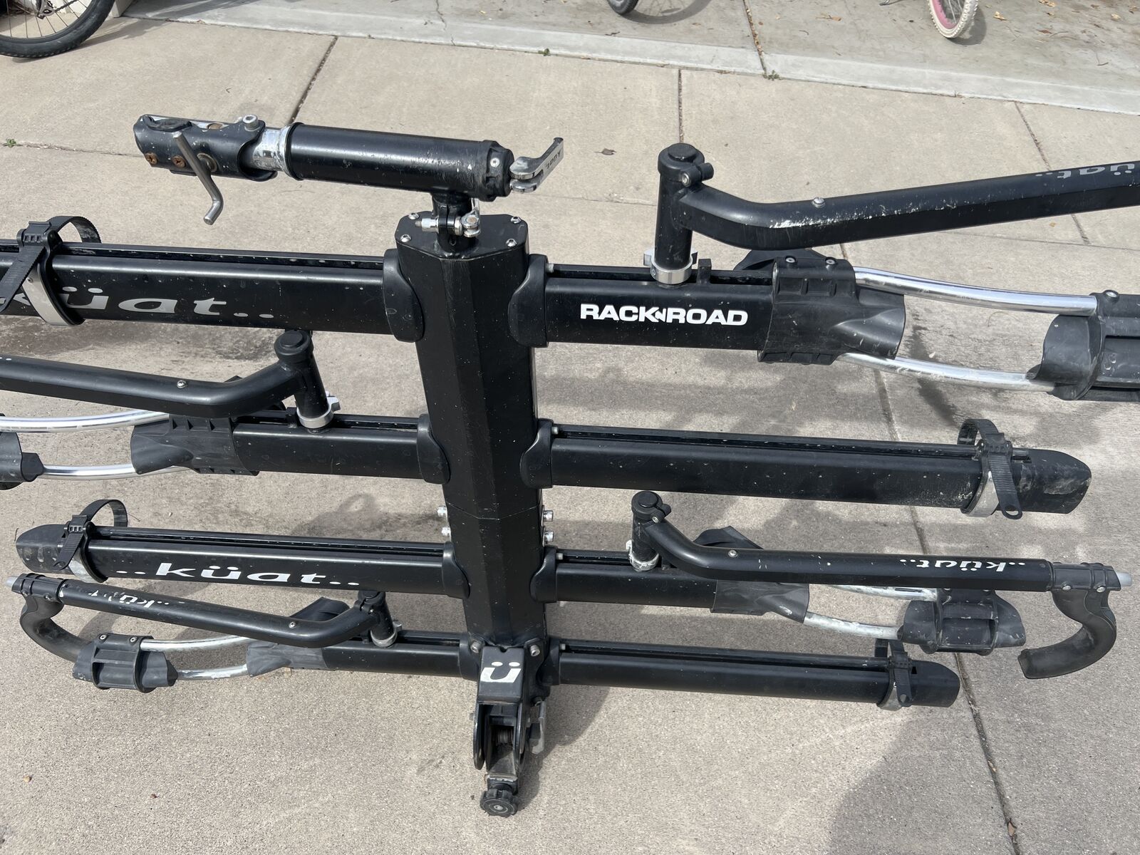 VenmoUsed four place Kuat bike rack. It fits a 2” receiver hitch, has a hitch lock, and bike locks.