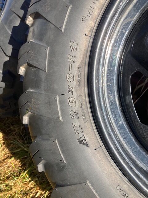 Maxxis 26x8x14 and 26x10x14 fronts and rears. Tires have about 500 miles on them. Lots of miles left. No holes, pathces, or plugs.