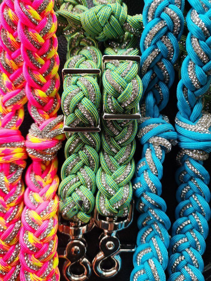 have 3 bling barrel reins left. These were the first pairs made so they are marked down for minor cosmetic blemishes. They are nice and heavy, have a good weight to them but sadly are not able to be adjusted length wise. These were made in mind for the flashy cowgirl who wants to have a little bit of bling at competitions. (wouldn't recommend everyday use)