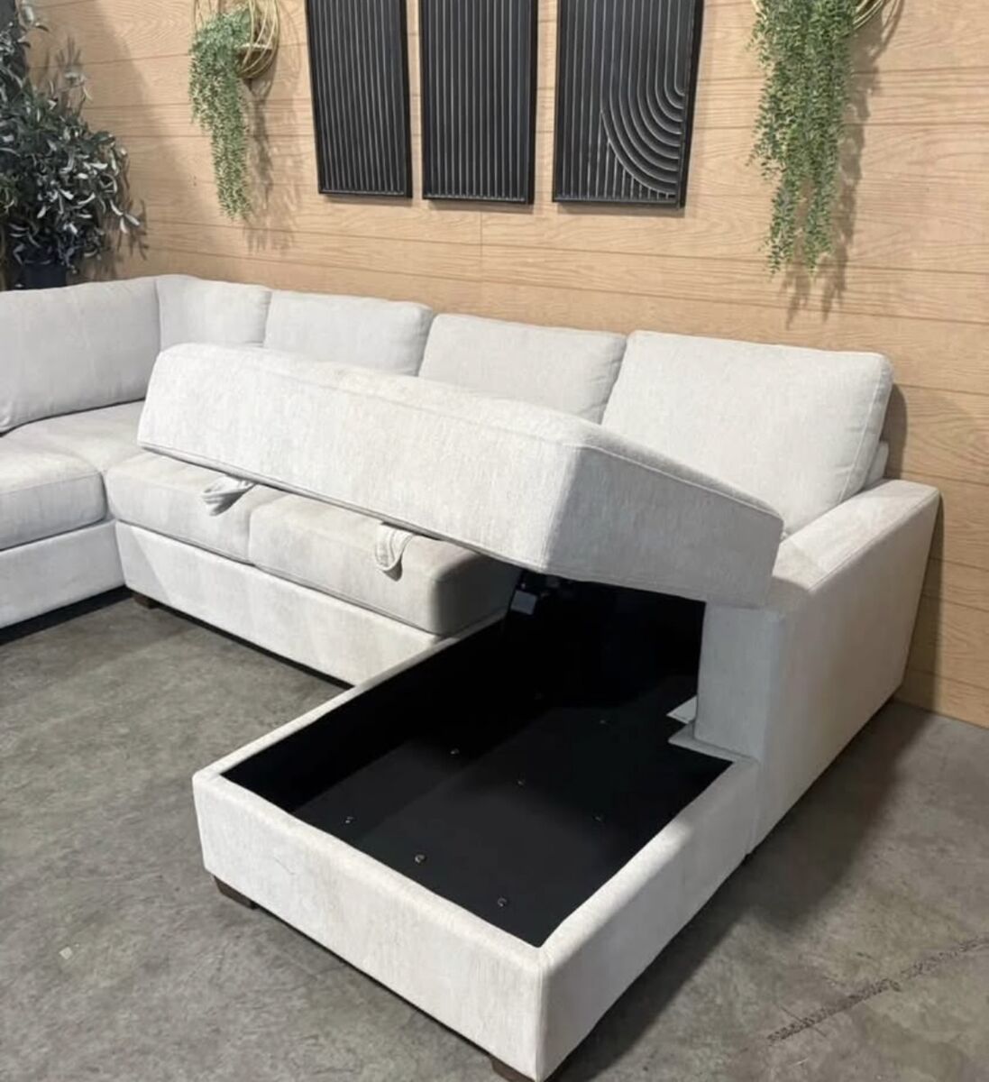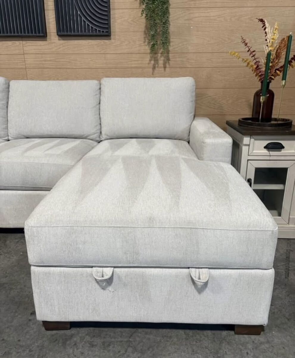 Features: Modern Style Track Arm Design Chaise has Storage with Generous Space Attached Seat Cushions – Firm Support Loose and Reversible Back Cushions
