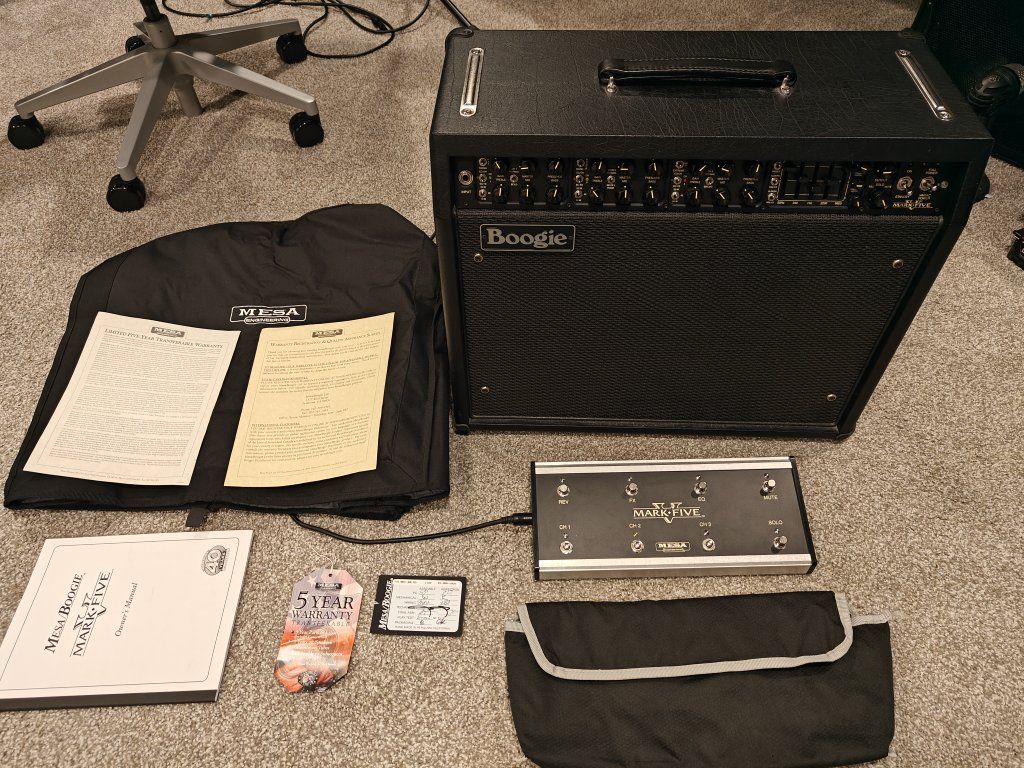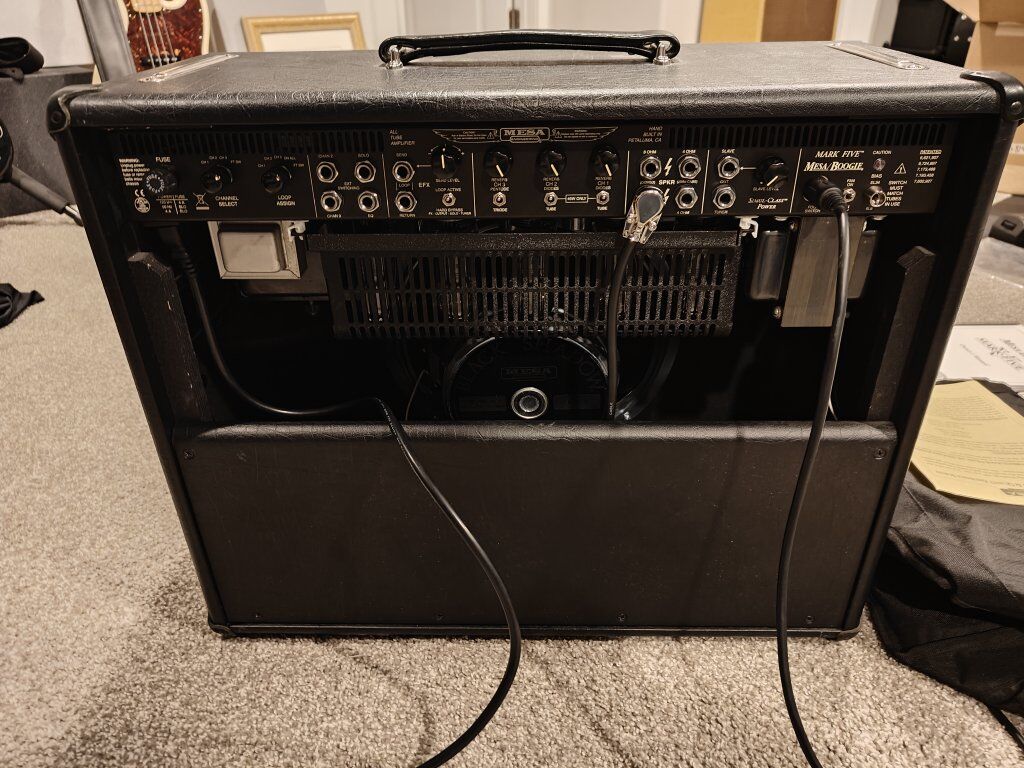 Mark V 90 watt combo in exceptional condition just back from the Mesa factory in Petaluma. Had a power issue in the low voltage section. I replaced the diodes (1 did test bad). Mesa repaired/jumpered a few bad traces on the board. I will provide the invoice/tech notes upon request. This is a rare opportunity to get a Mark V that has just been gone through by an actual Mesa employee.