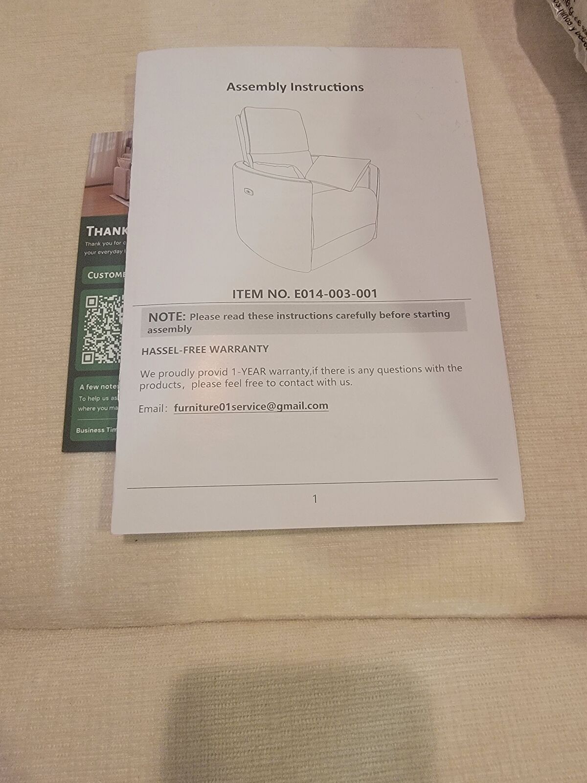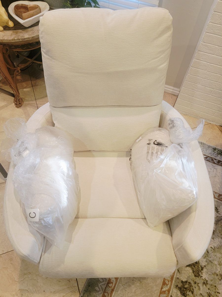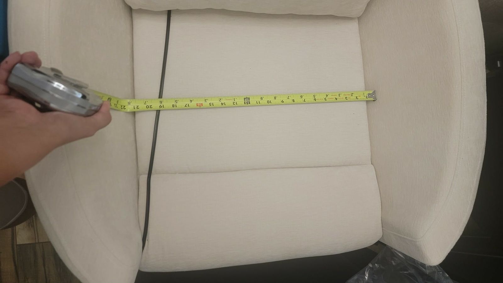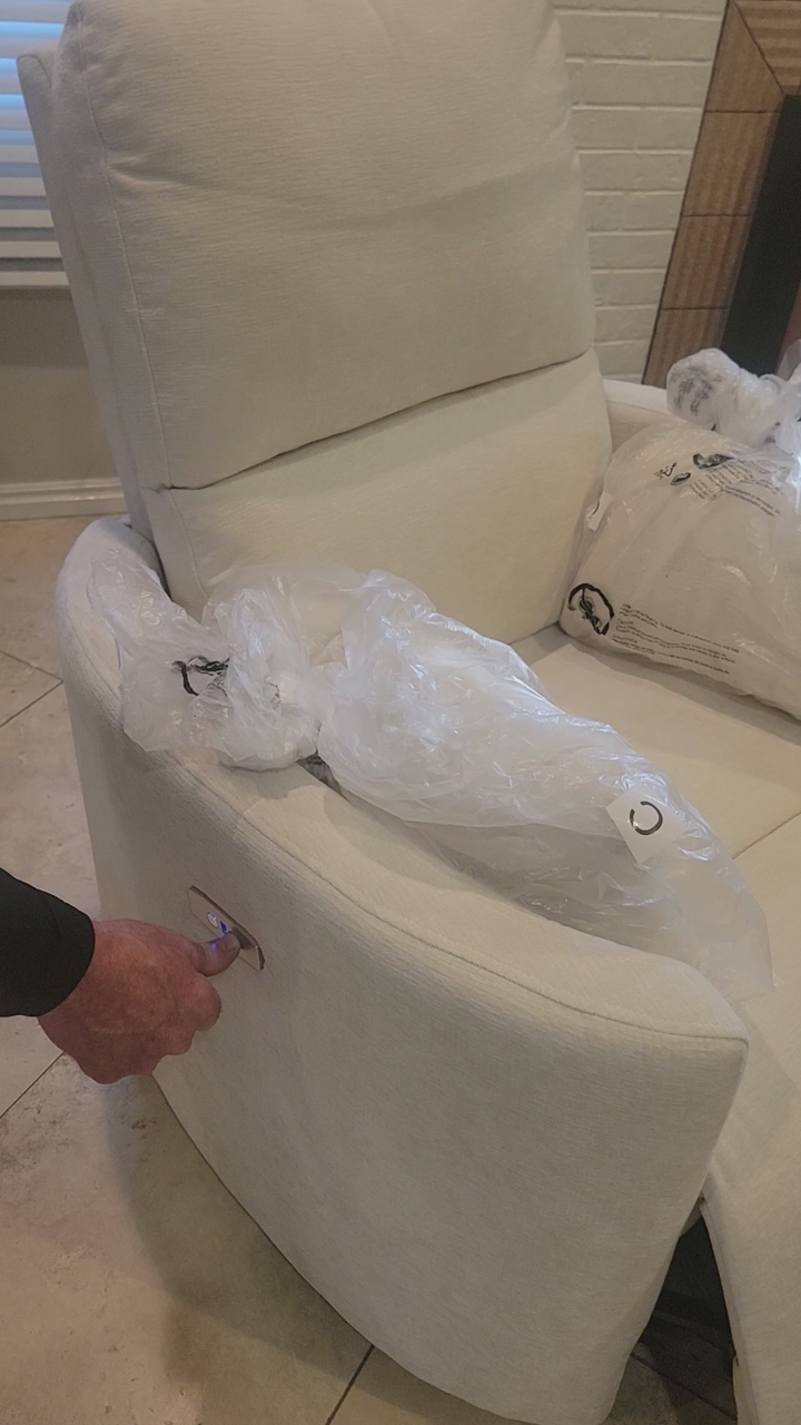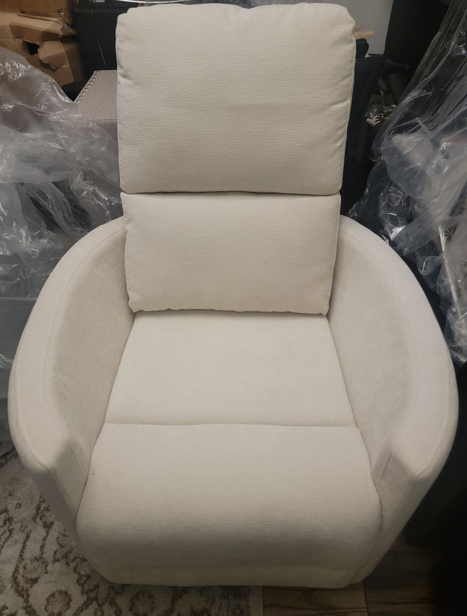 New Assembled Modern Cotton Chenille Fabric Power Recliner Chair cream/ white color with USB Charger. No brand name. 37"Lx32.5Wx40"H. Inside seat is 21"W. Floor to seat 18". Stationary. No swivel or rocking.