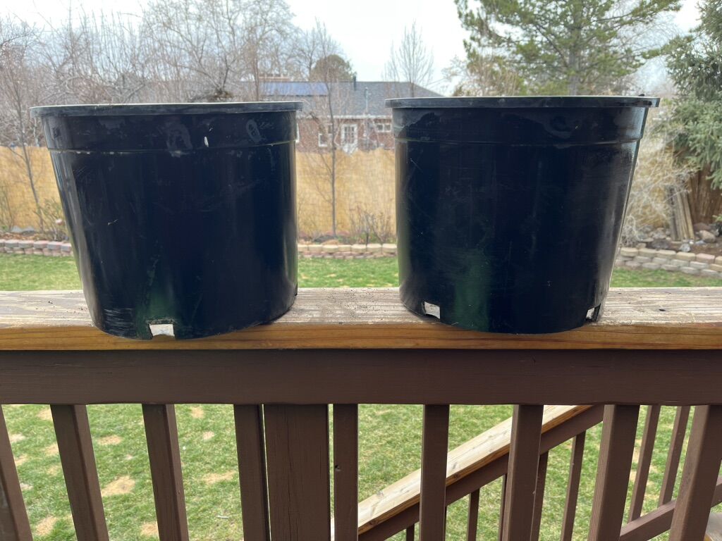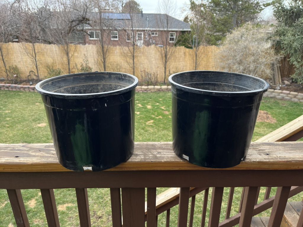 2 Black plastic pots with drainage holes on the bottom . Approximately 12” width 10” depth . $6.00 for both .
