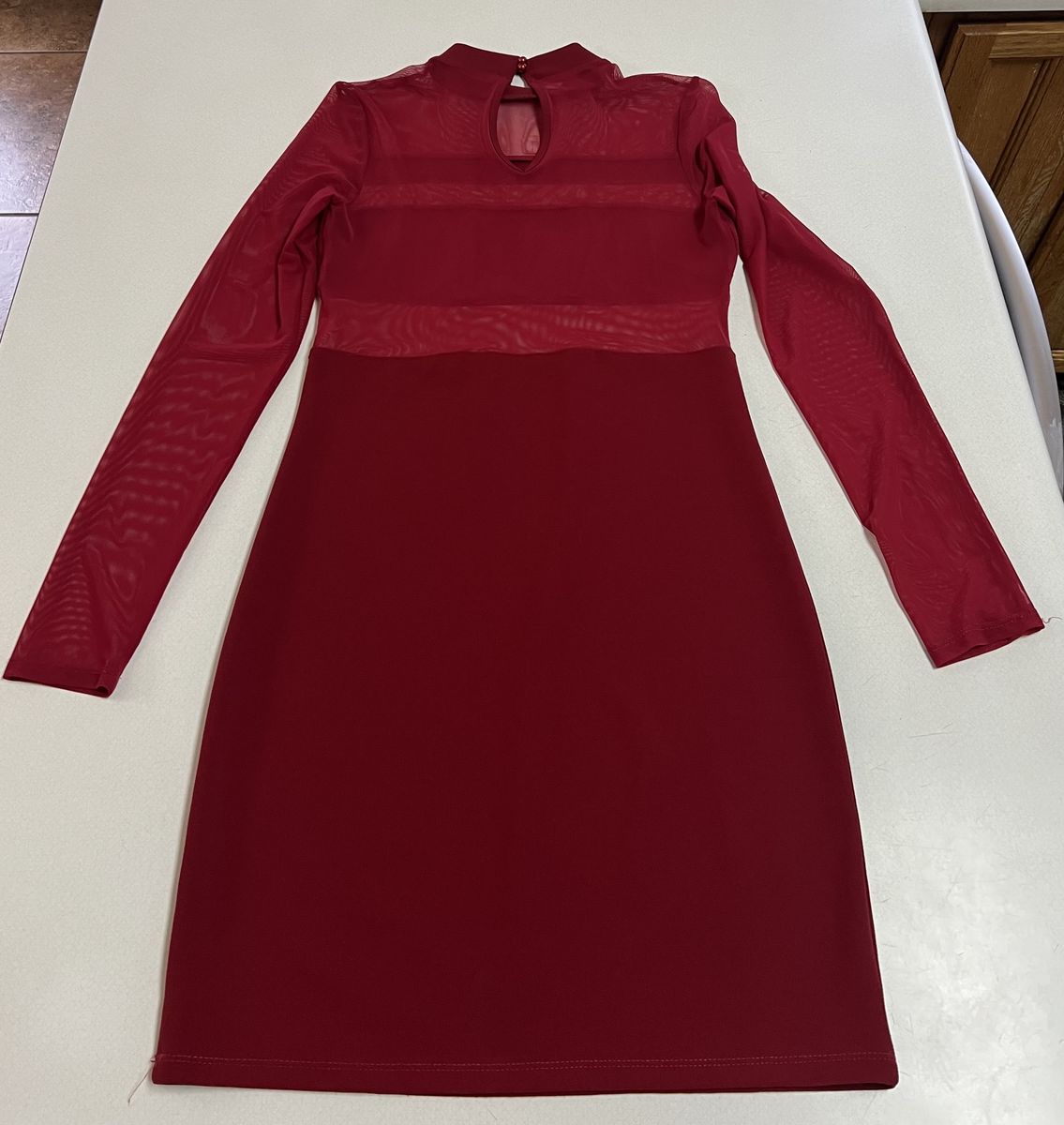 VenmoChic deep red dress. Has sheer long sleeves and sheer panels on bodice. Mock neck with keyhole back. Bodycon style. Size M.
