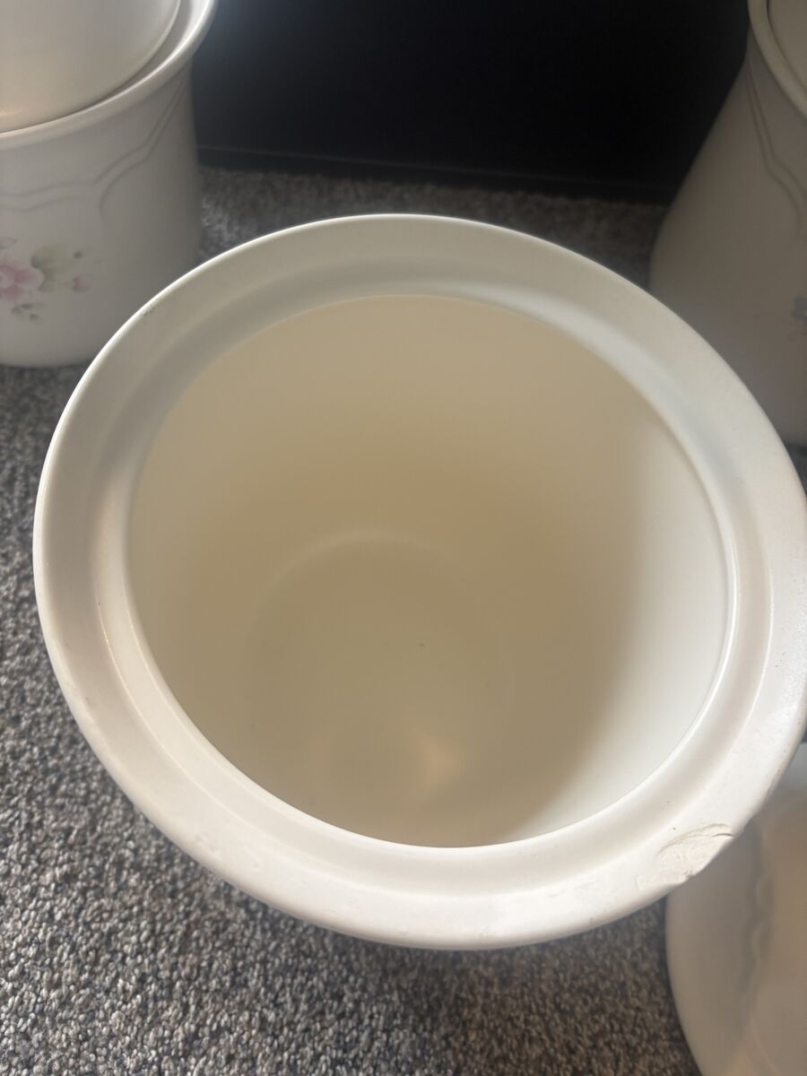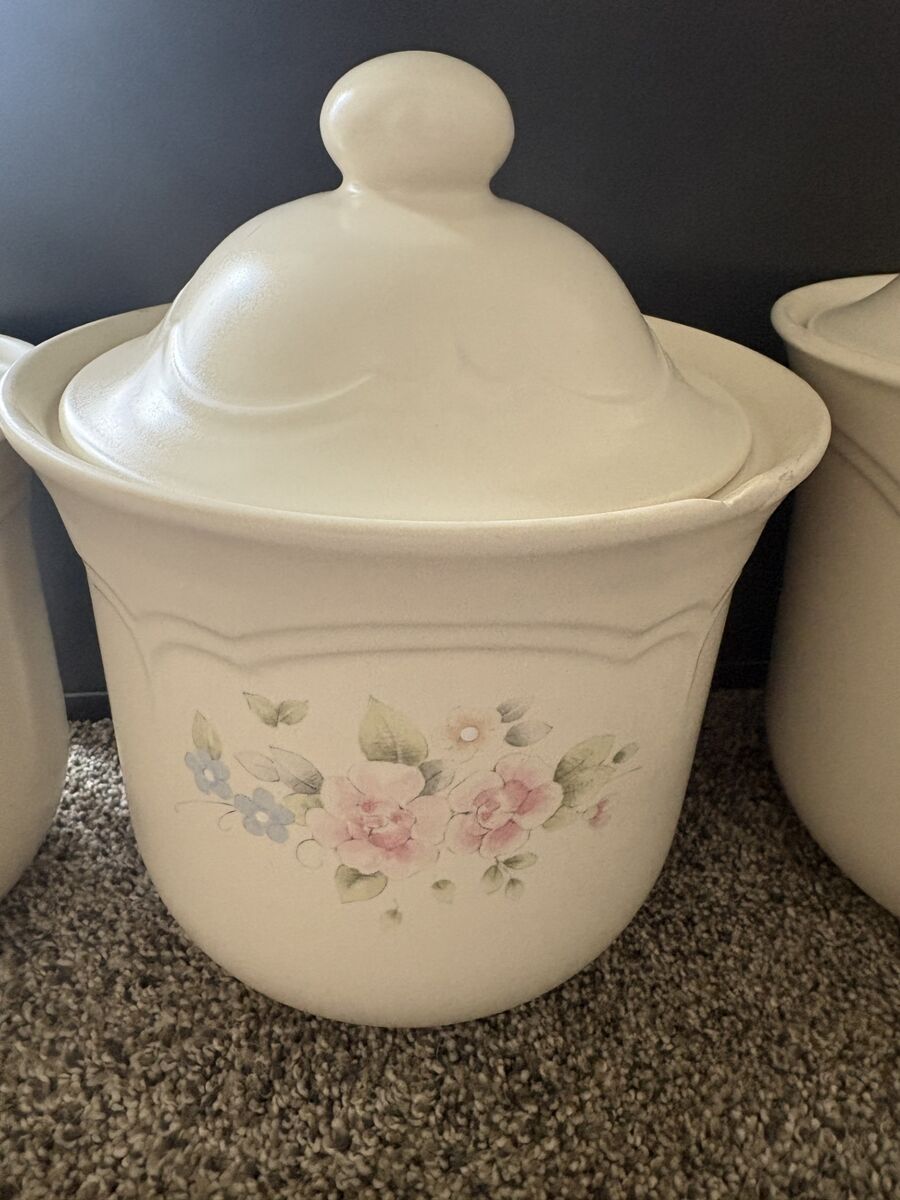 Beautiful 4-piece Tea Rose Pfaltzgraff canister set in gently used condition. This classic floral pattern adds a charming, timeless touch to any kitchen décor.