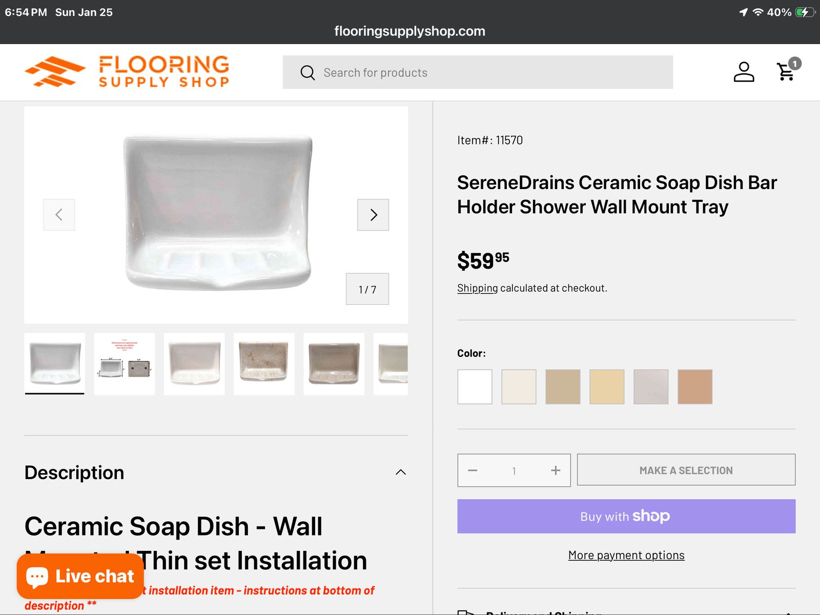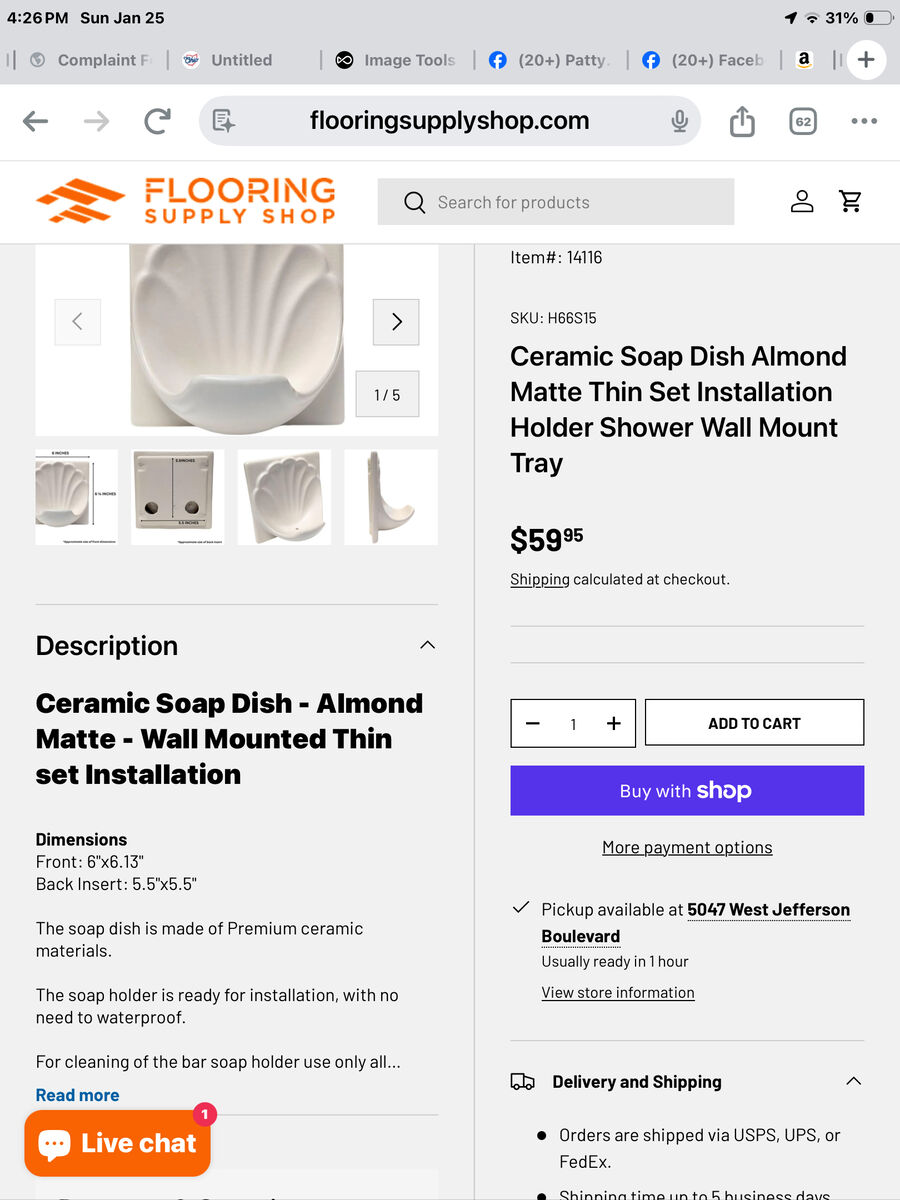 I have a variety of ceramic soap dishes and corner shelves for use in tile tub and shower surrounds. You can find these on the internet for up to $69 each. I’m selling for $12 each. Buy 5 or more for $10 each or buy them all for $650. Retail price would be well over $6,000 plus shipping.