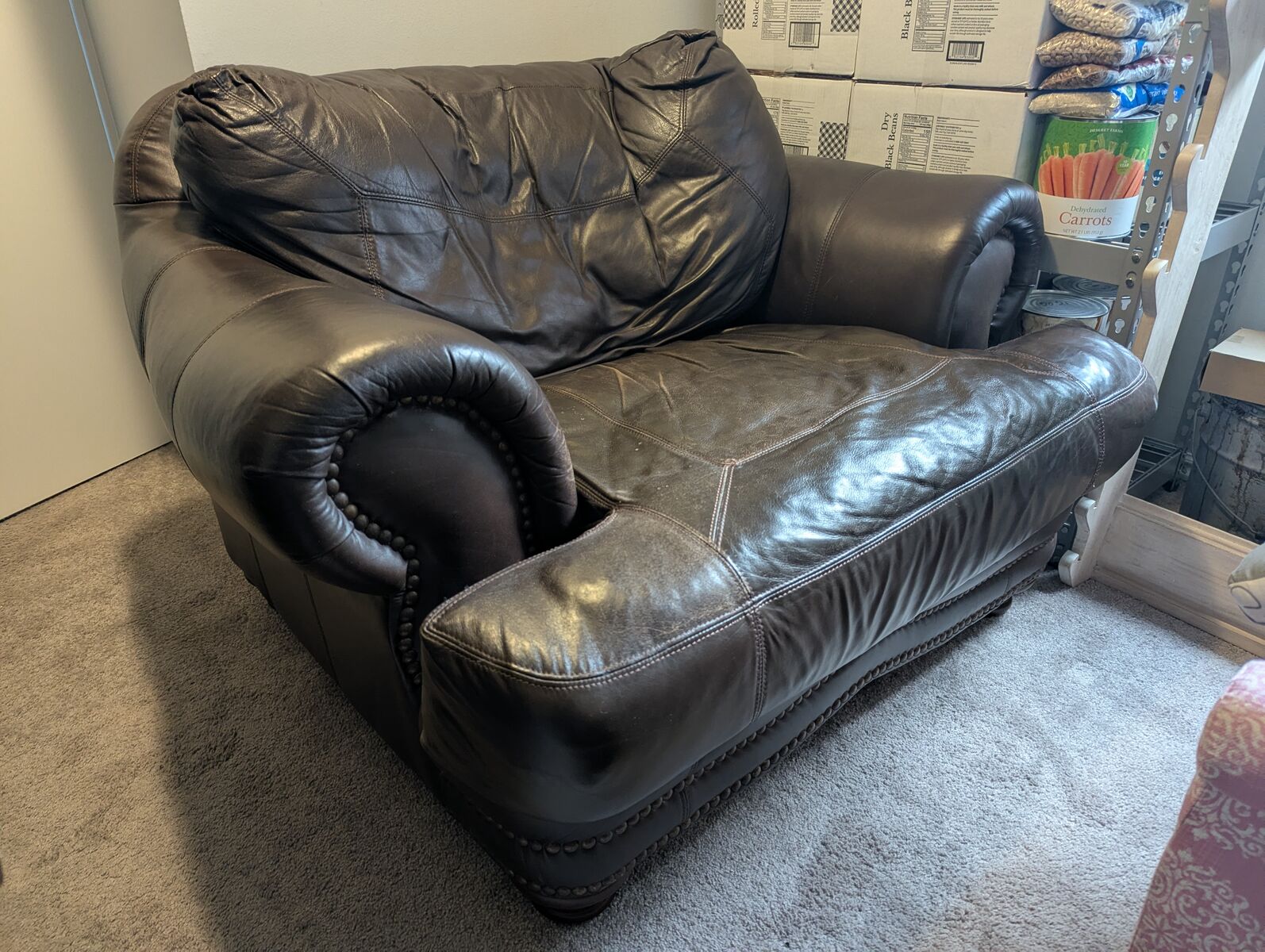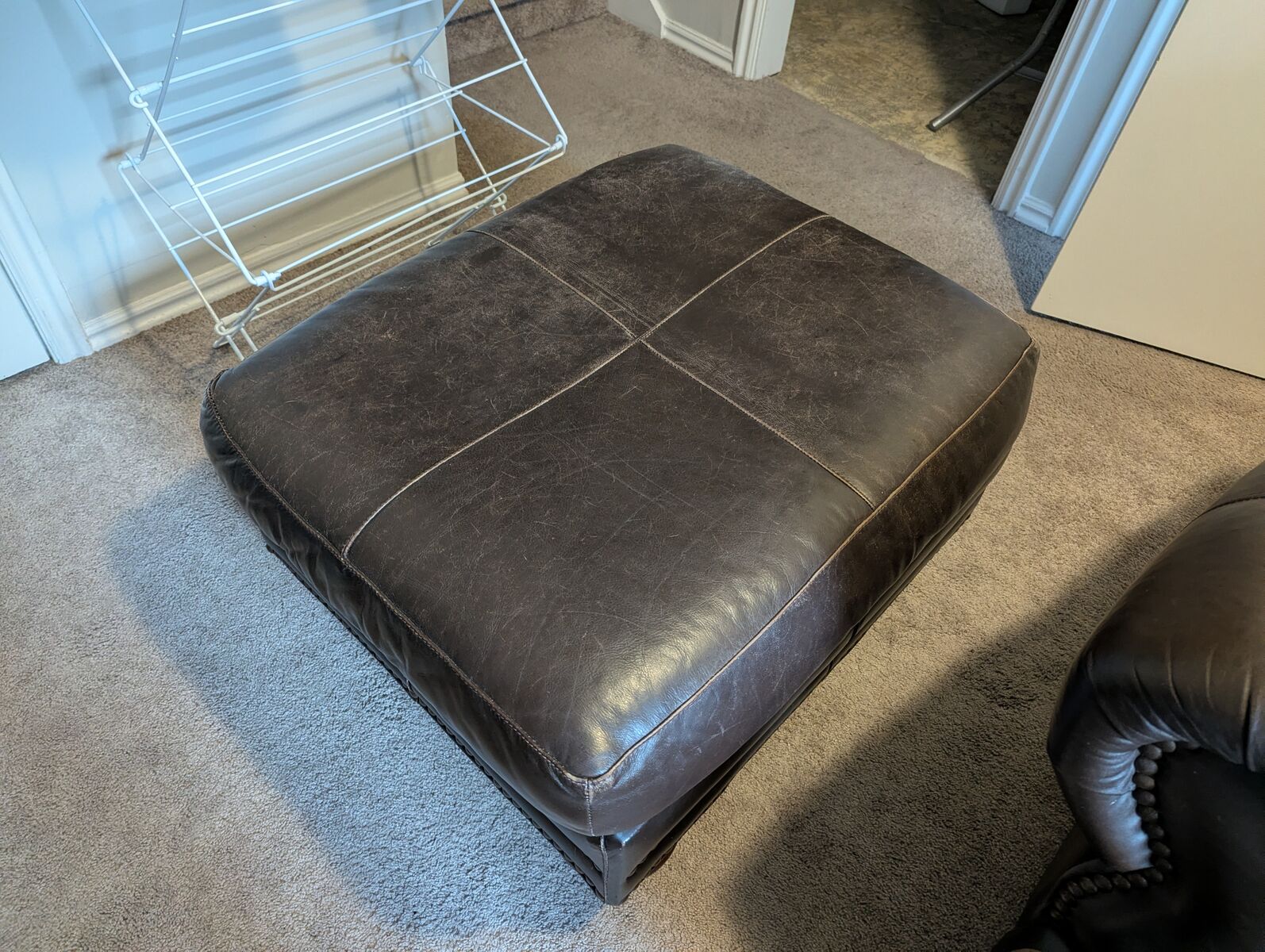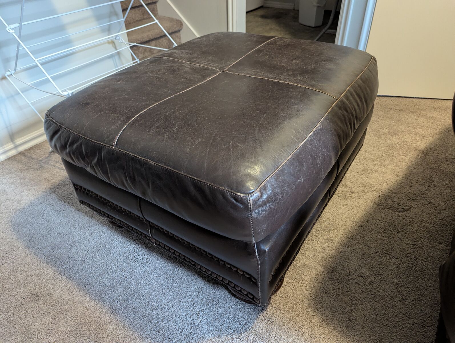 Brown leather oversize chair with ottoman. Reasonable condition. No tears or holes.