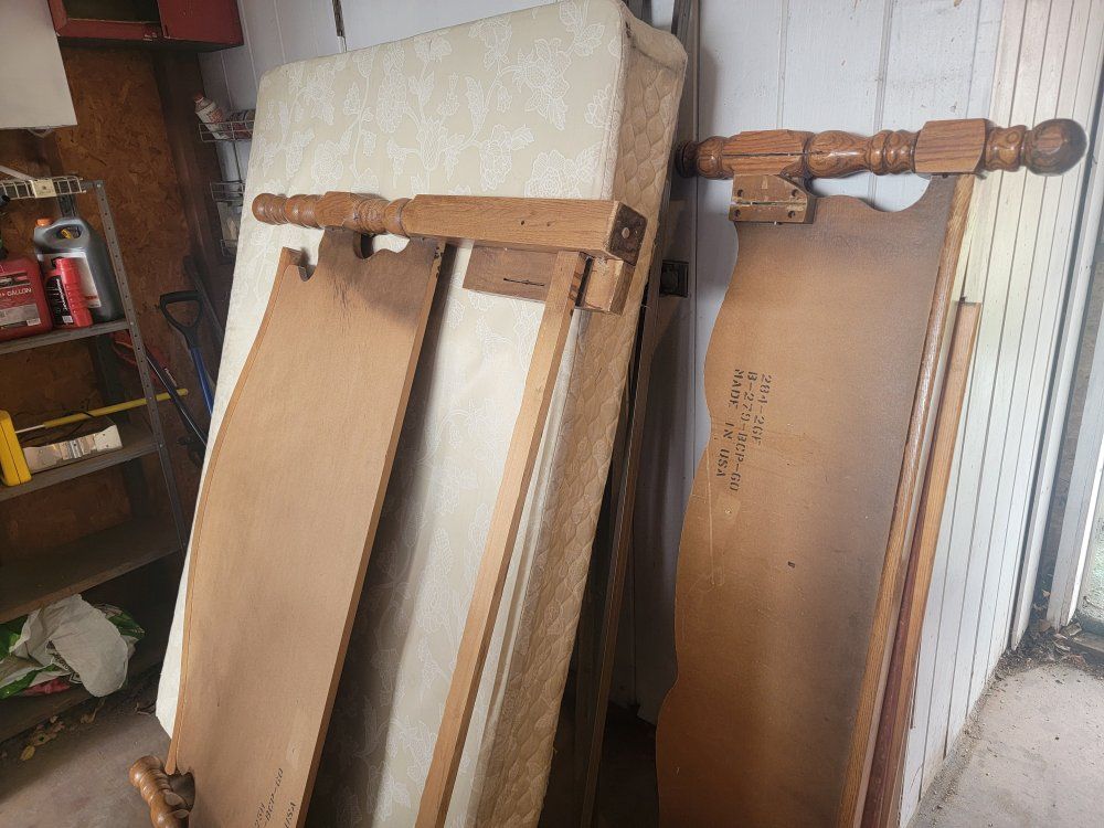 Full Bed Frame Plus Box Spring (No Mattress) Is Heavy wood Head and Foot boards with large wooden slats (4) and metal side frame that attach to the head and footboard by clicking in. AS IS Free