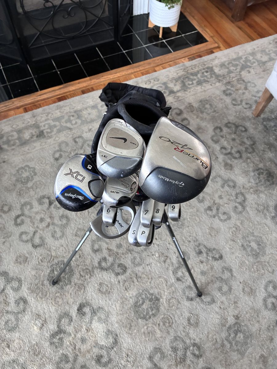 VenmoVery nice starter to intermediate set of men’s standard length golf clubs for sale. See pictures for comparable eBay sold pricing. Set includes Taylormade titanium 9.5 driver, Nike 3 wood, MacGregor 5 wood, Cobra 4 hybrid, Callaway Strata-5 hybrid and 6-pw +Sw stainless steel cavity back irons, Nike style mallet putter, nice Ogio vapor lite stand carry golf bag, golf balls, tees, ball markers etc. Set has everything you need to play some golf. Message or text Sam if interested.