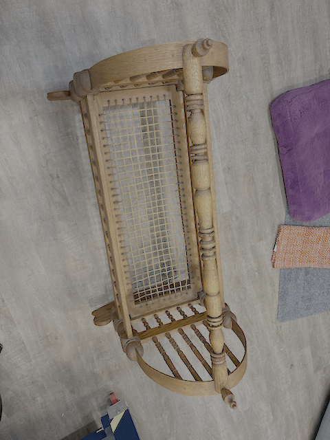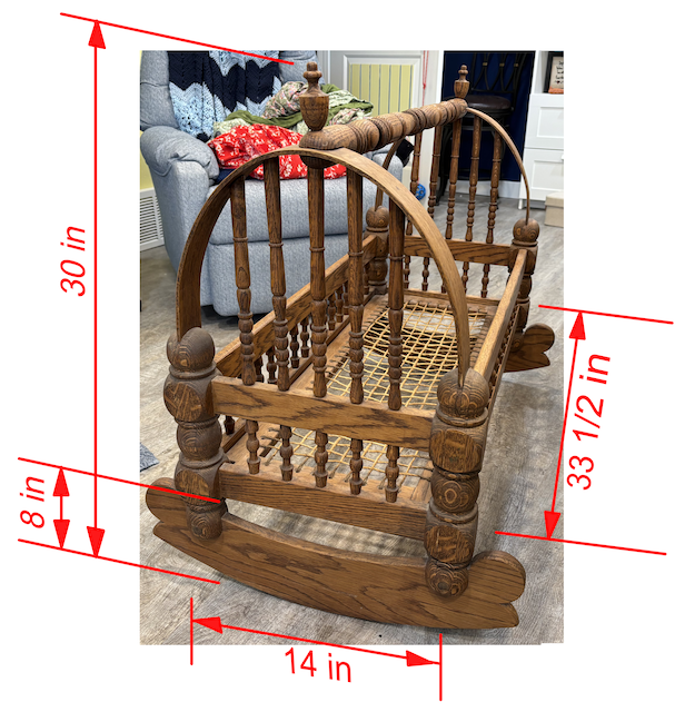 ApplePayHand crafted wooden doll cradle. All parts in excellent condition. Used as a display for professional artist for years. Bed area is 14 inches by 33 1/2 inches. Overall height is 30 inches. See image for dimensional details.