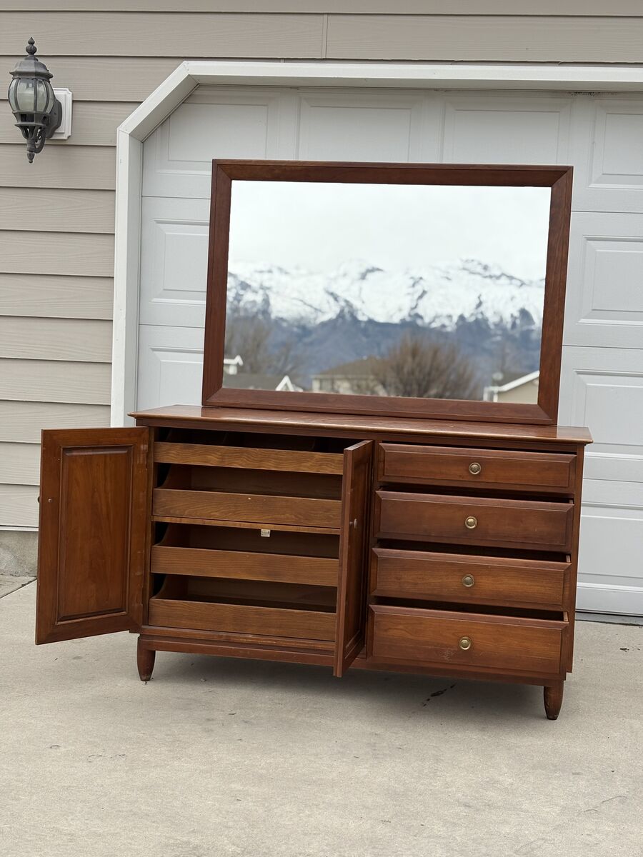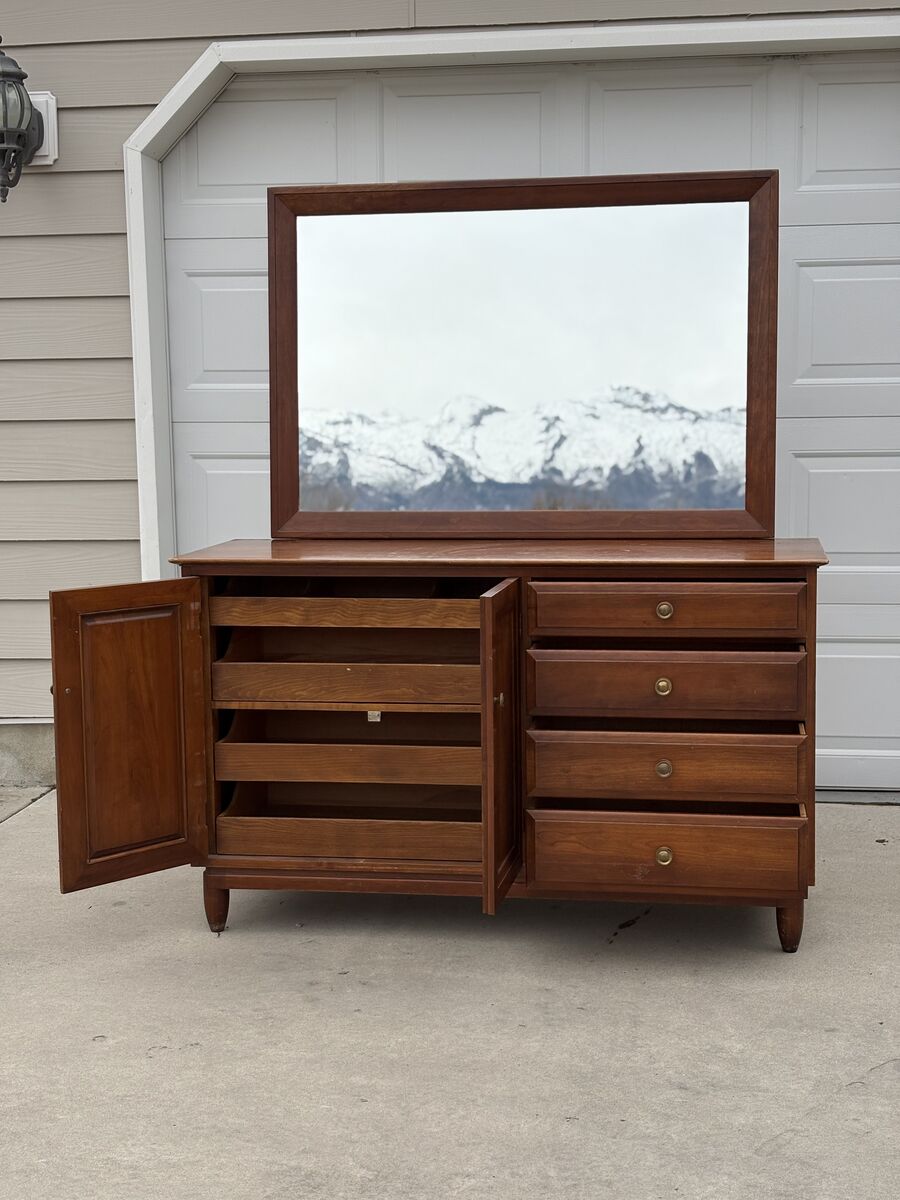 VenmoA Mid Century dresser by Willett Furniture, of Louisville, Kentucky, USA. Solid cherry with brass hardware. Features right side with four various size drawers of dovetail construction. Left side with dual doors revealing four more dovetail drawers, top one with fixed dividers. Made in the mid 20th Century.