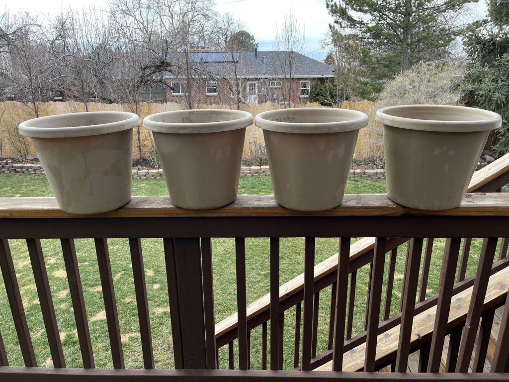 4 beige plastic pots for flowers or vegetables . Drainage holes on the bottom of each . All 4 for $20 . Approximately 14” width 12” depth
