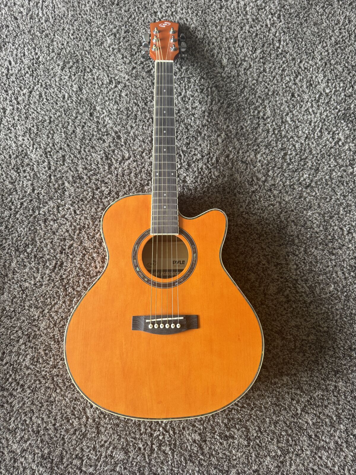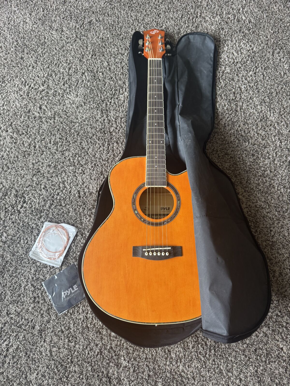 PYLE Acoustic Guitar Very lightly used acoustic guitar. Had no issues with it, just no longer desired to play. High E string needs to be restrung, otherwise no issues at all. Comes with shoulder strap, case, spare strings, and cleaning cloth.